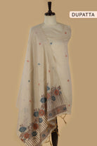 - The look is further elevated by a Chanderi blend woven dupatta, adorned with detailed borders, traditional patterns, and elegant tassels, adding depth and a refined finish.