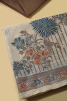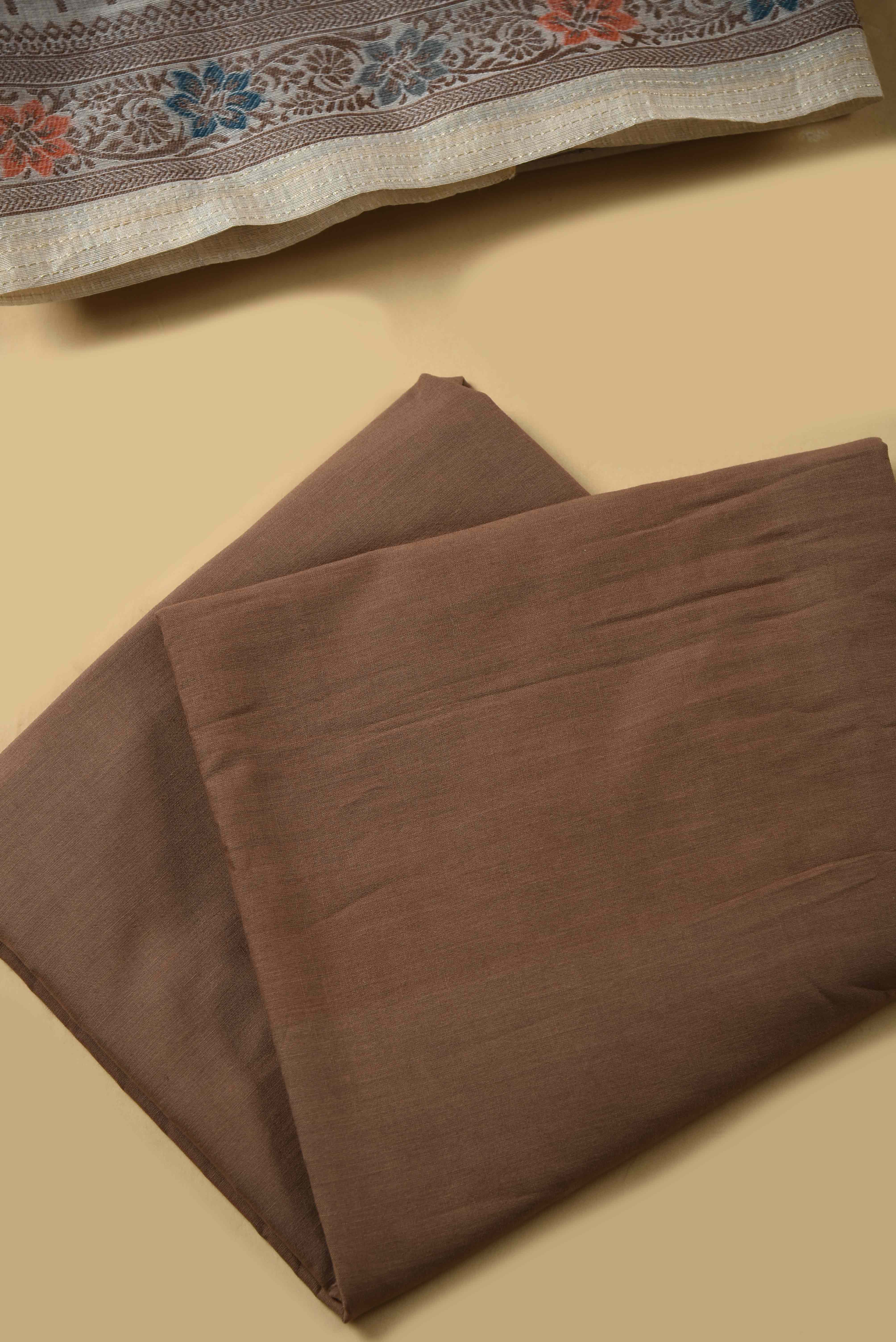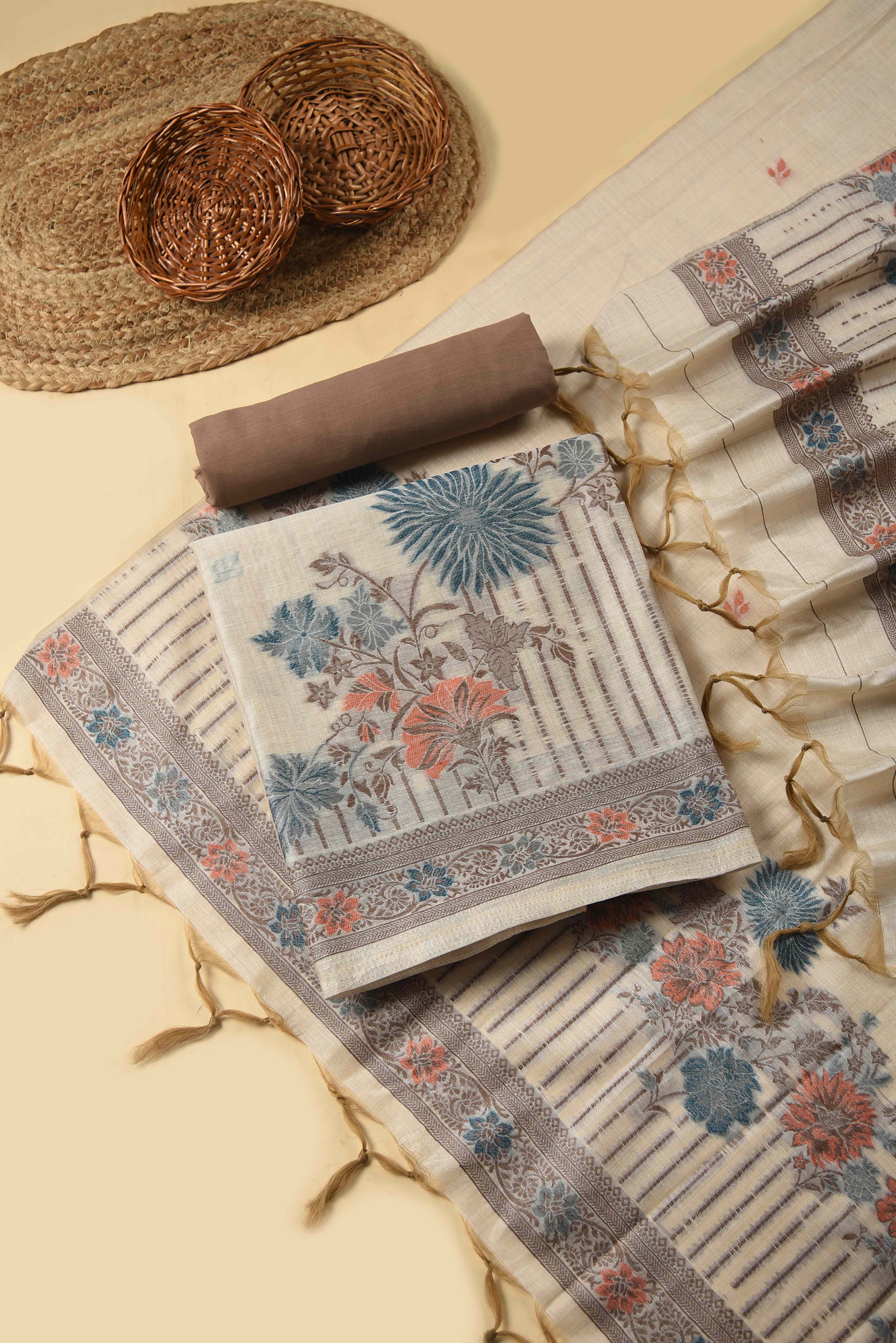 - Elevate your ethnic wardrobe with this graceful beige and brown Chanderi blend unstitched suit fabric set, designed to reflect understated elegance and timeless charm.
