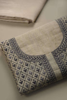 - Beige & Gray Chanderi Embroidered Unstitched Suit Fabric Set with Dupatta Subtle sophistication meets timeless elegance in this Beige with Gray Chanderi Embroidered Unstitched Suit Fabric Set, complete with a finely embroidered Chanderi Woven Dupatta.