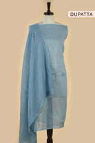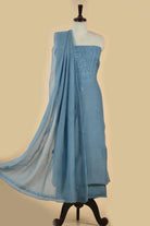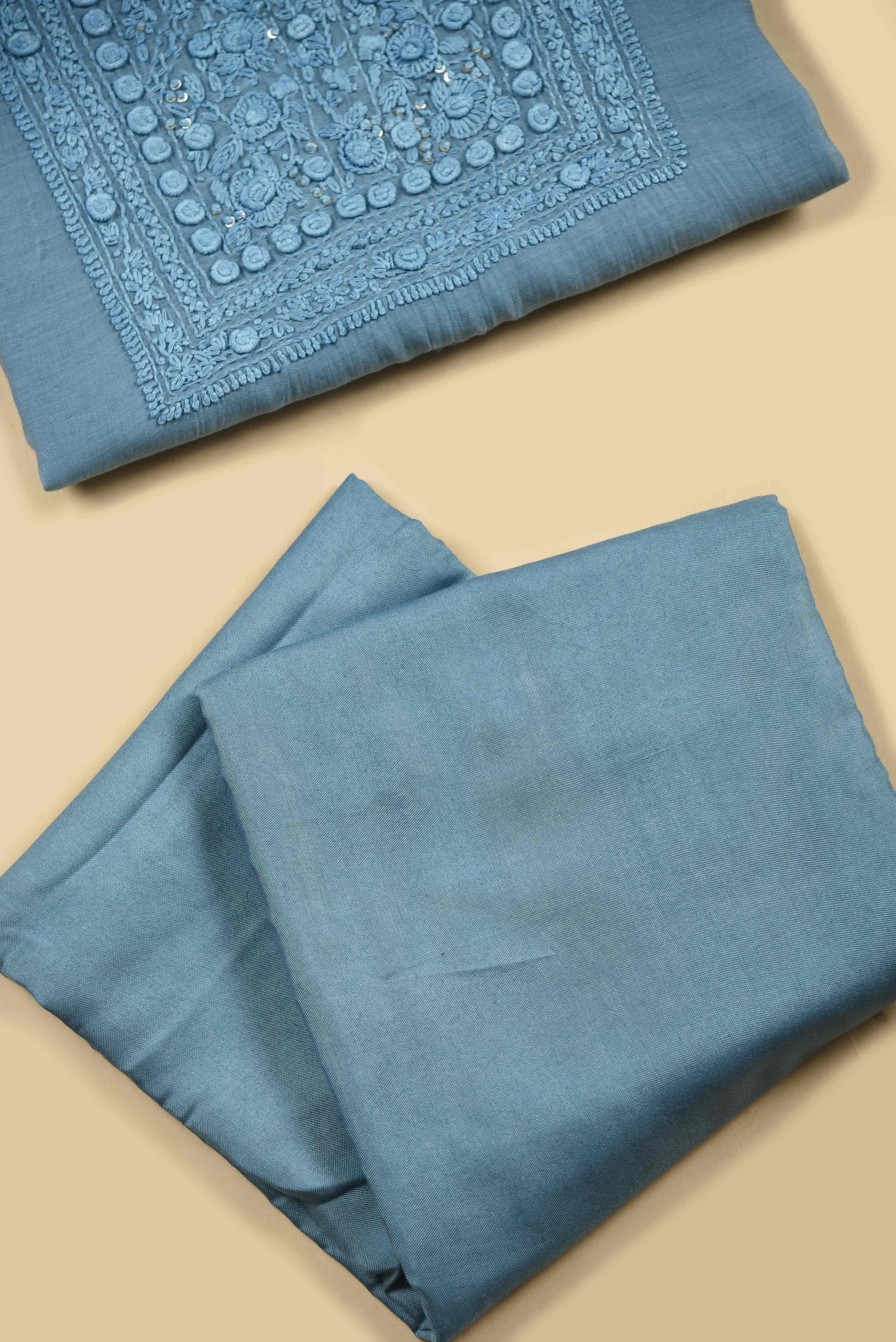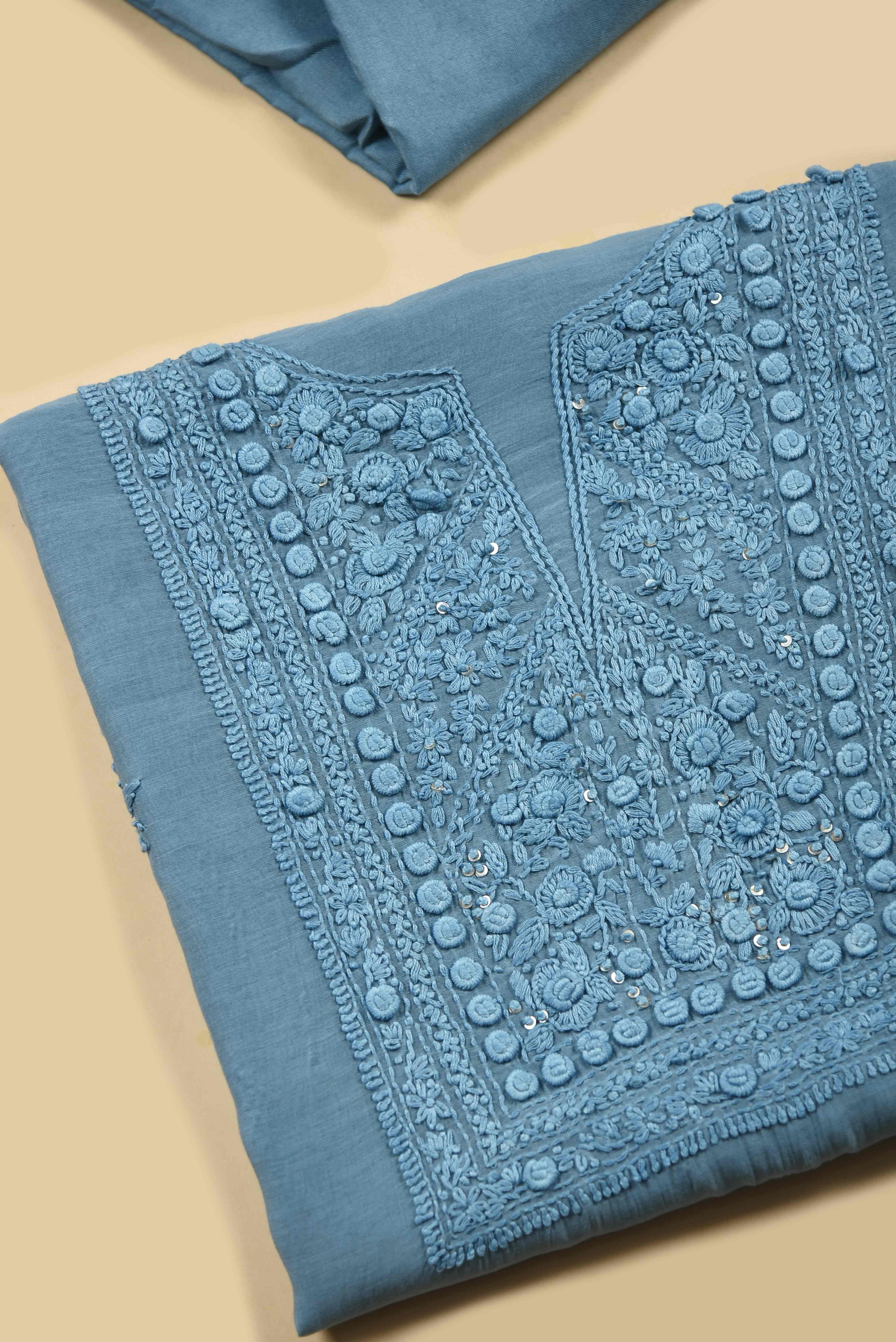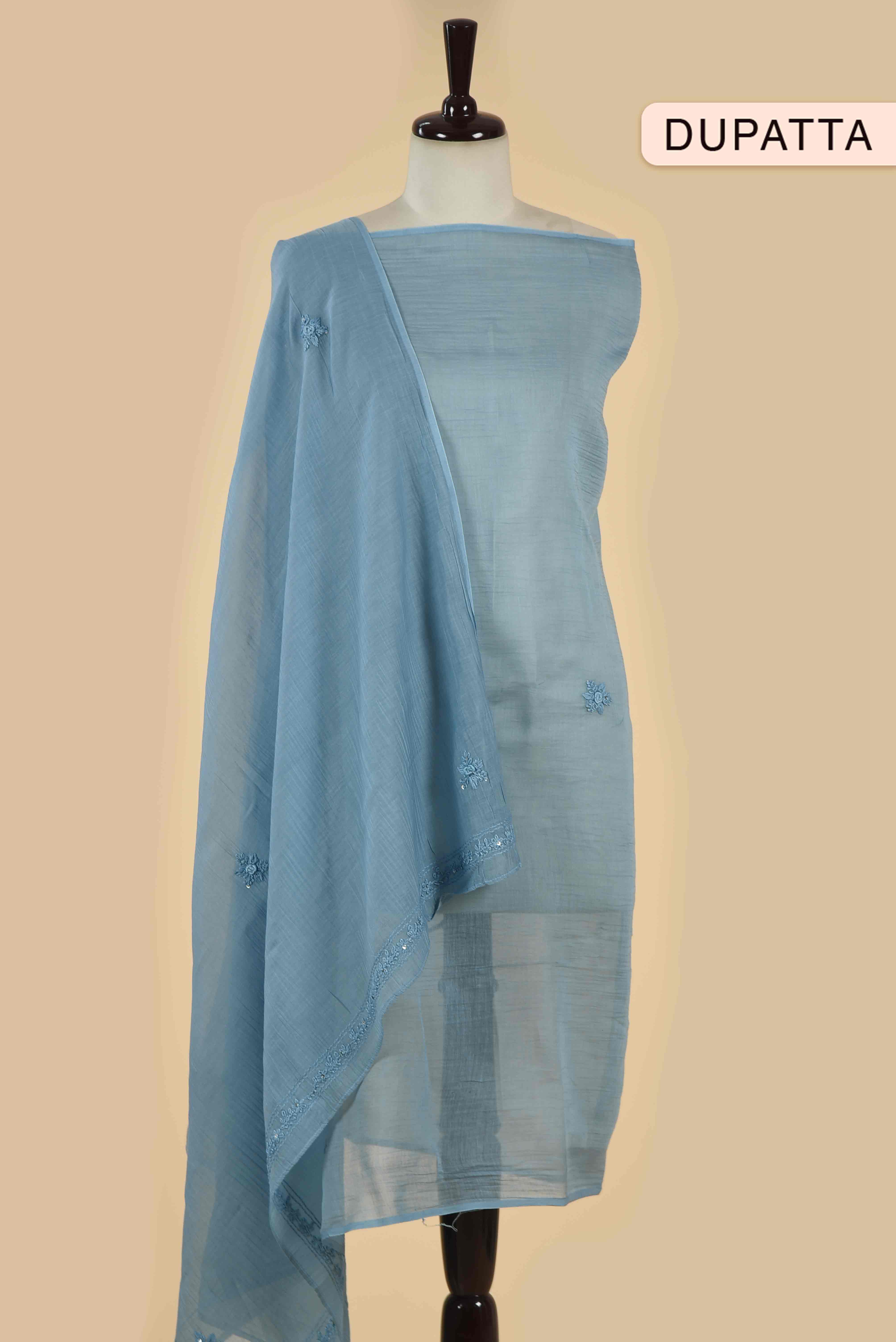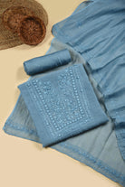 Blue Mul Chanderi Embroidered Unstitched Suit Fabric Set With Mul Chanderi Dupatta