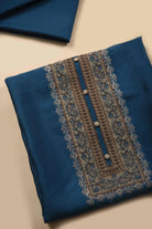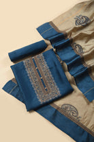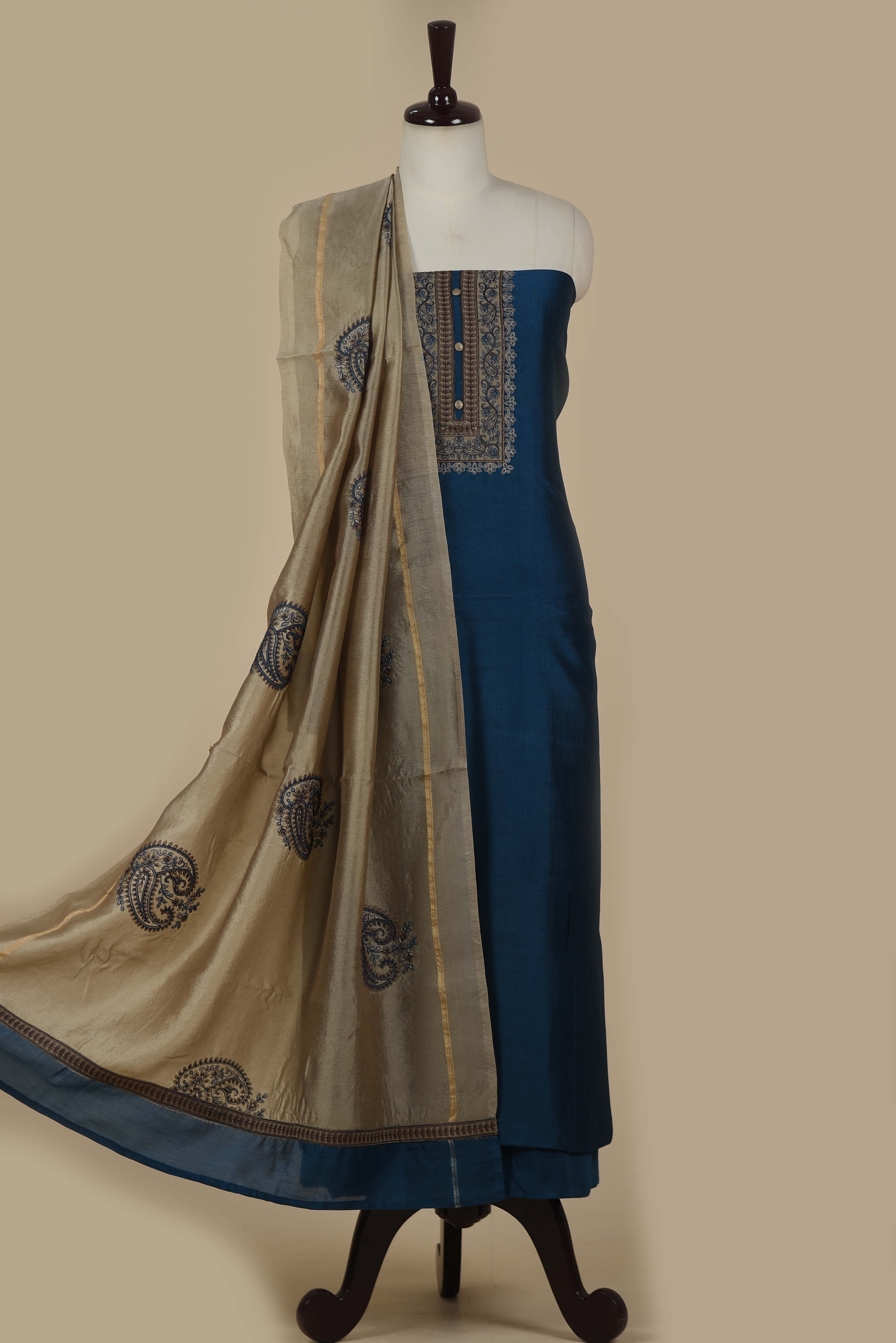 Blue Tussar Silk Thread Embroidered Unstitched Suit Fabric Set with Tussar Silk Embroidered Dupatta