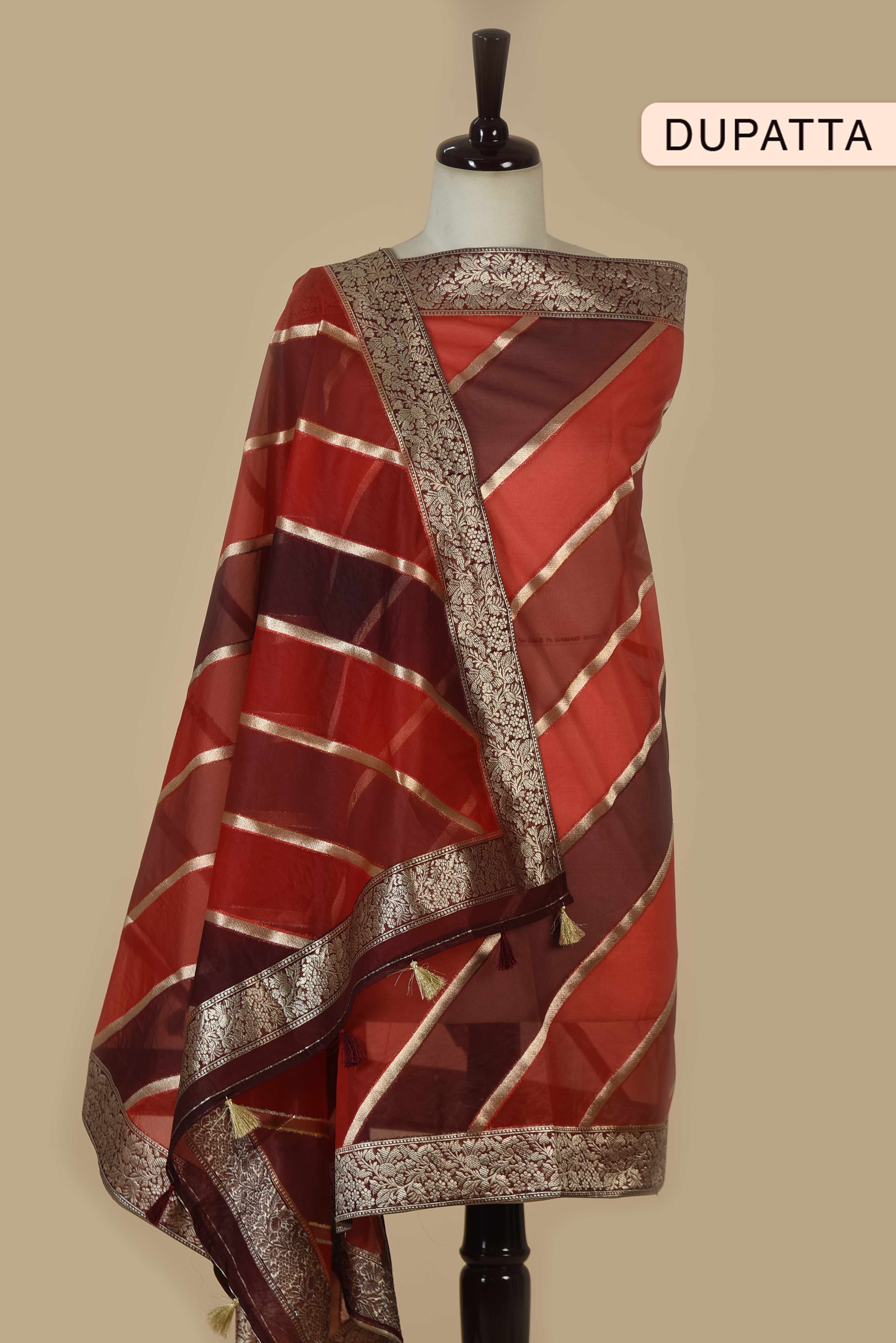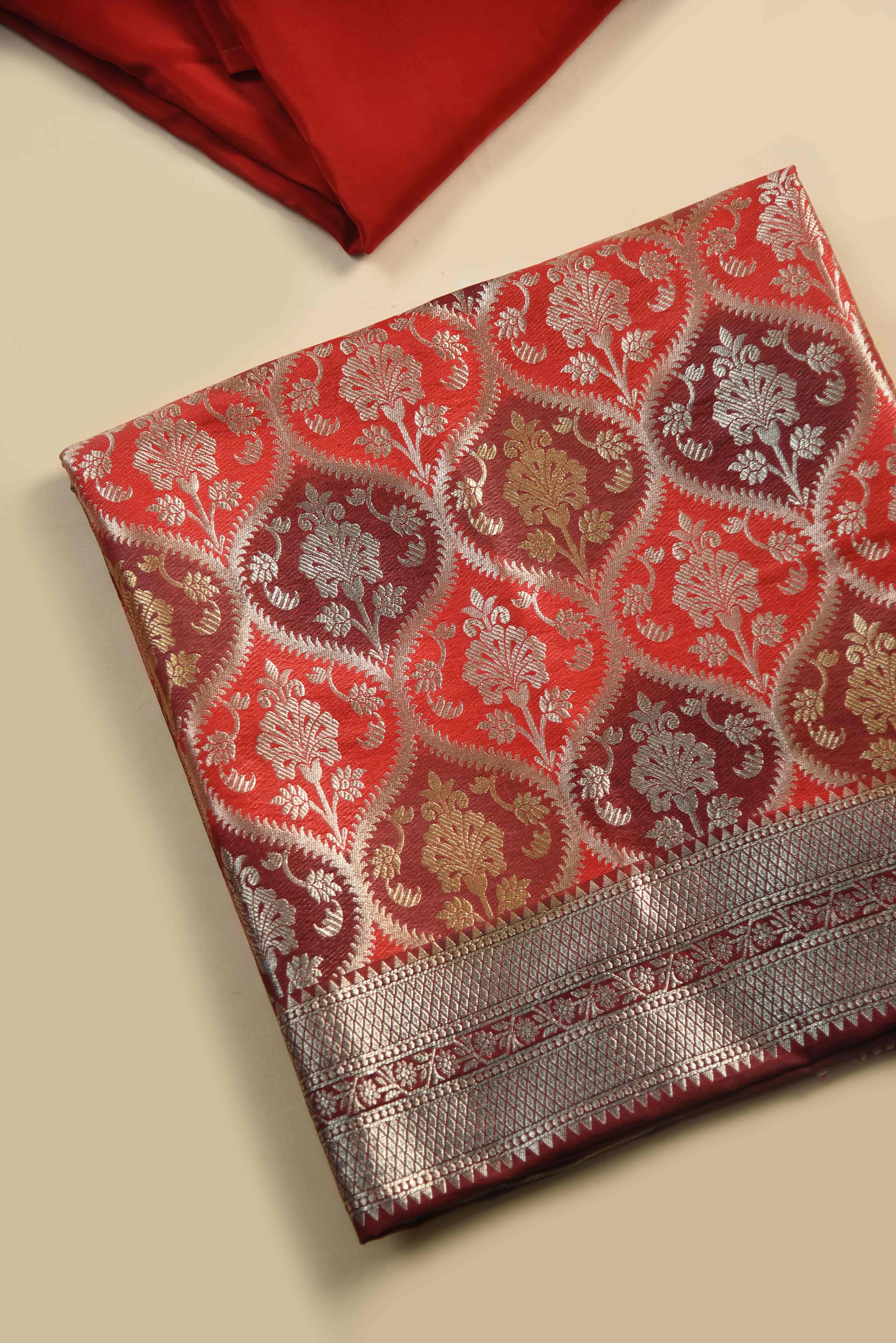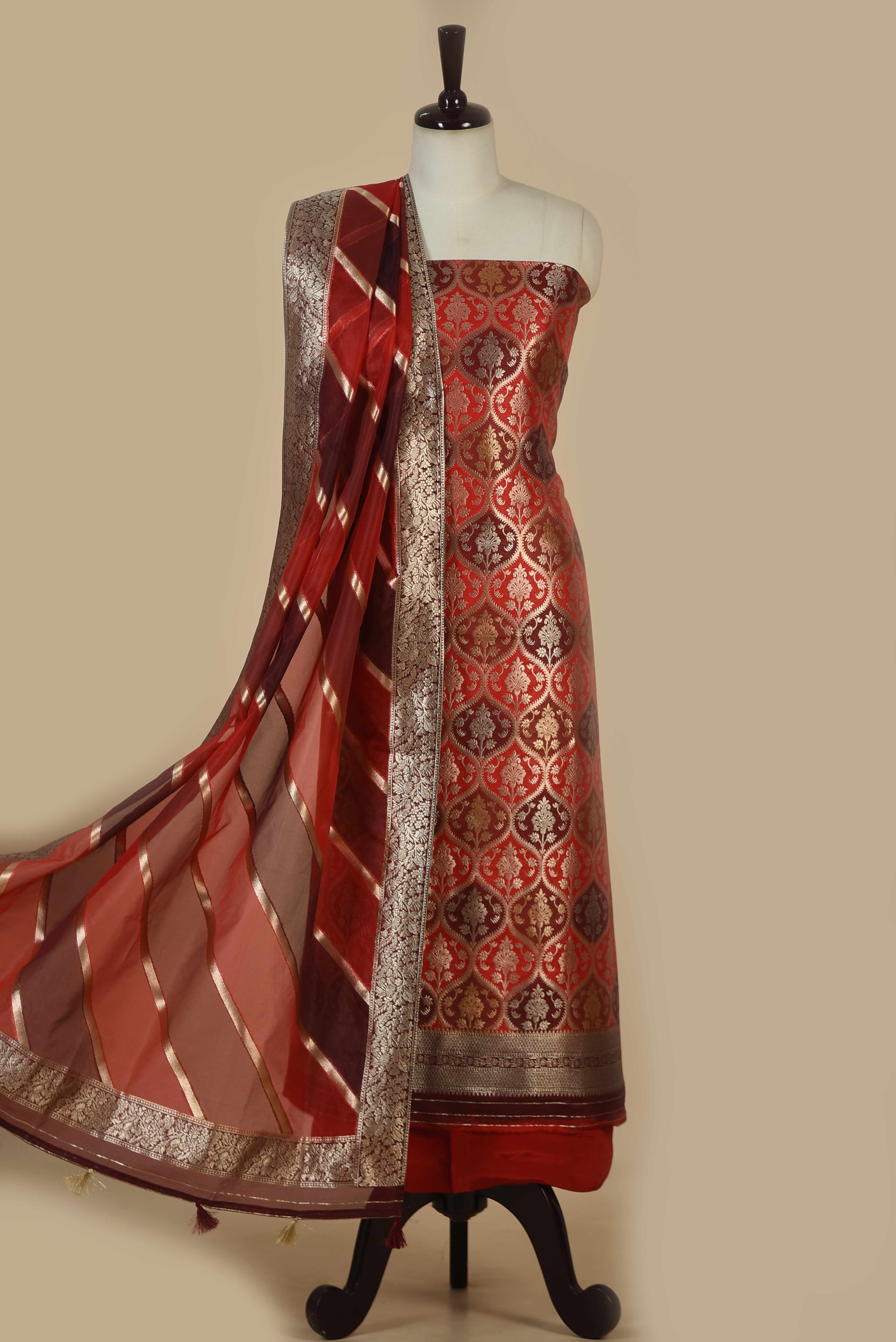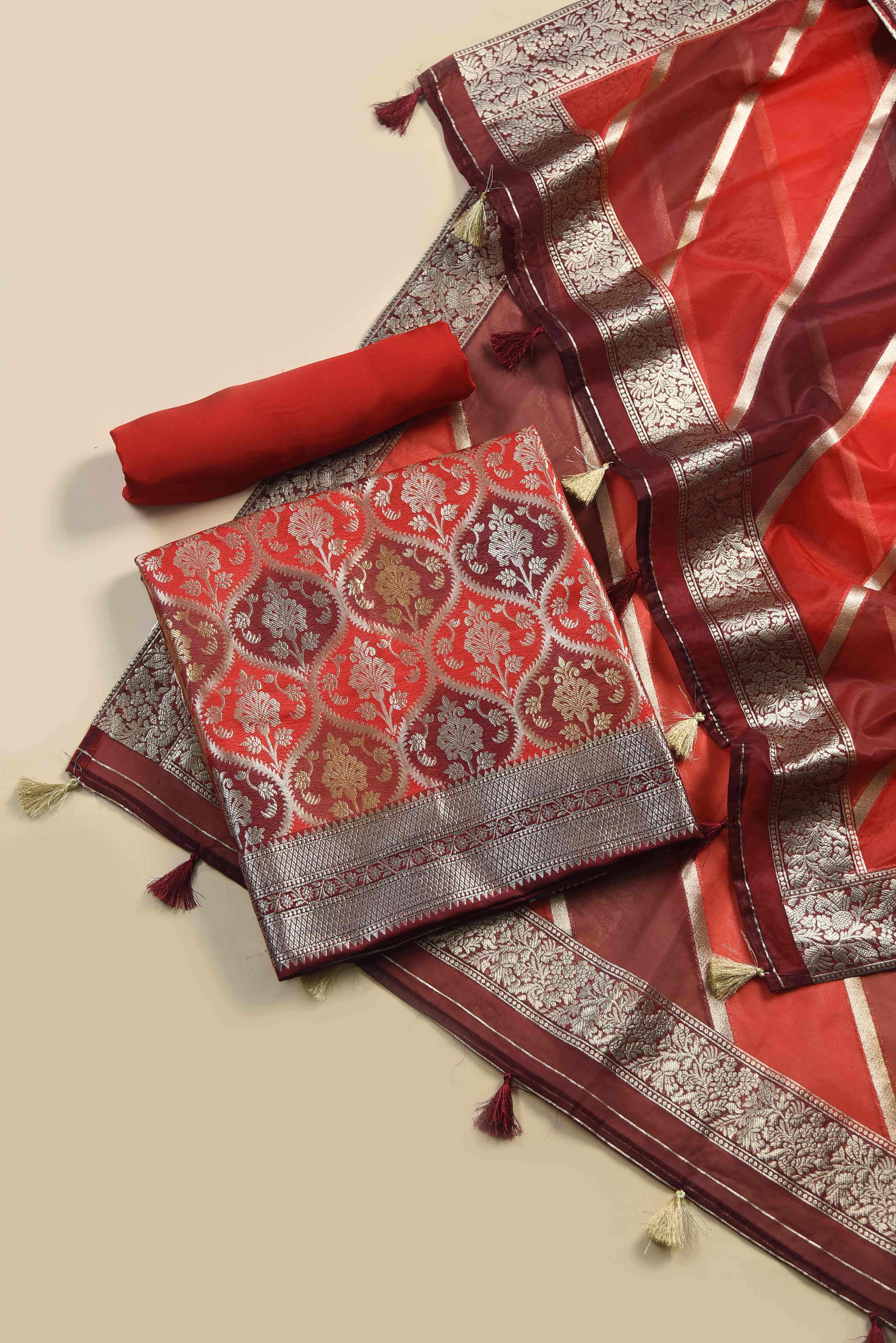 Brick Red Silk Multicolor Banarasi Woven Unstitched Suit Fabric Set With Organza Woven Dupatta