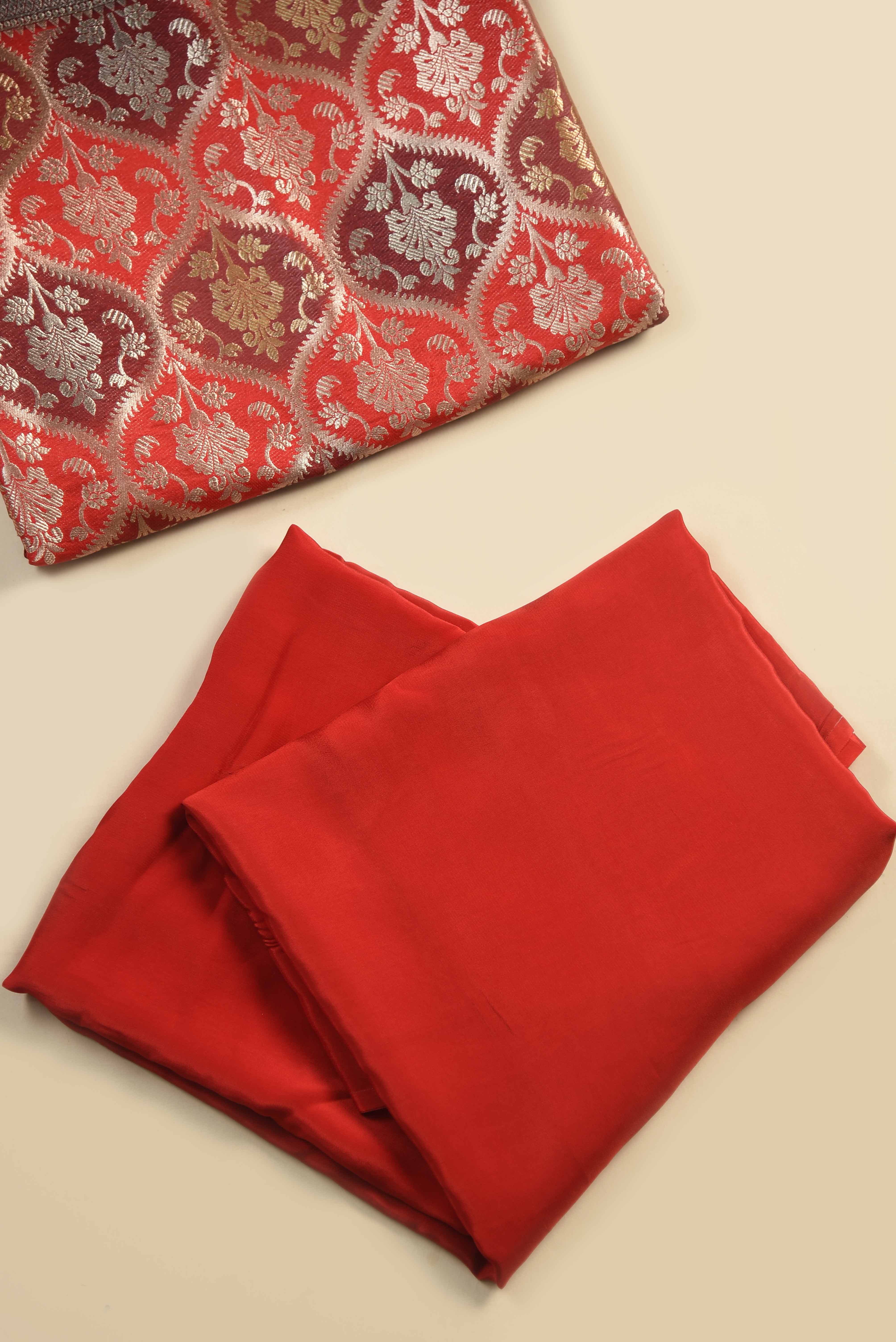 • Discover refined luxury with this stunning Brick Red silk unstitched suit set, meticulously crafted for your most cherished occasions.