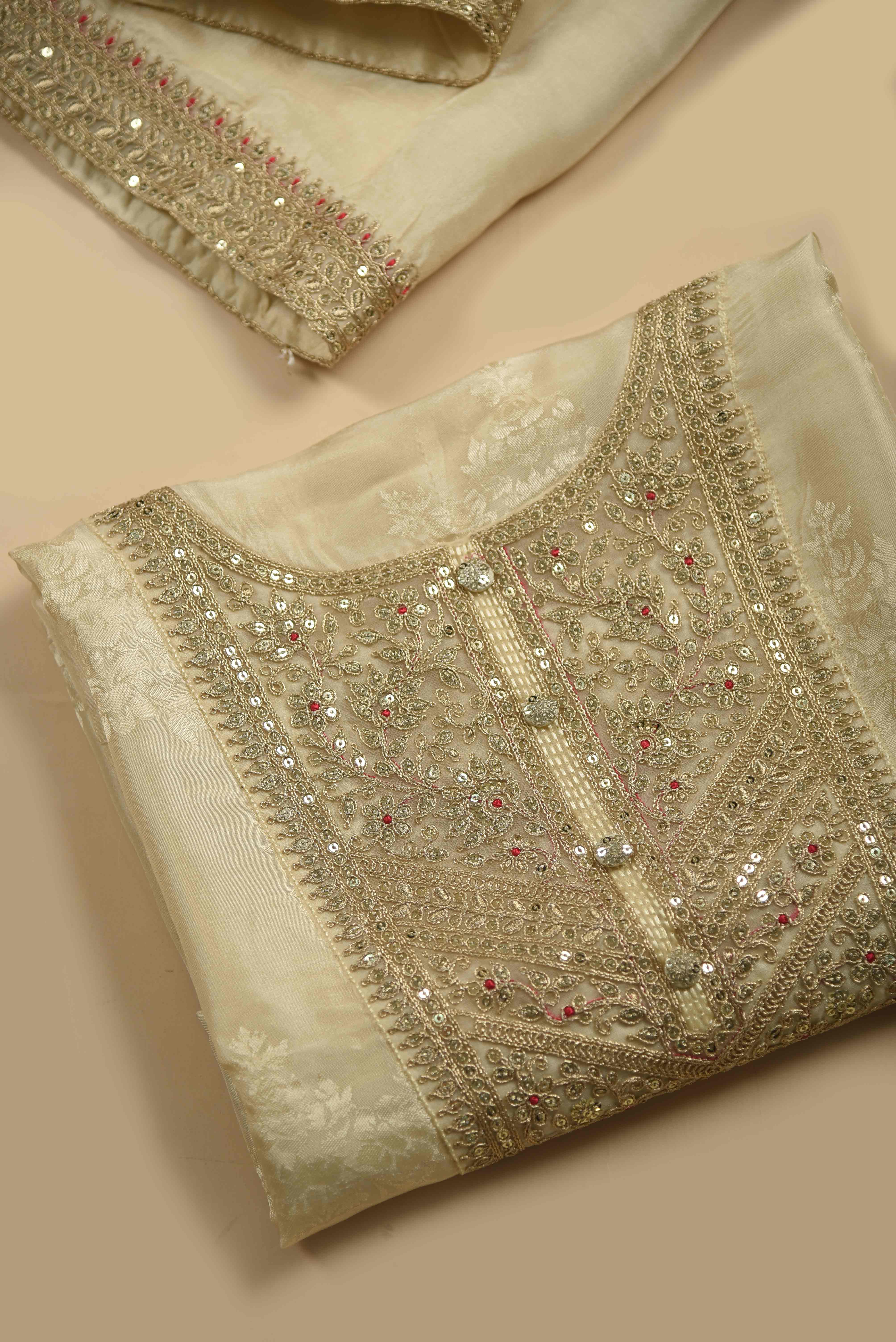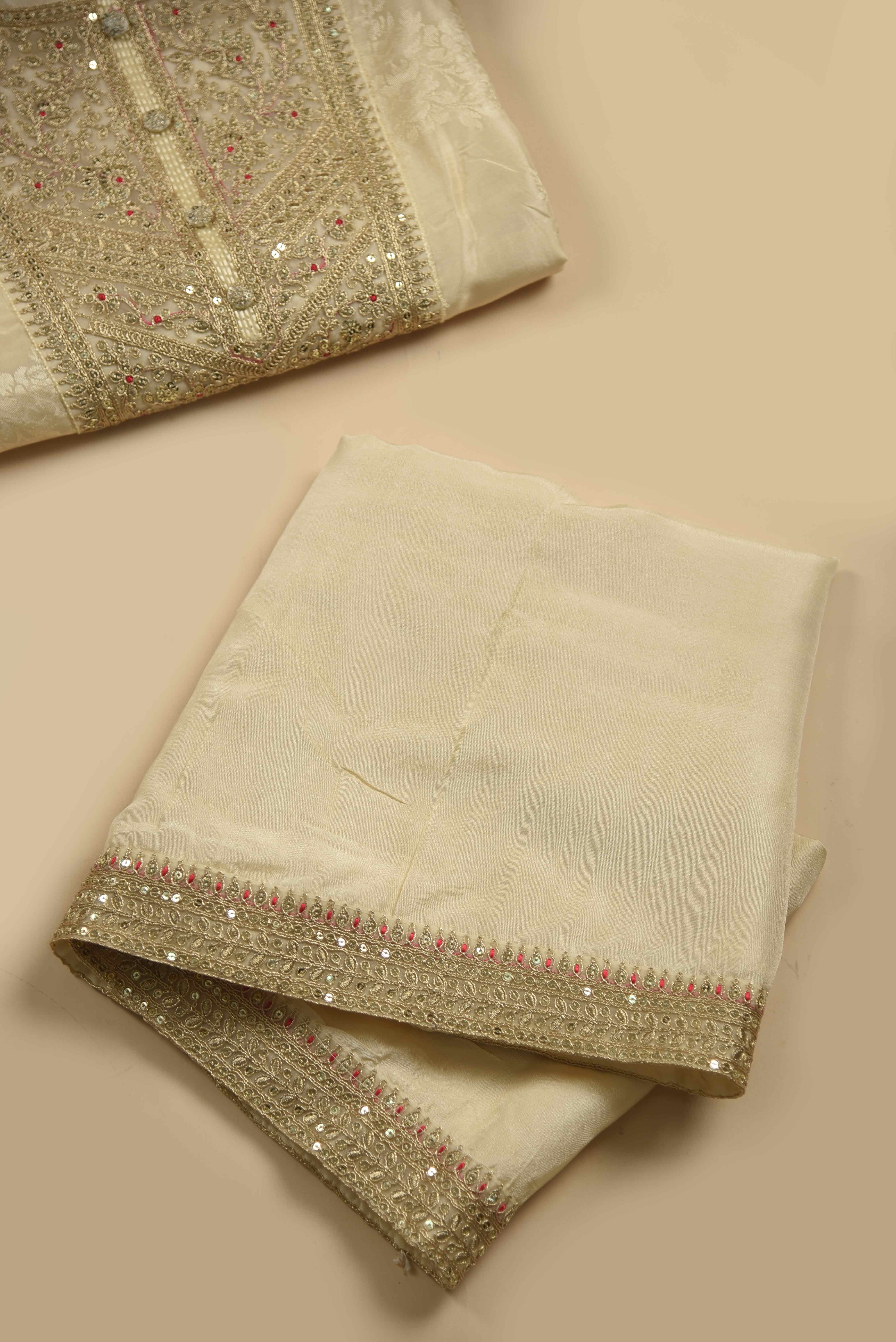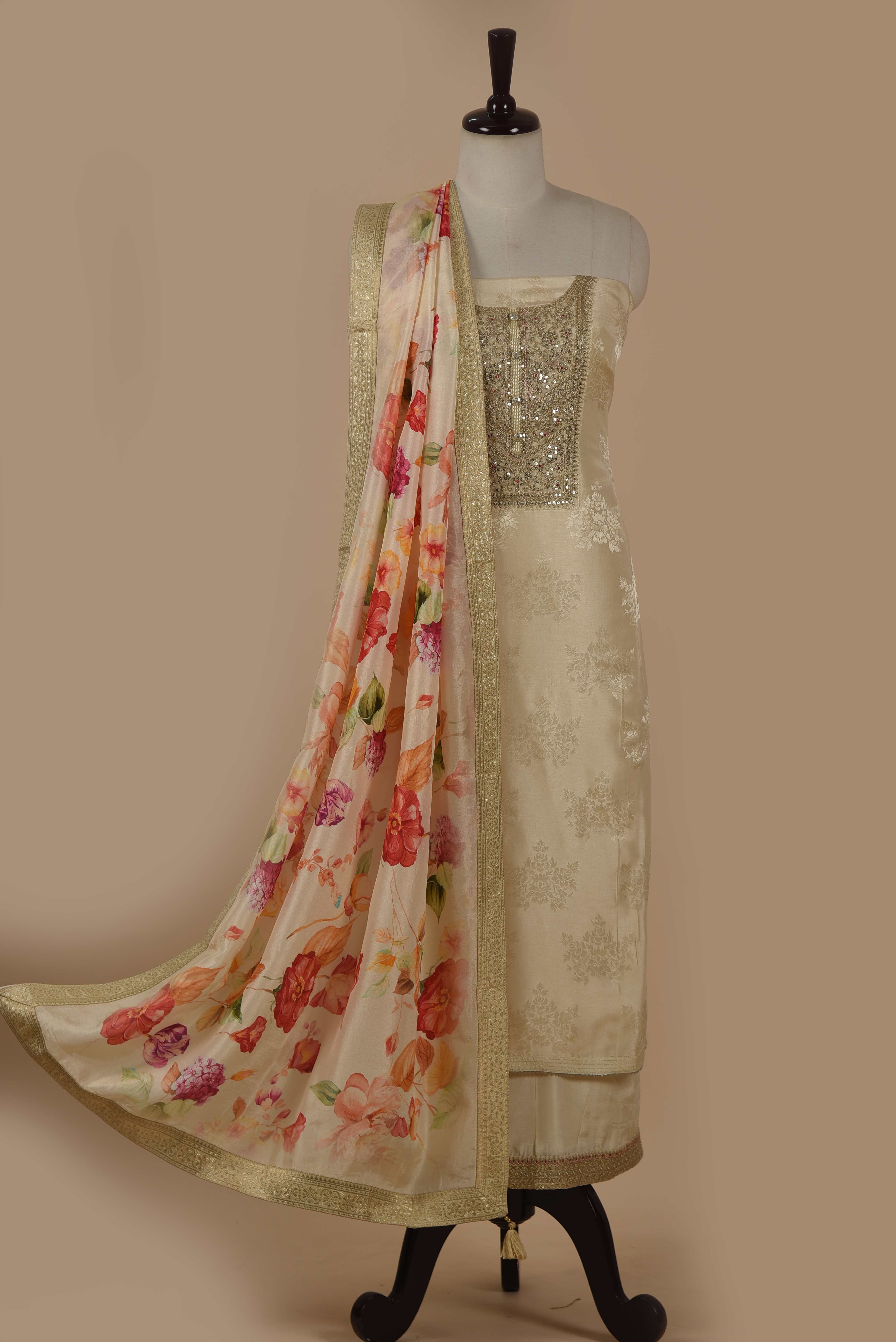 Cream Silk Viscose Blend Woven With Embroidered Unstitched Suit Fabric Set With Silk Viscose Blend Woven Dupatta