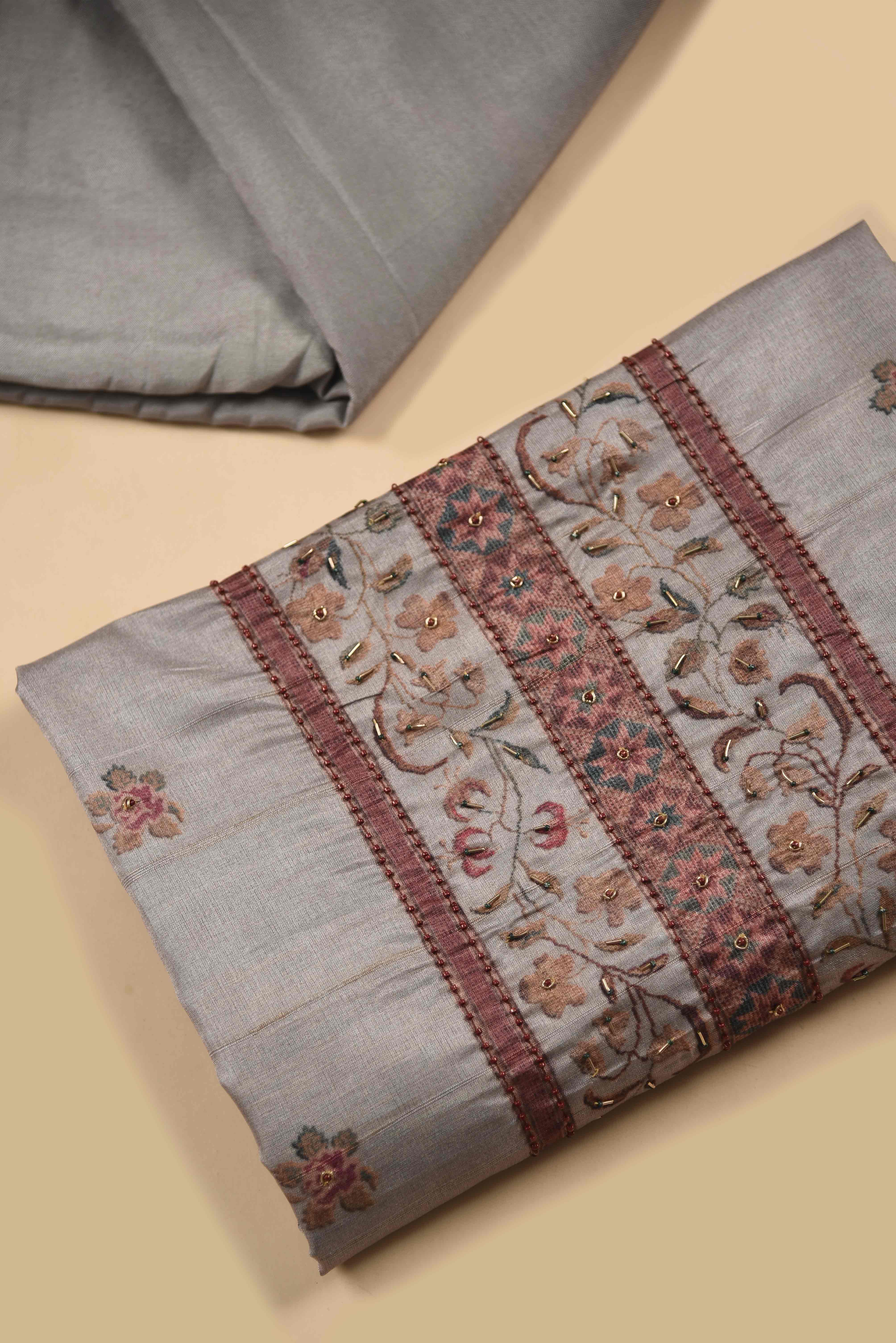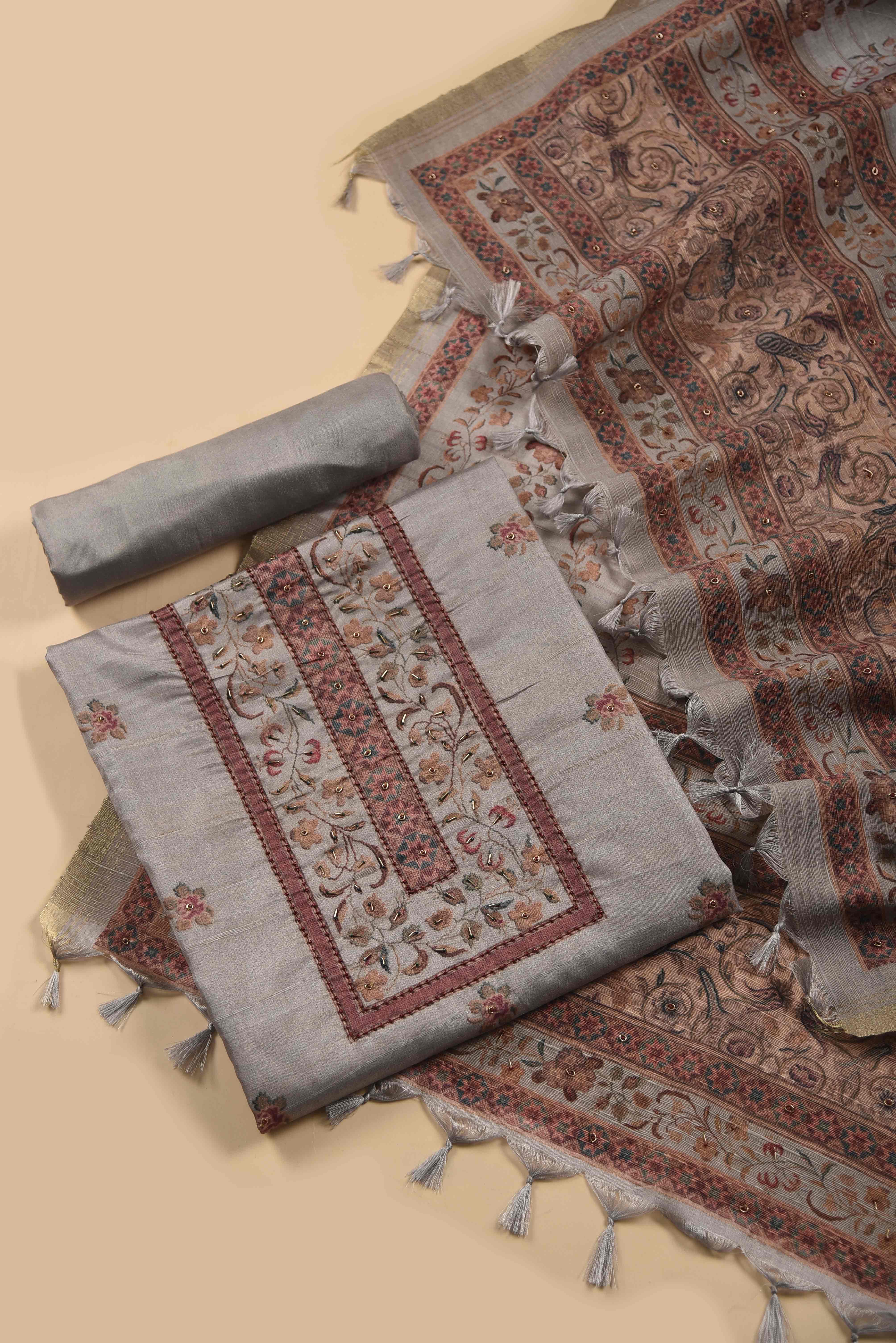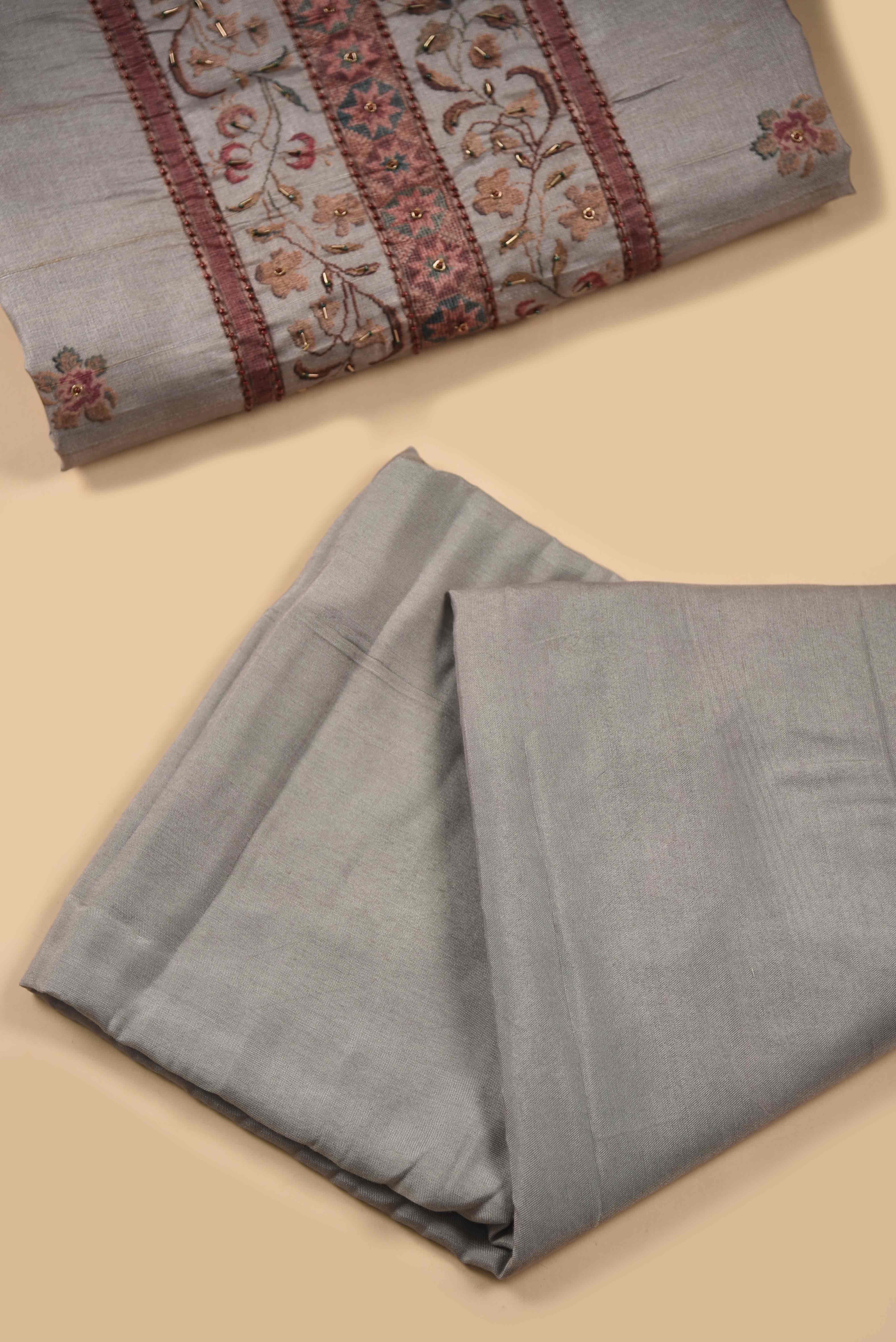 - Light Gray Silk Blend Printed & Embellished Unstitched Suit Set with Silk Blend Dupatta