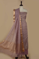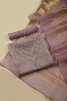 - This unstitched suit set features breathable Light Mauve organza silk fabric adorned with intricate hand-printed designs and delicate hand embellishments.