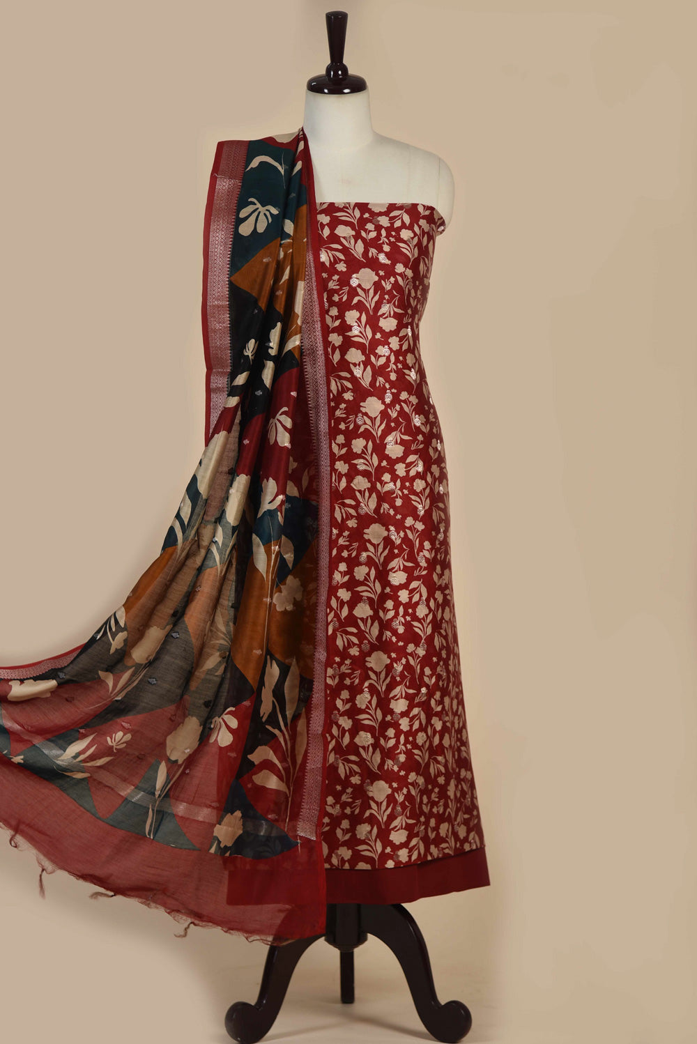 Maroon Chanderi Silk Printed & Woven Unstitched Suit Fabric Set with Matching Chanderi Printed Woven Dupatta