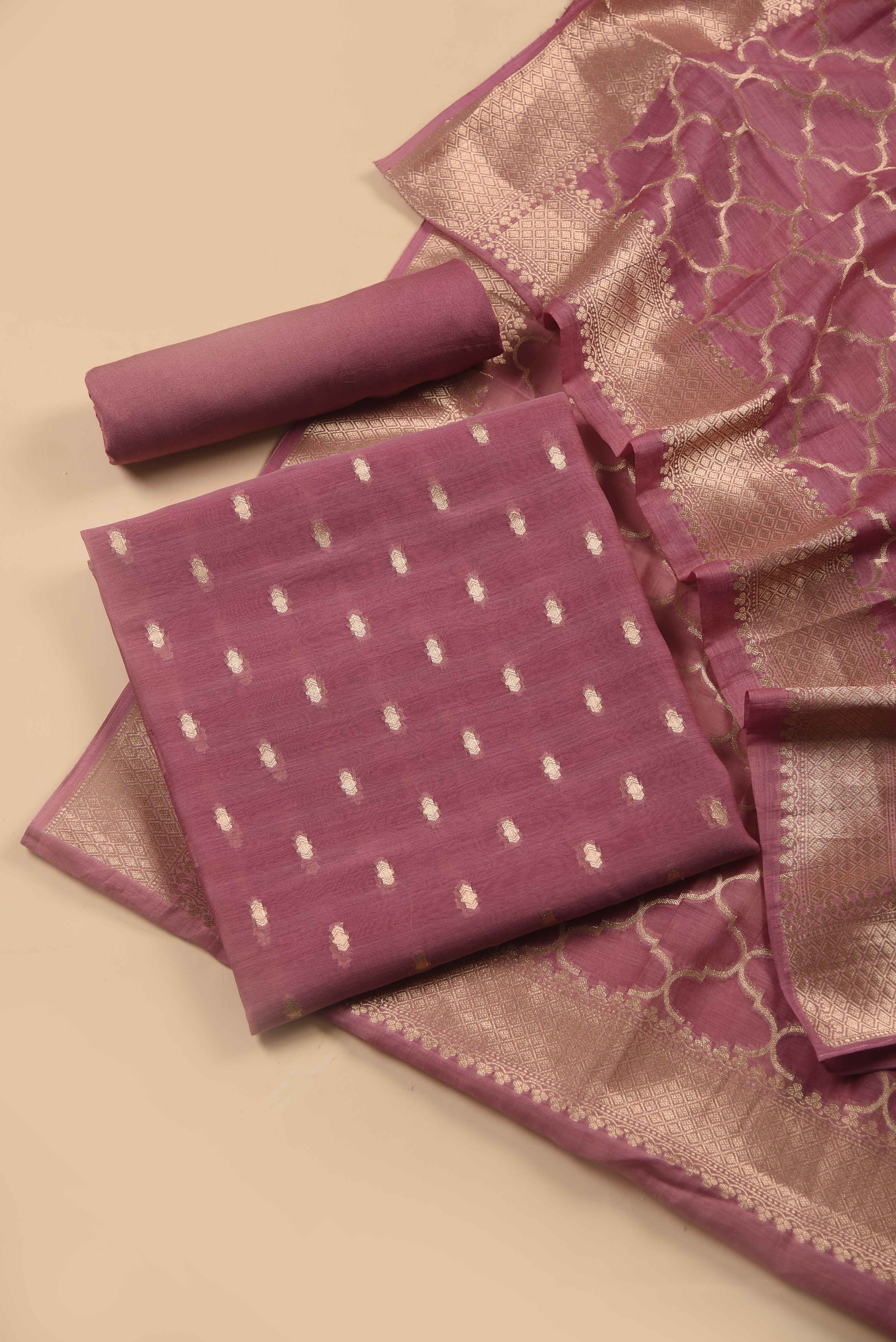 - This Mauve Banarasi Woven Chanderi Unstitched Suit Fabric Set showcases the exquisite Banarasi weave, combining softness and breathability for optimal comfort.