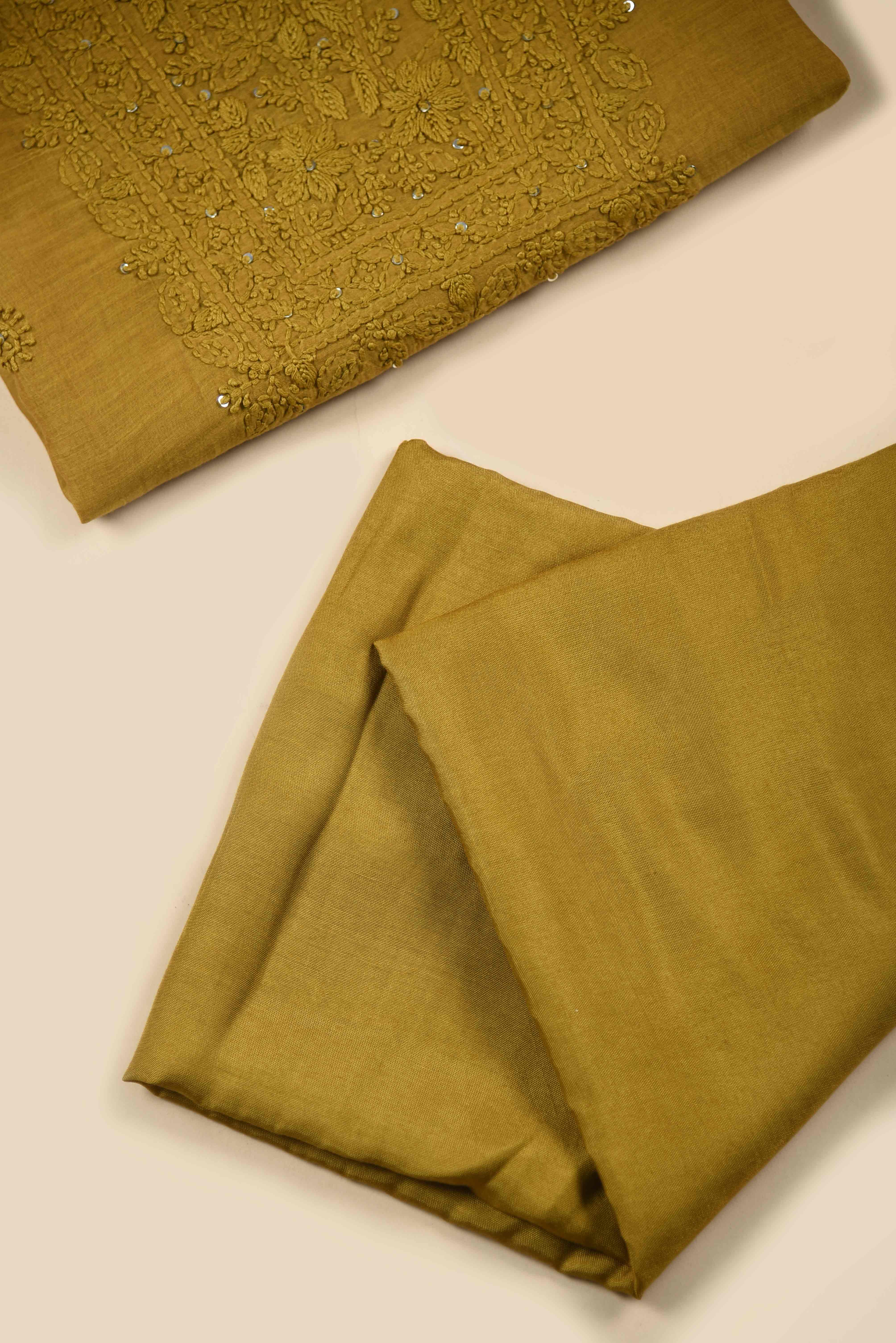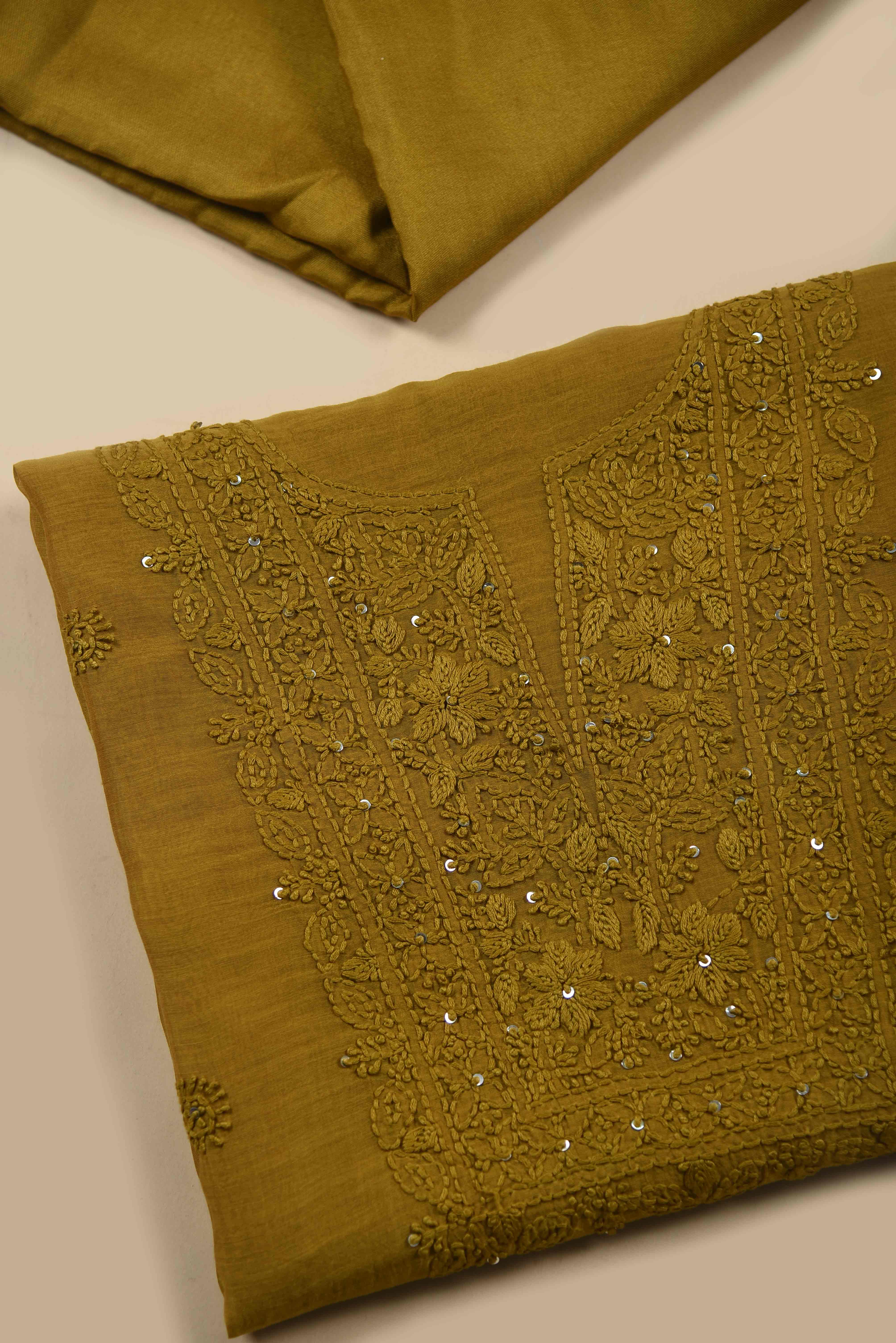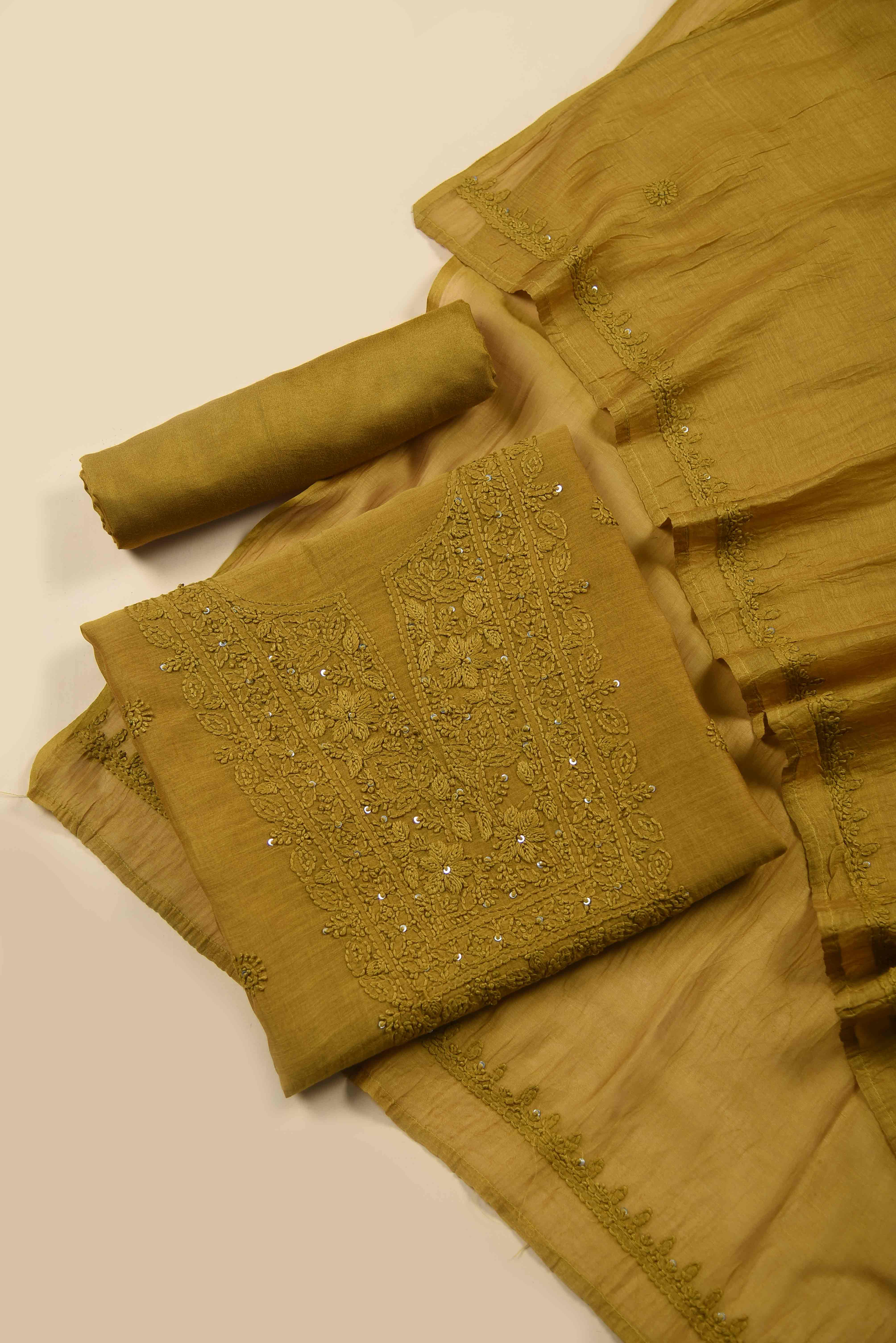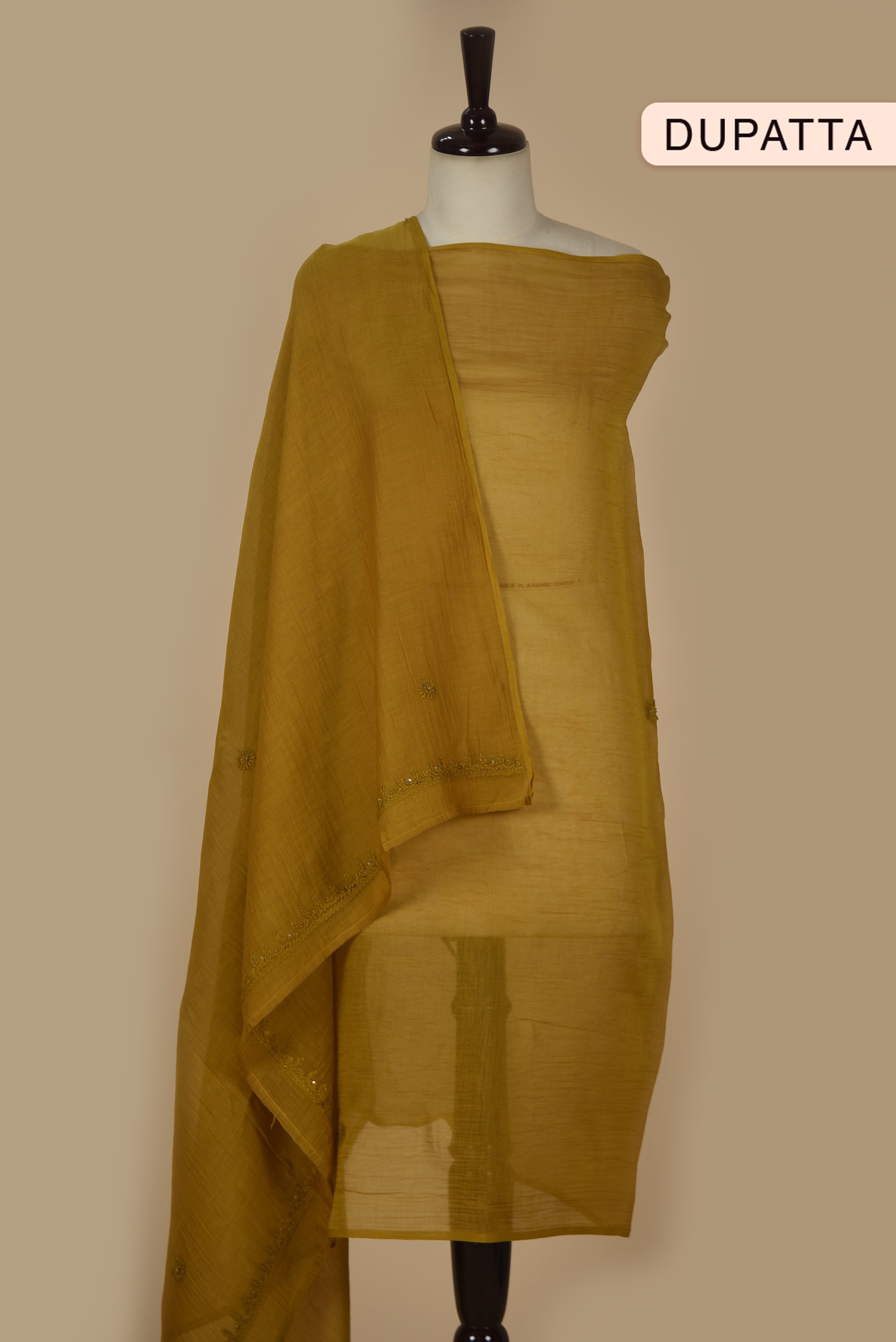 Mehndi Green Mul Chanderi Embroidered Unstitched Suit Fabric Set With Mul Chanderi Dupatta