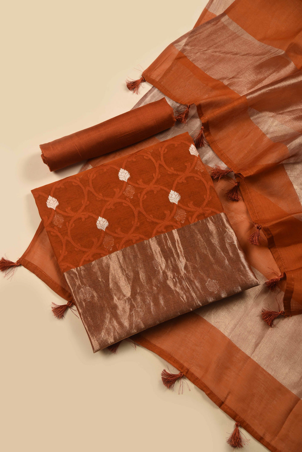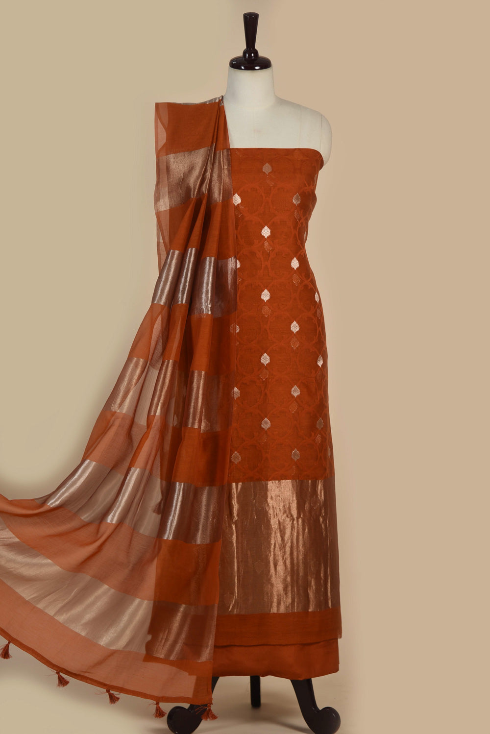 Orange Chanderi Silk Woven Unstitched Suit Fabric Set With Mul Chanderi Woven Dupatta