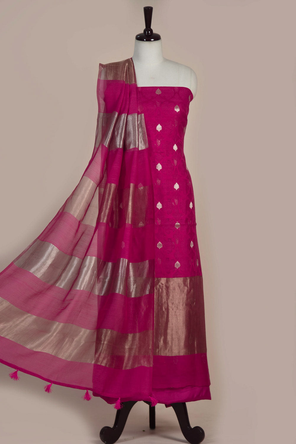 Pink Chanderi Silk Woven Unstitched Suit Fabric Set With Mul Chanderi Woven Dupatta