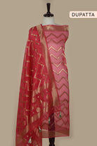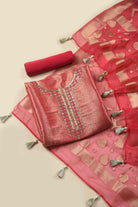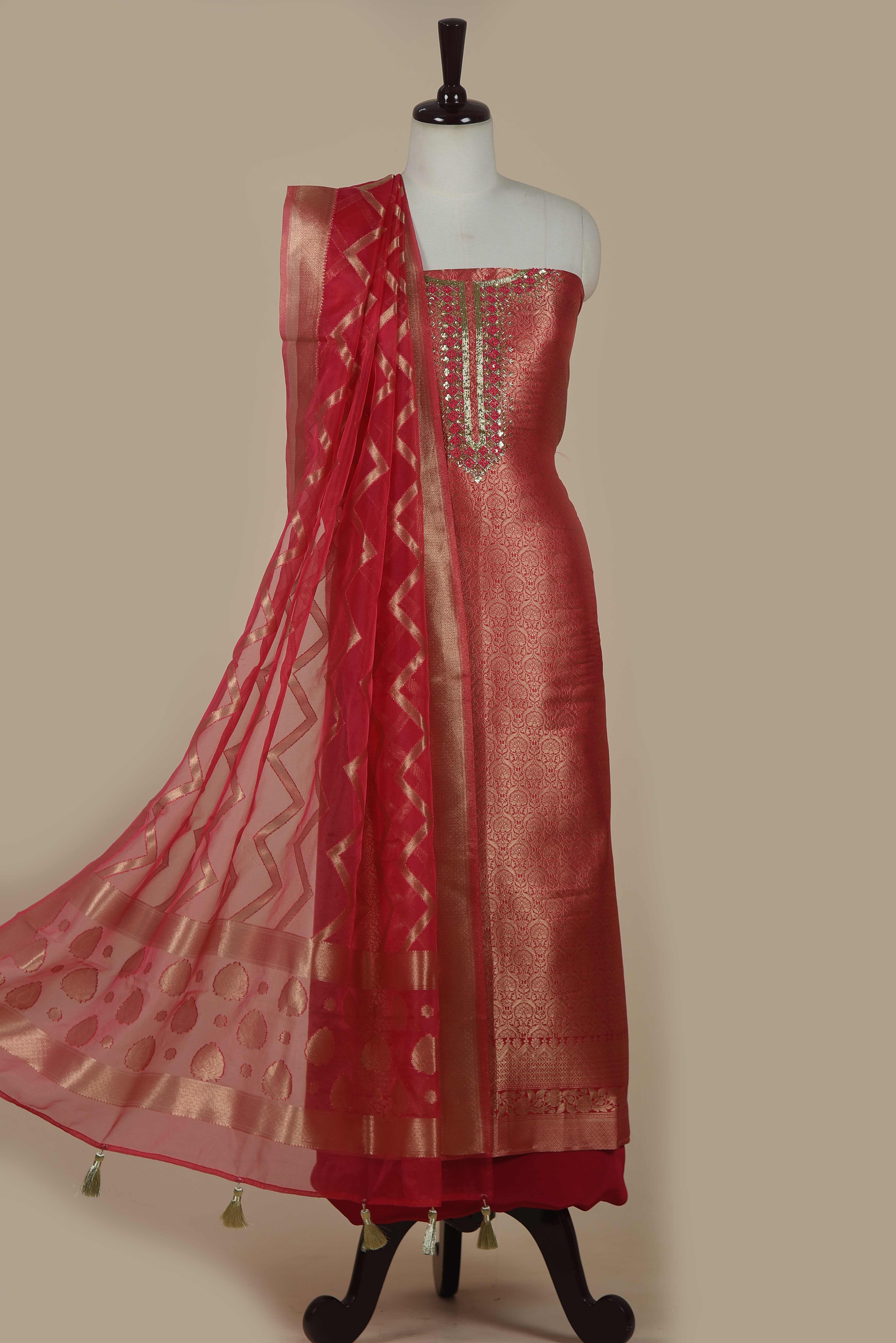 Pink Fine Banarasi Silk Embroidered Woven Unstitched Suit Fabric Set With Organza Woven Dupatta