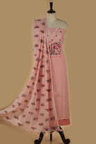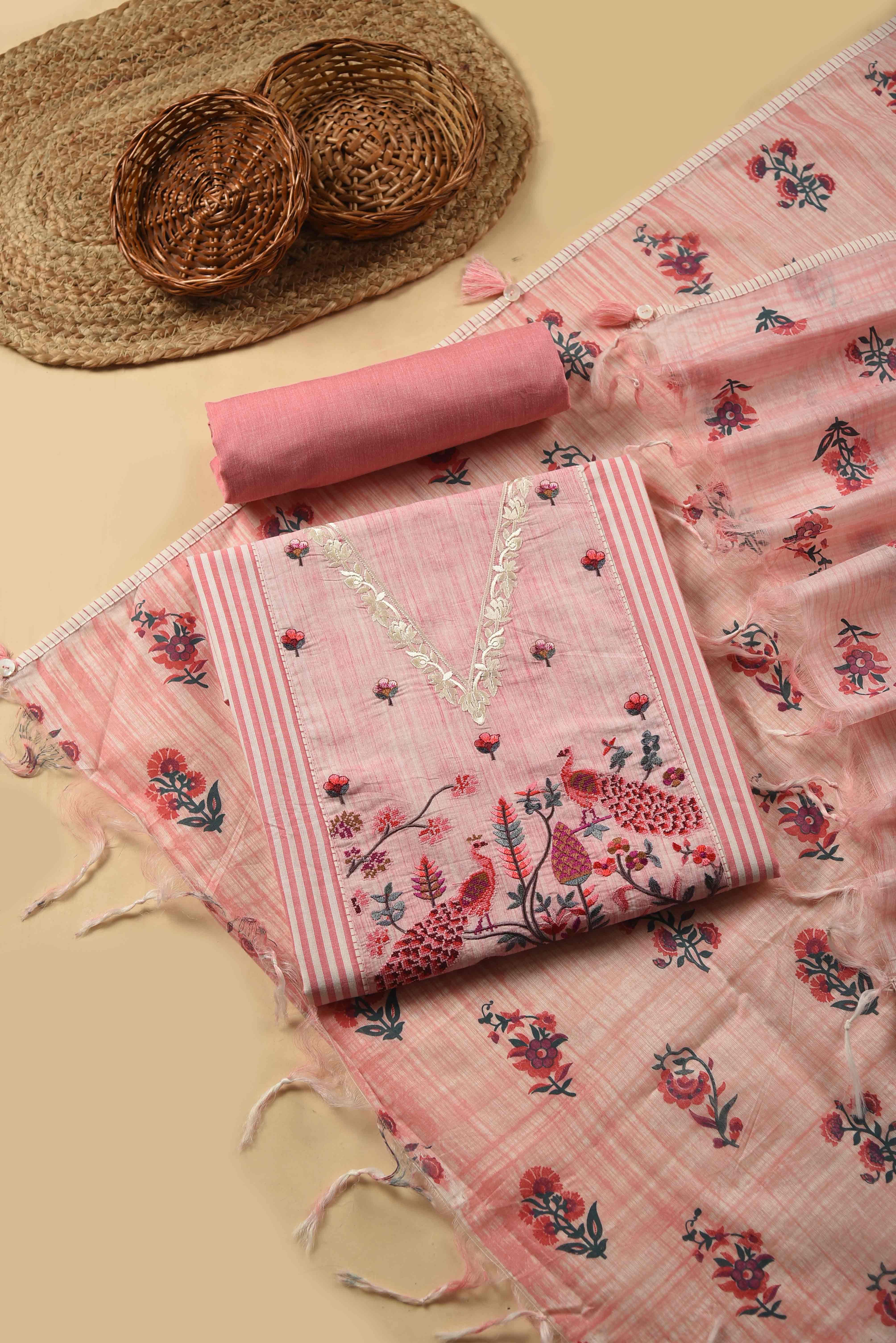 Pink Pure Cotton Printed With Embroidered Unstitched Suit Fabric Set With Cotton Printed Dupatta