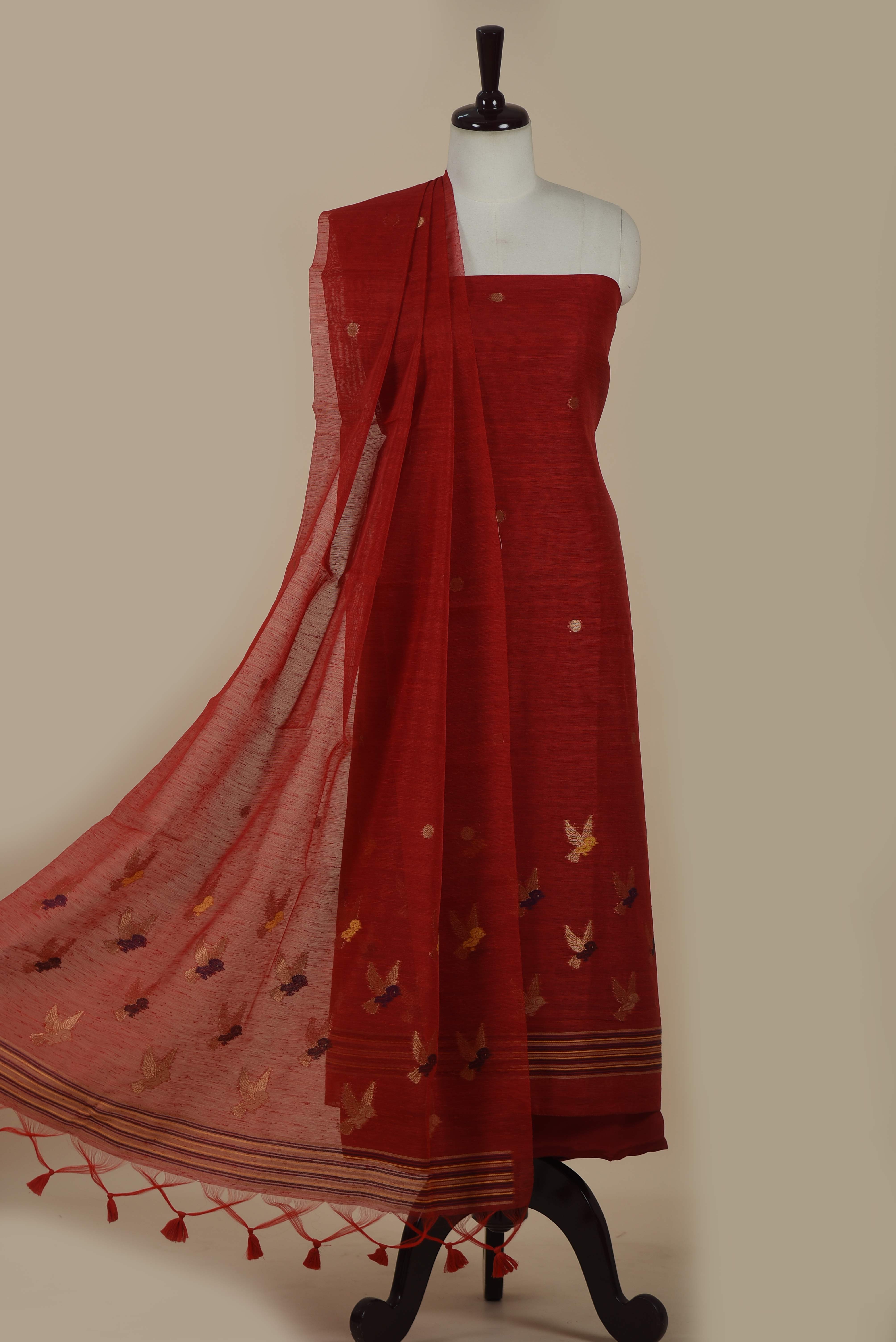 Red Linen Blend Jamdani Woven Unstitched Suit Fabric Set With Linen Woven Dupatta