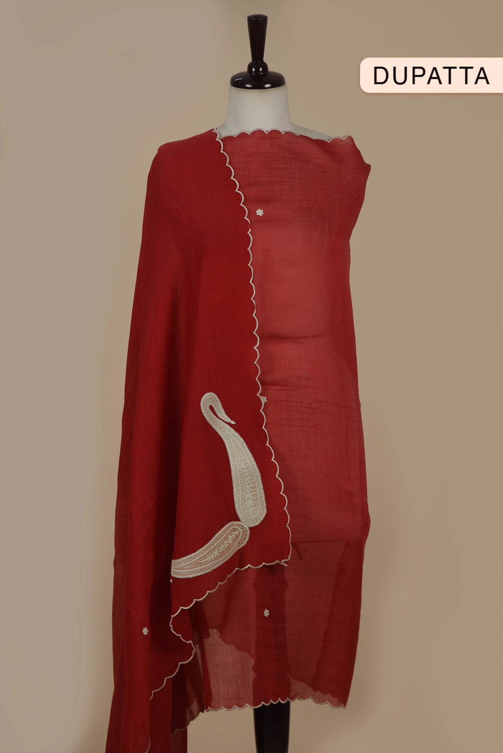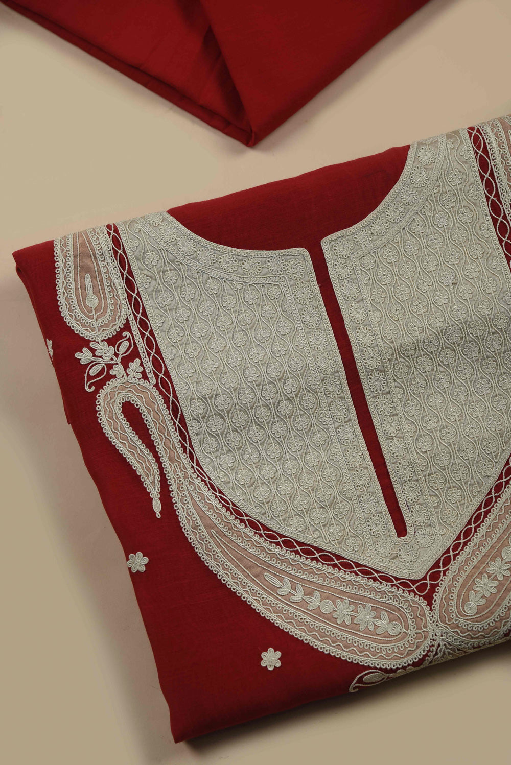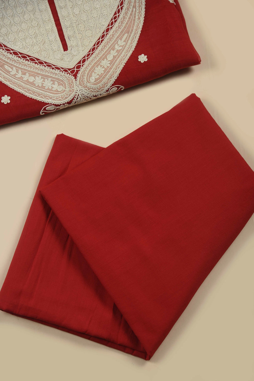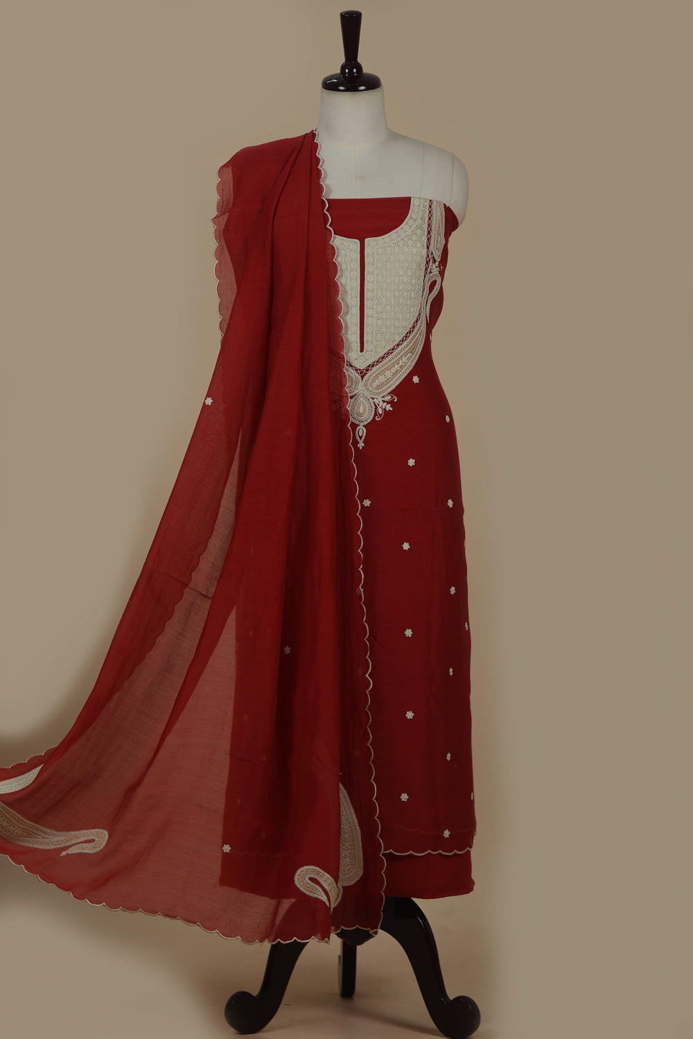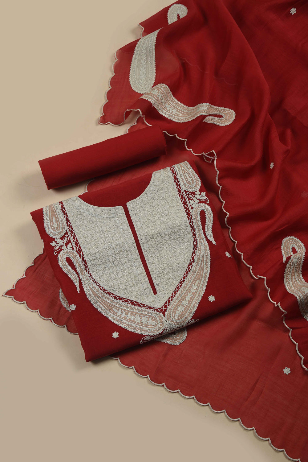 Red Mul chanderi Embroidered Unstitched Suit Fabric Set With Mul Chanderi Embroidered Dupatta