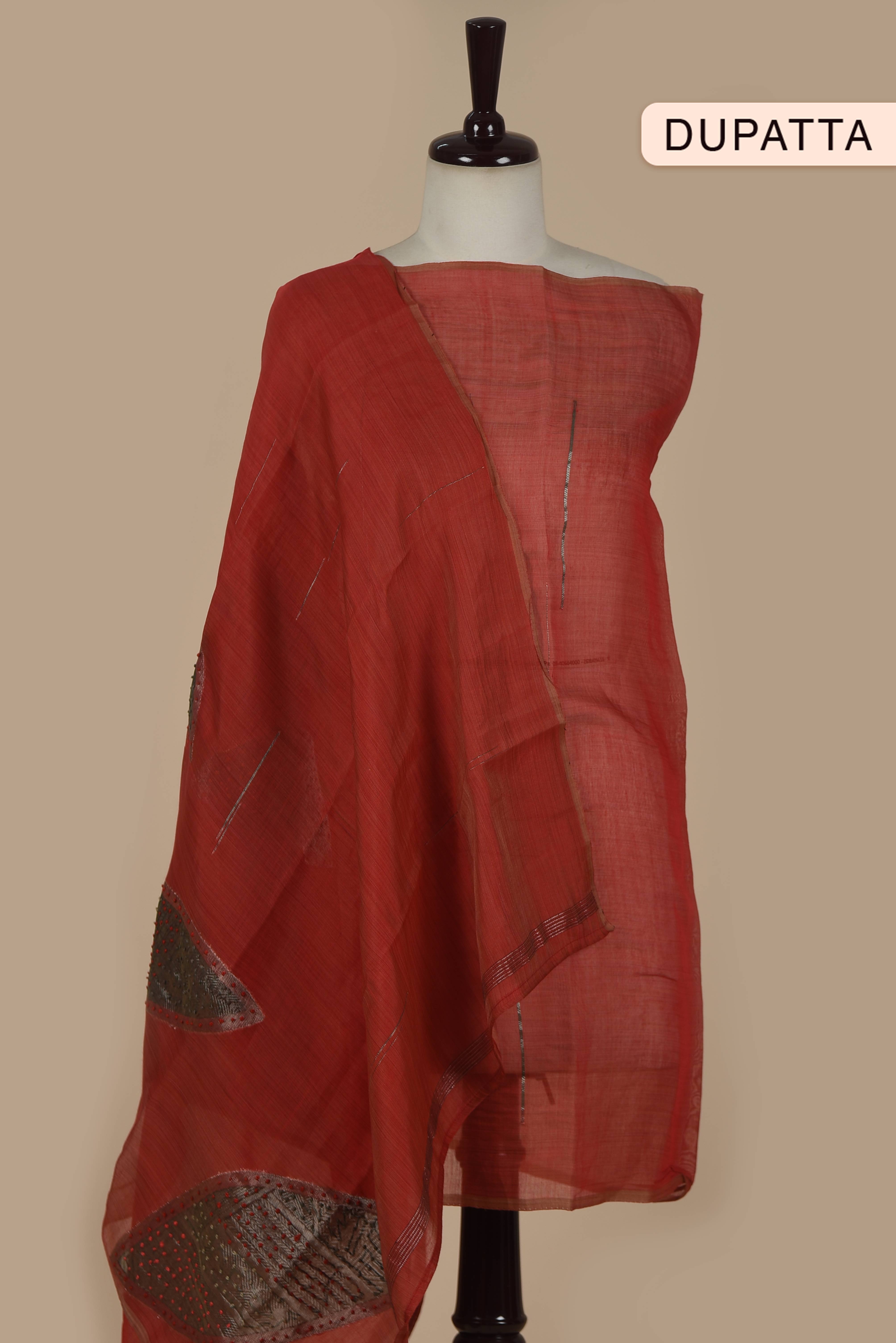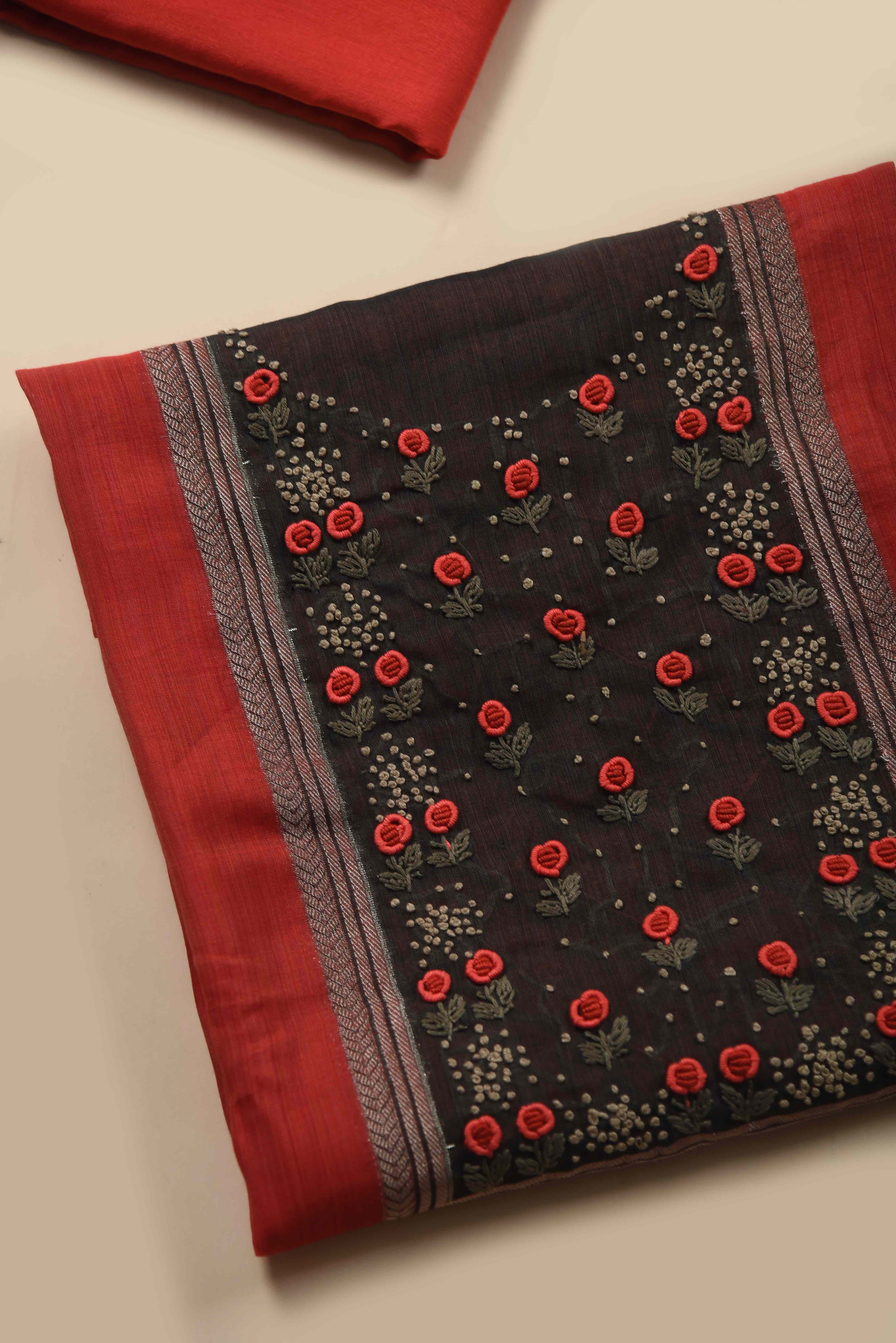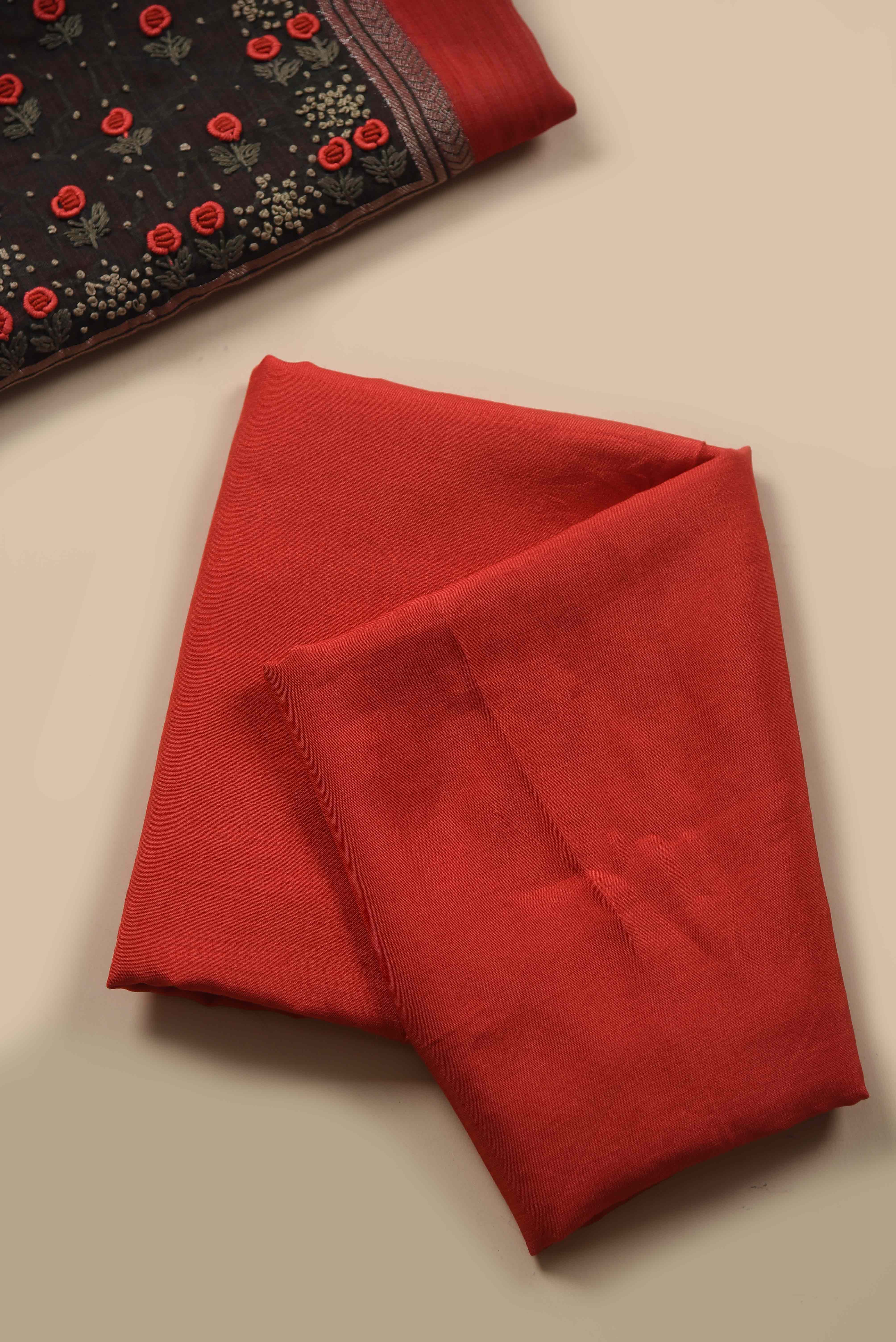 Red With Grey Fine Chanderi Woven Embroidered Unstitched Suit Fabric Set With Fine Chanderi Embroidered Dupatta