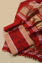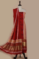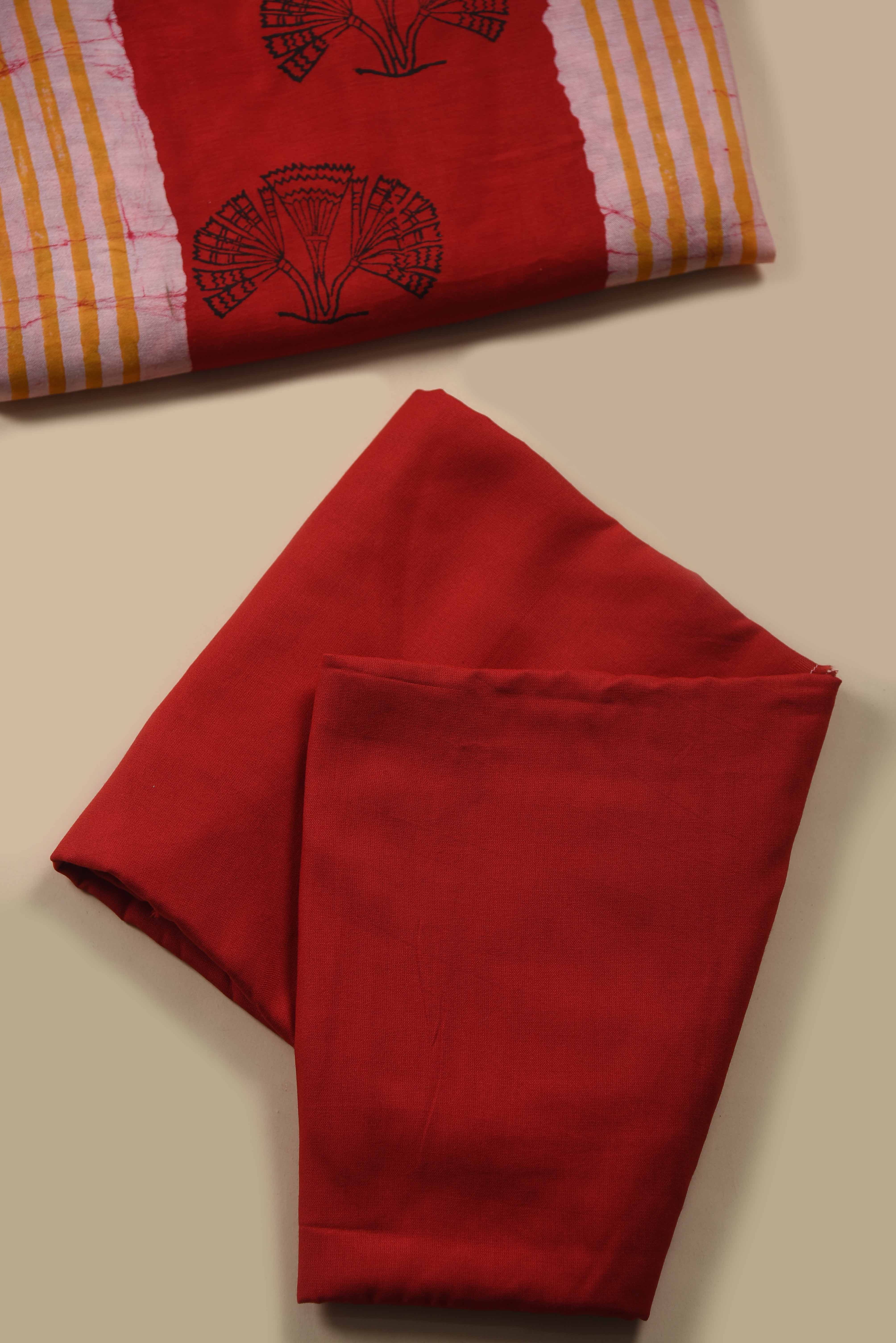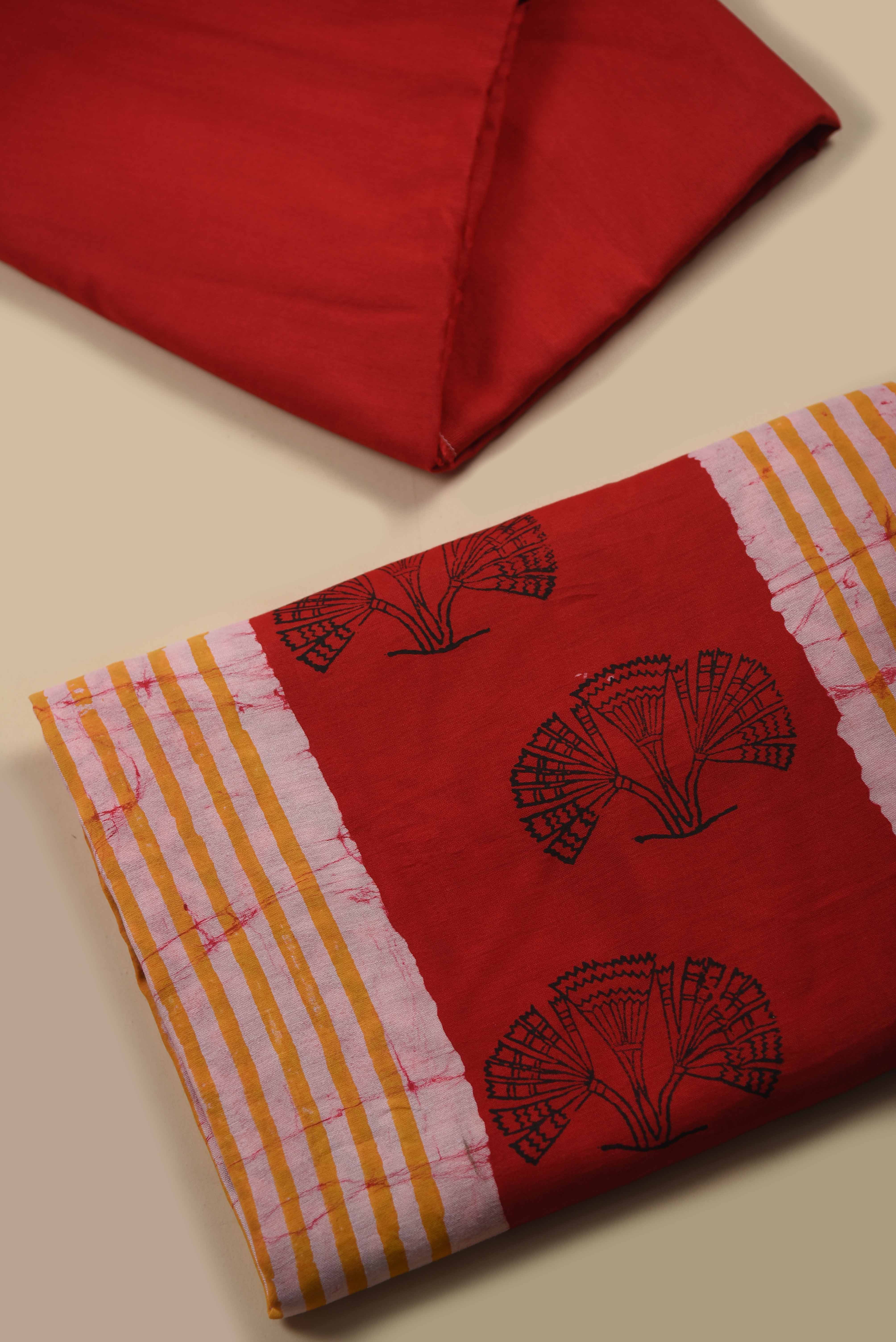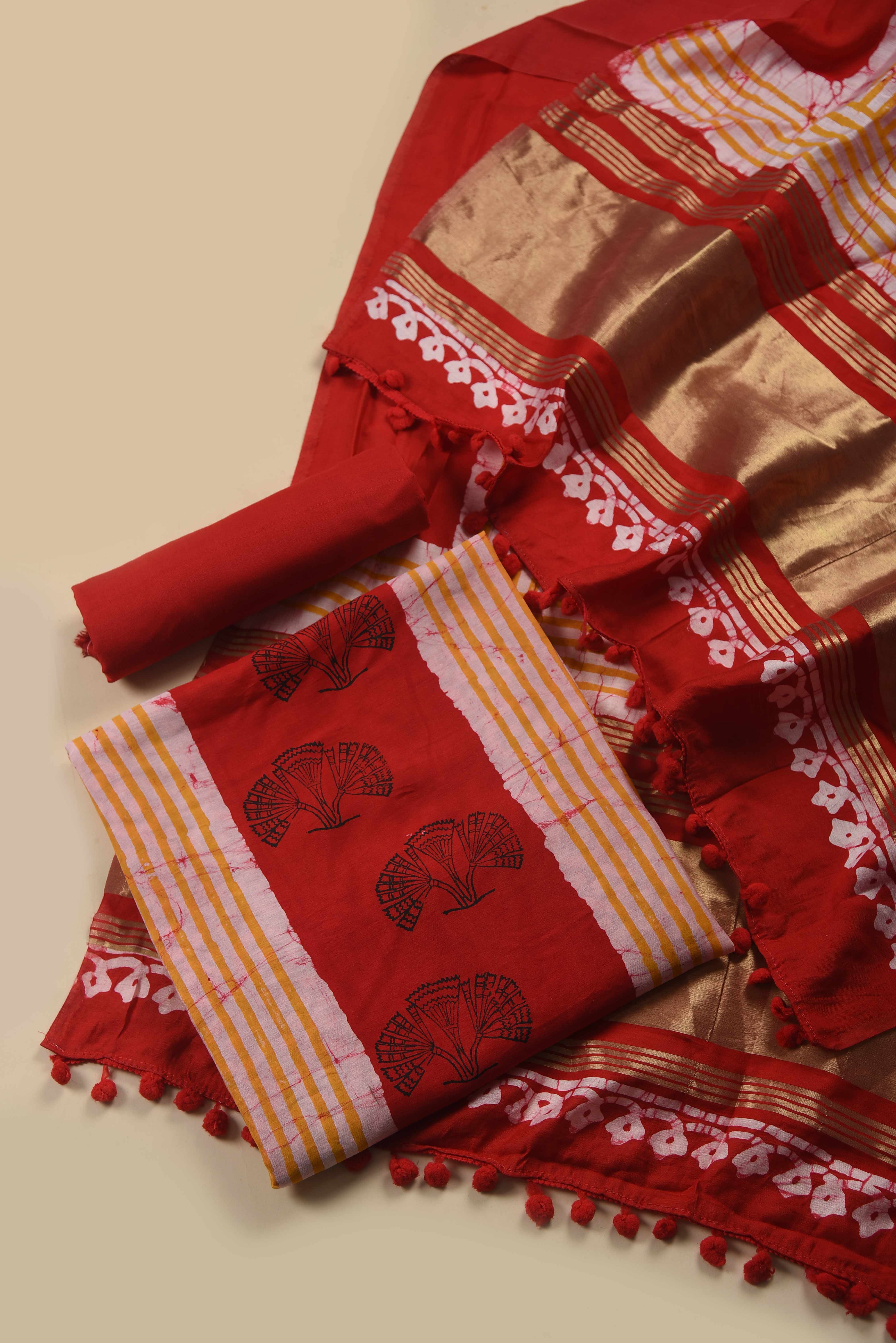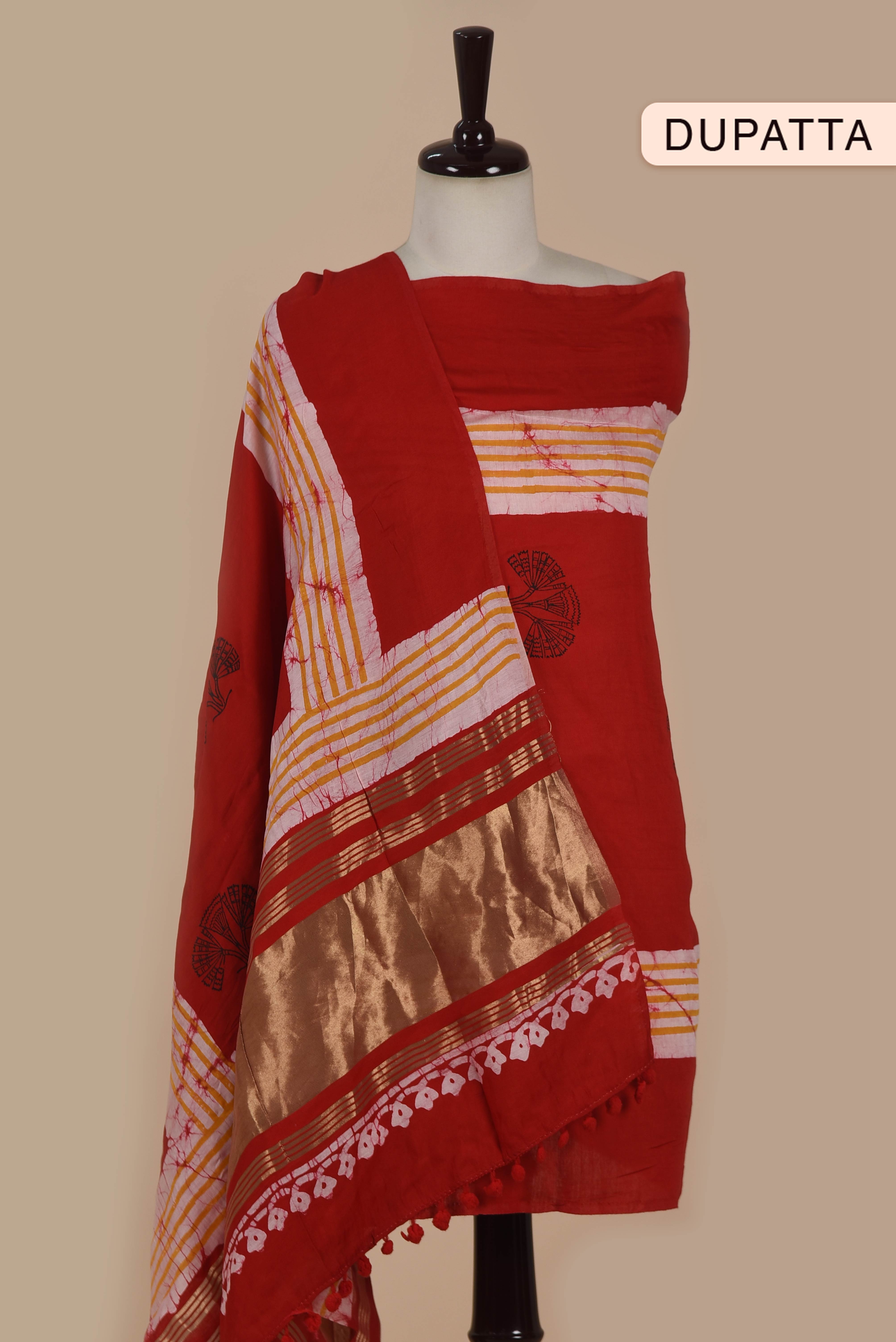 Red & Yellow Chanderi Printed Unstitched Suit Fabric Set with Chanderi Dupatta