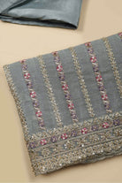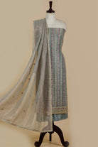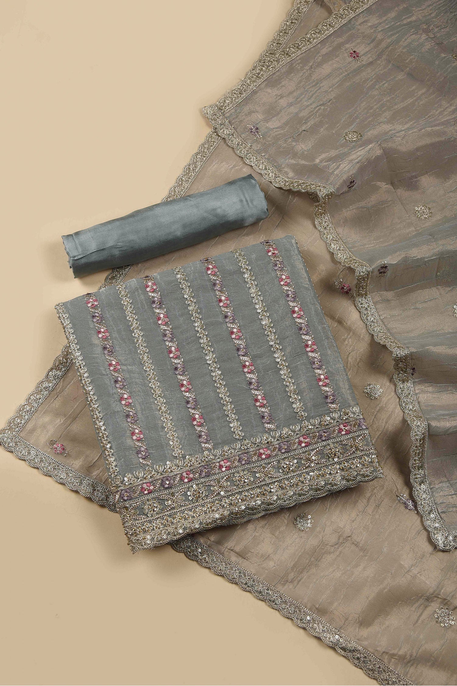 - This Sea Green tissue organza blend unstitched suit fabric set features exquisite embroidery combining both zari and thread embroidery.