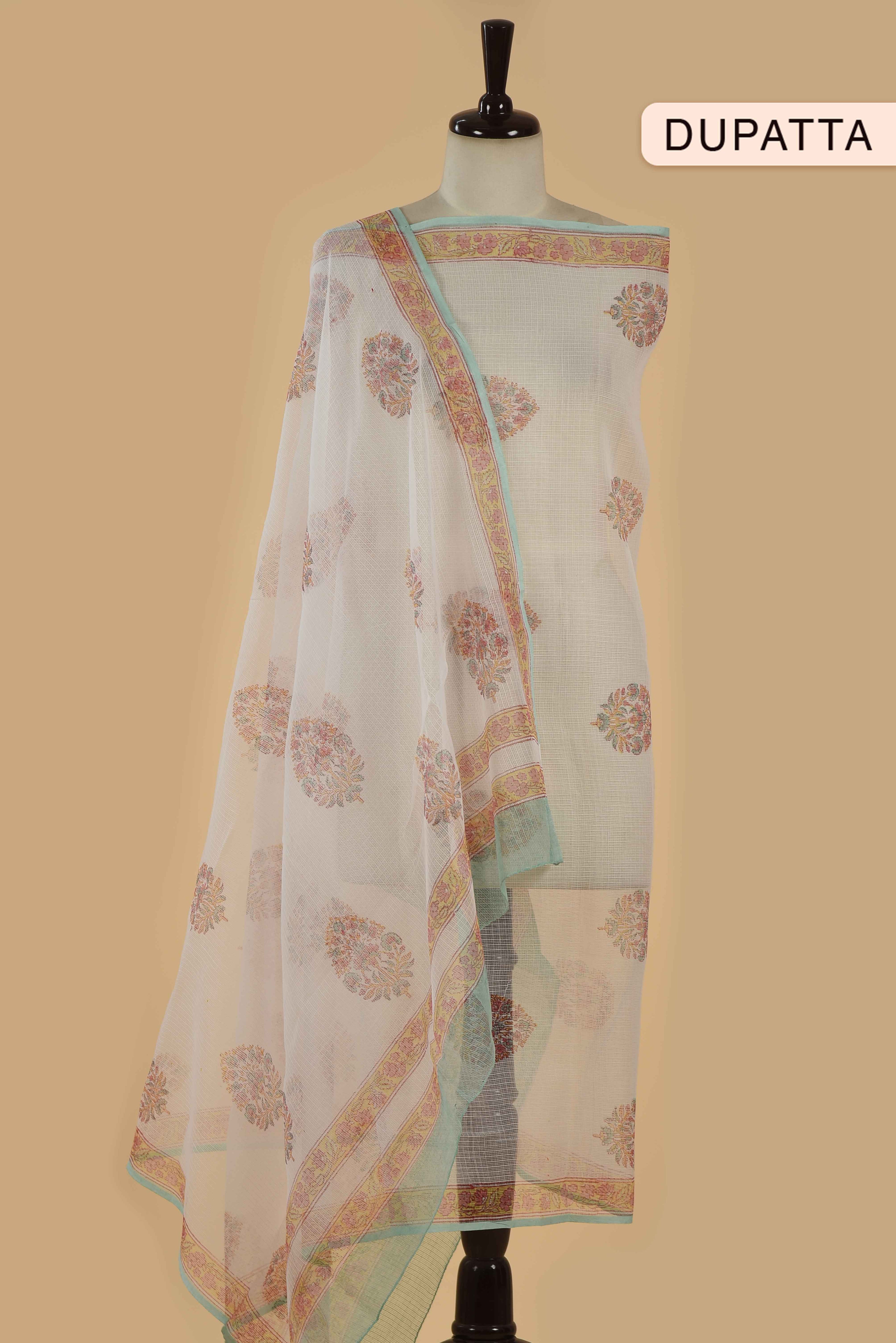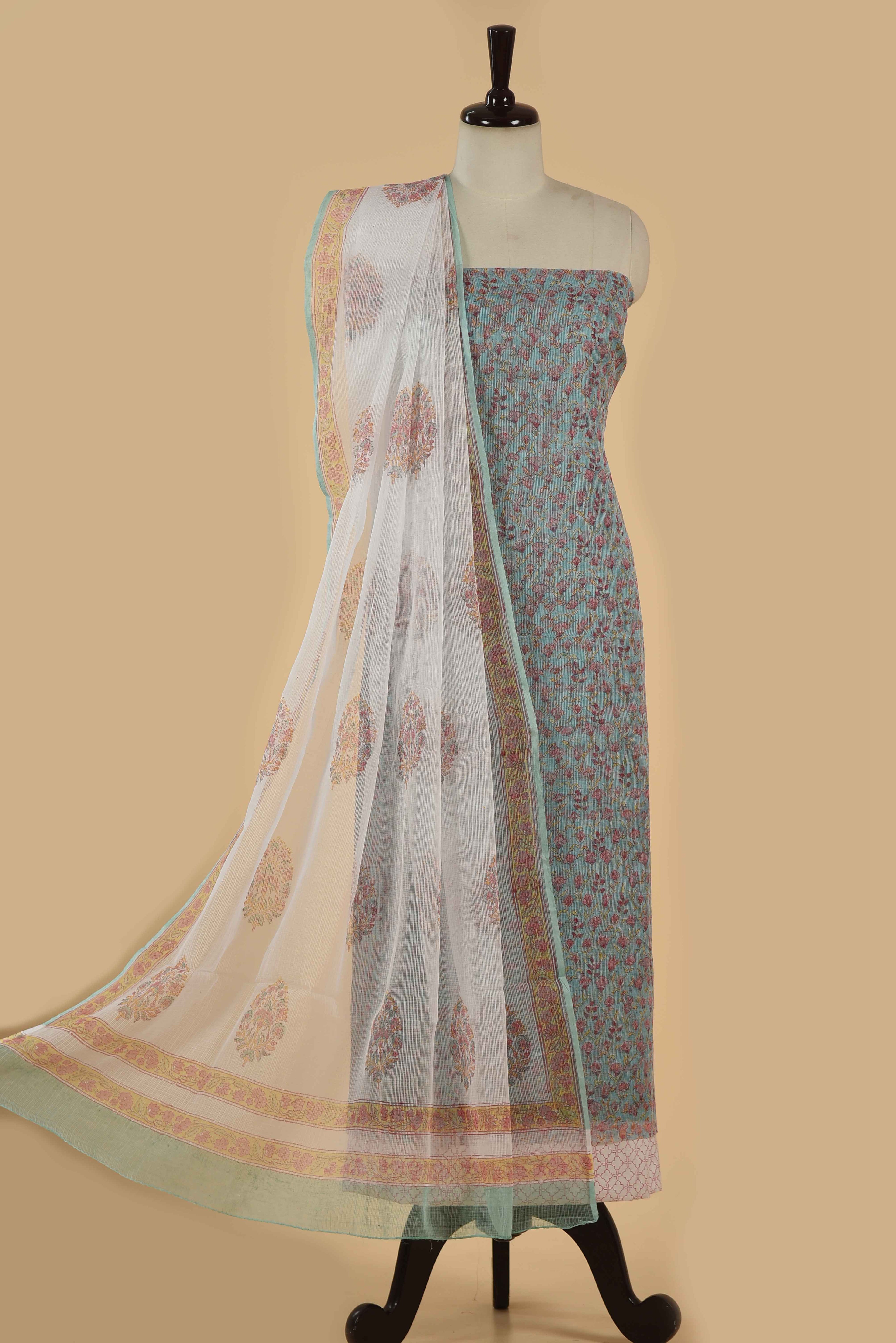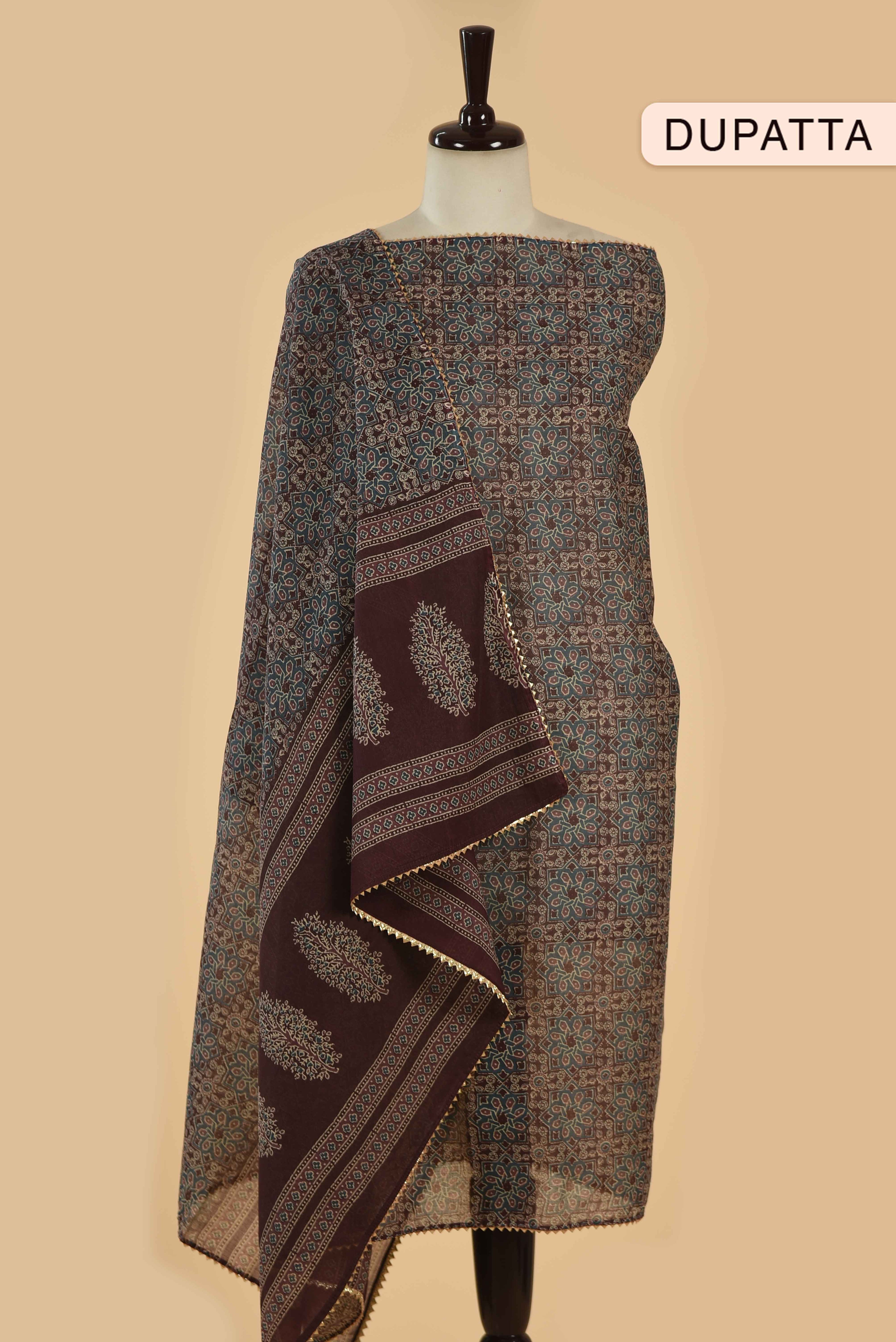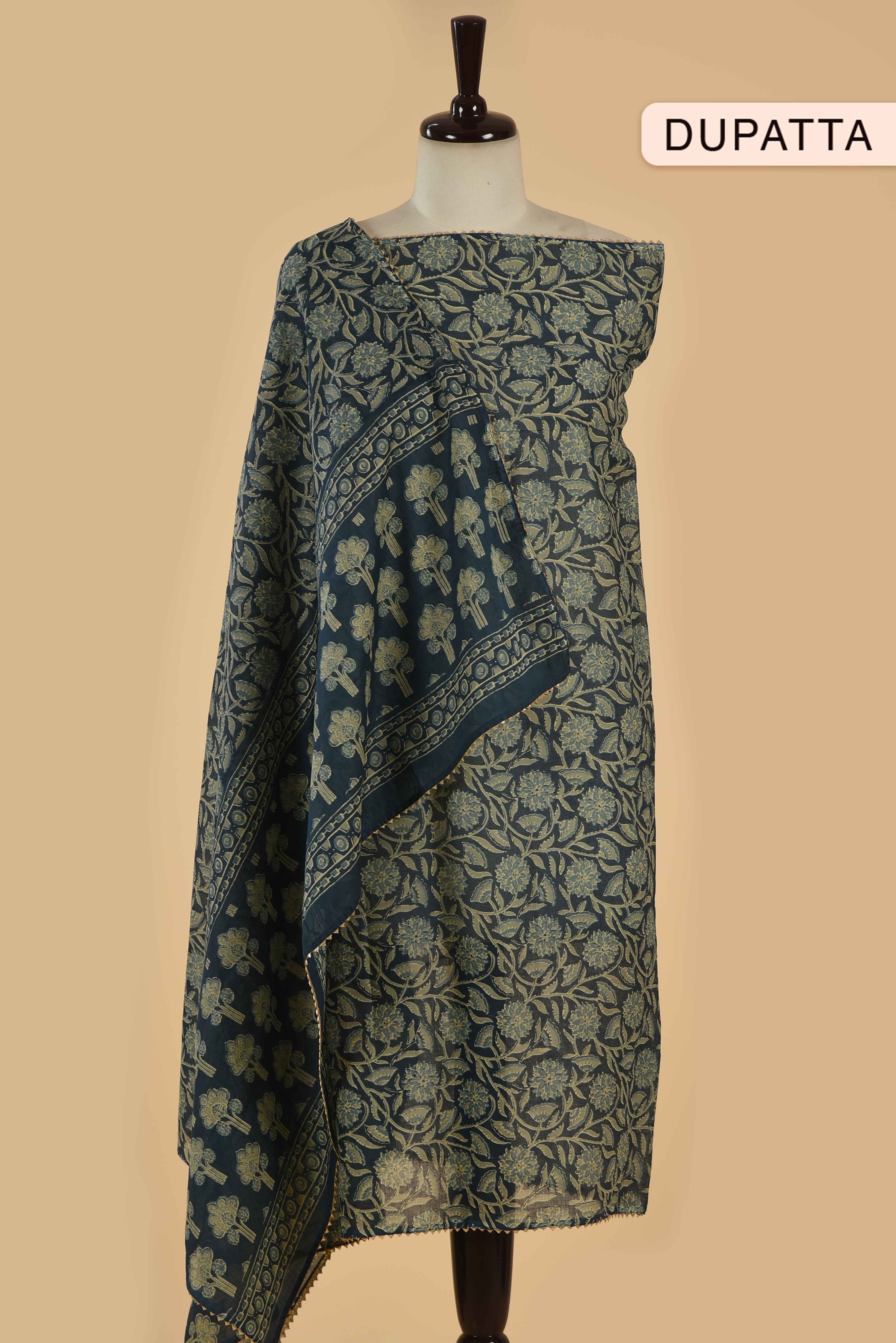 Black With Green Kota Hand Block Printed Unstitched Suit Fabric Set With Kota Hand Block Printed Dupatta
