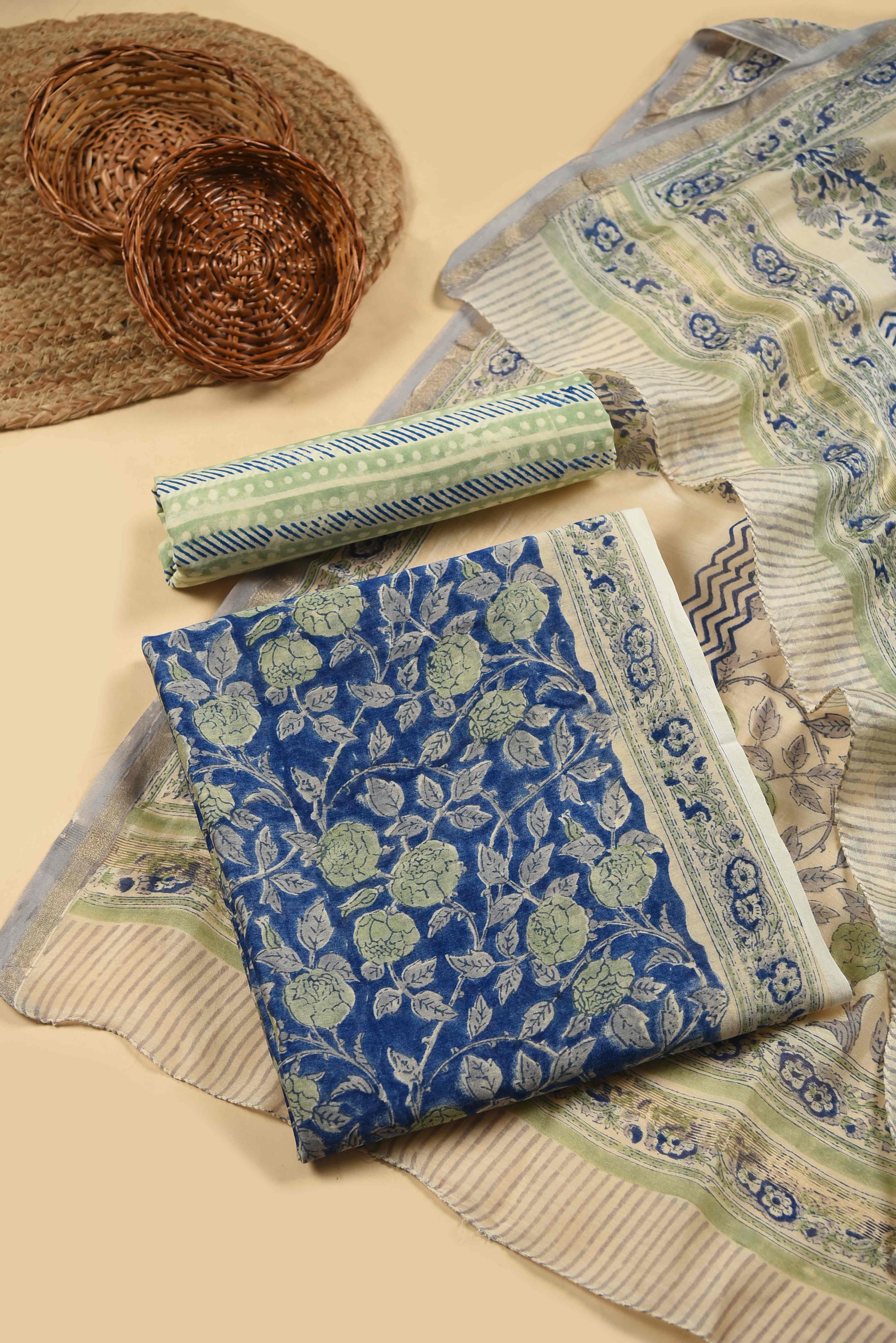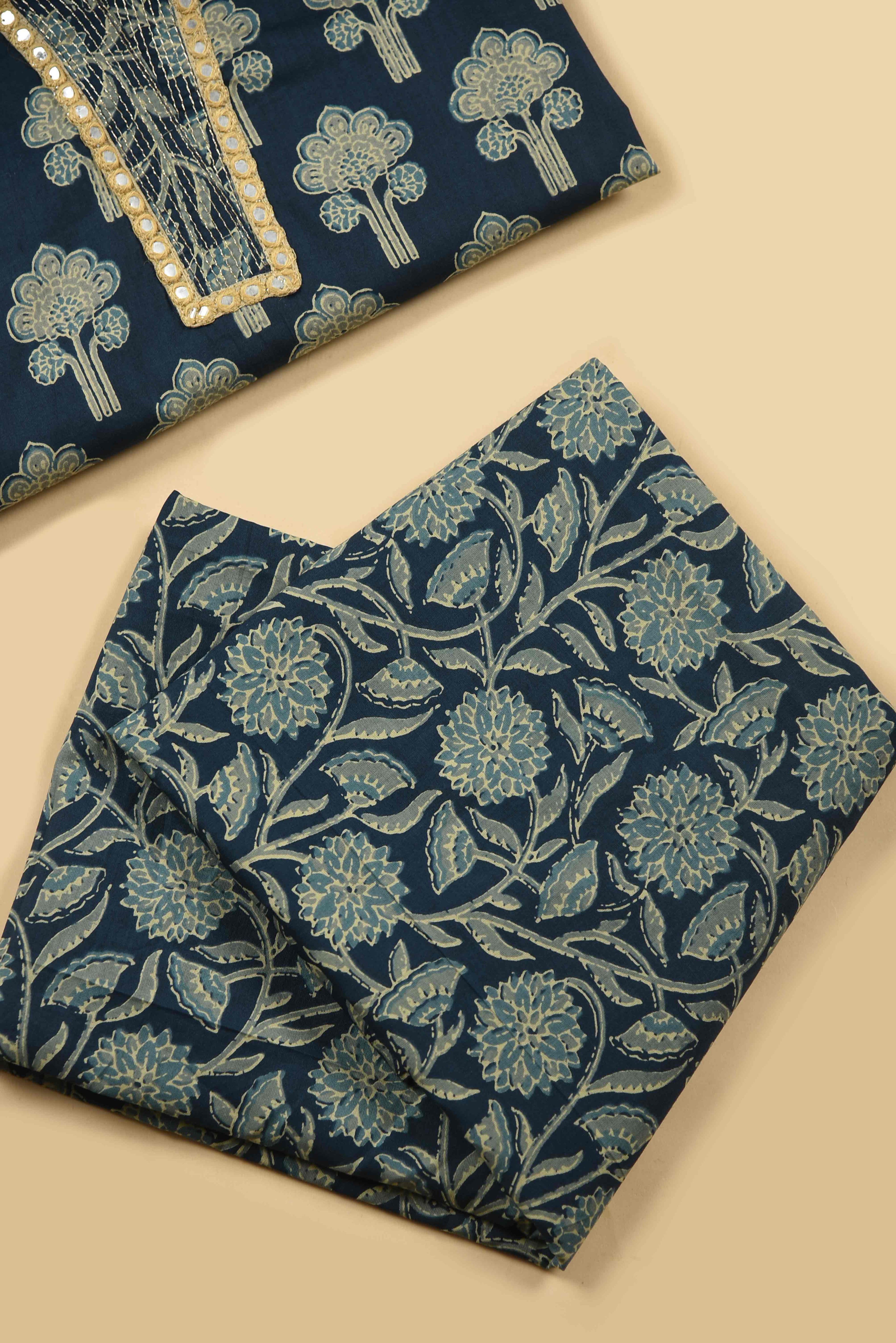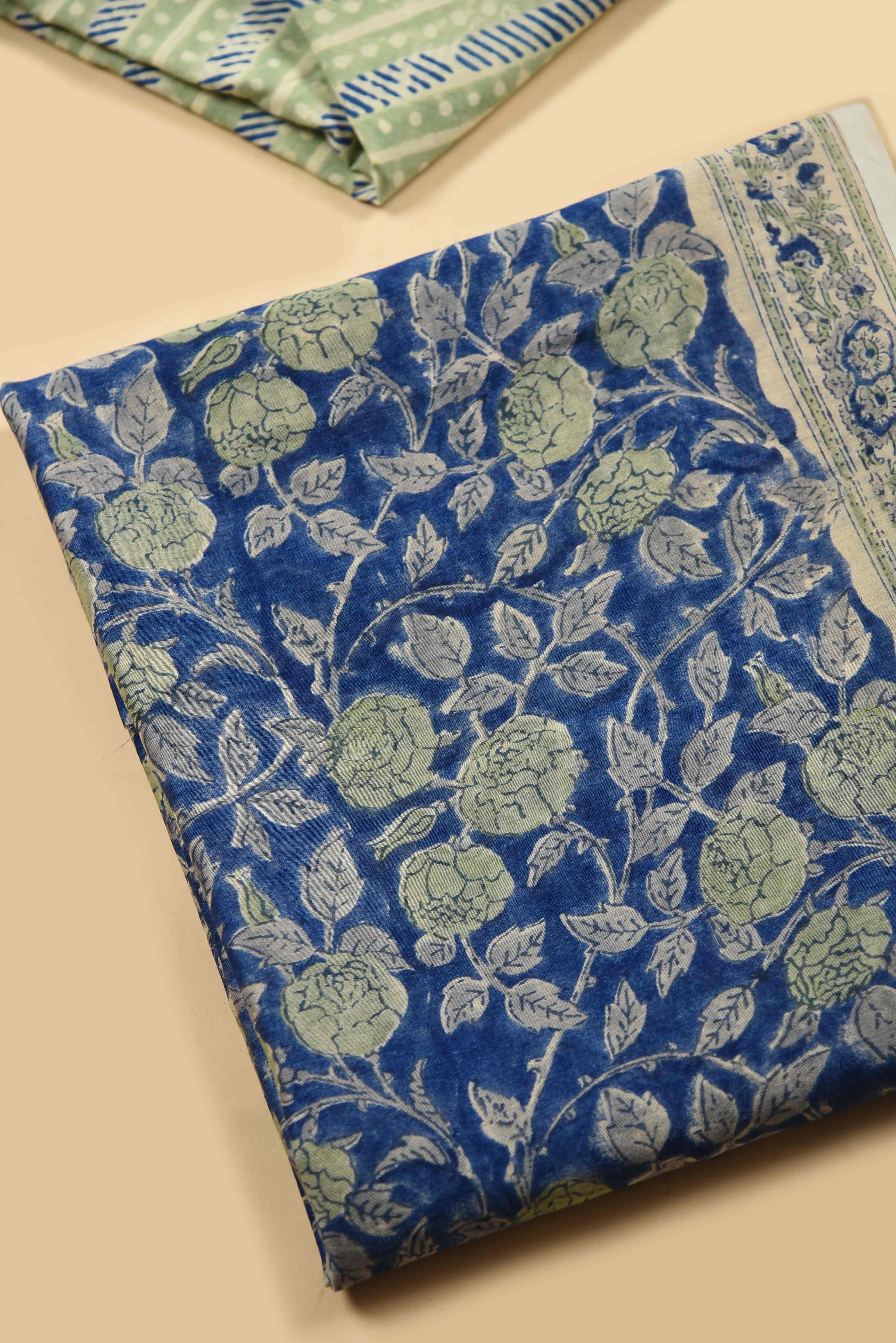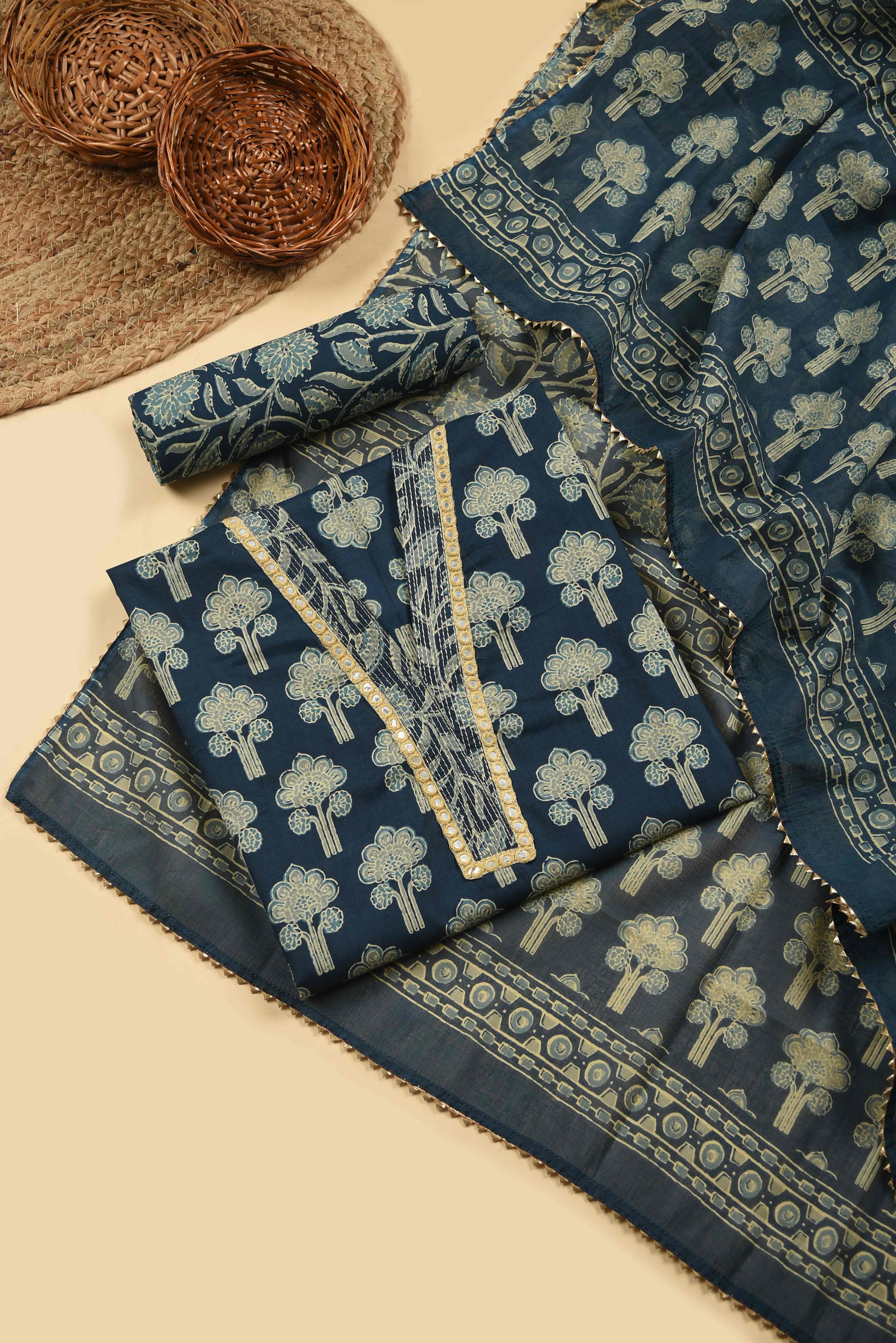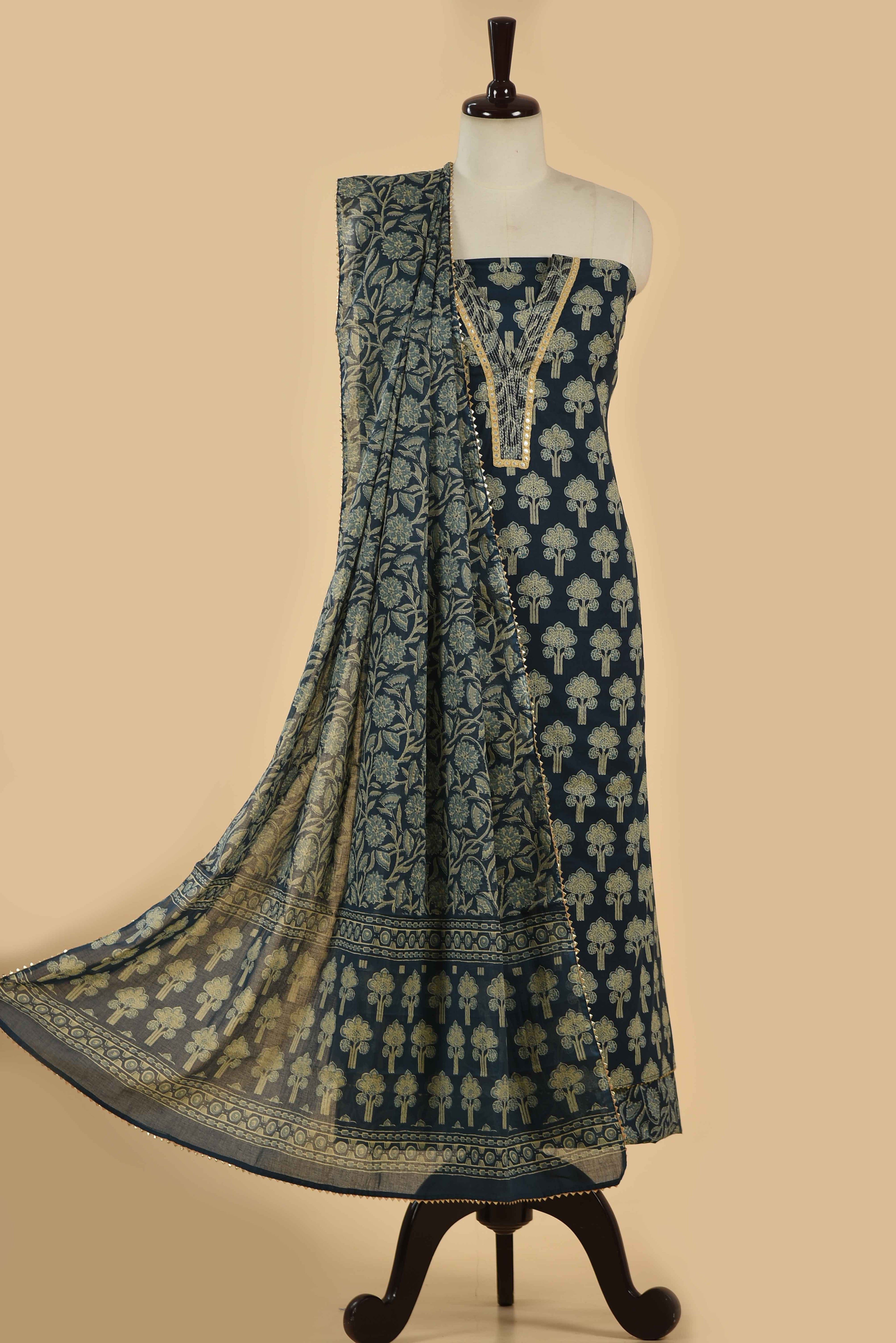 Blue Pure Cotton Printed With Lace Work Unstitched Suit Fabric Set With Cotton Printed Dupatta