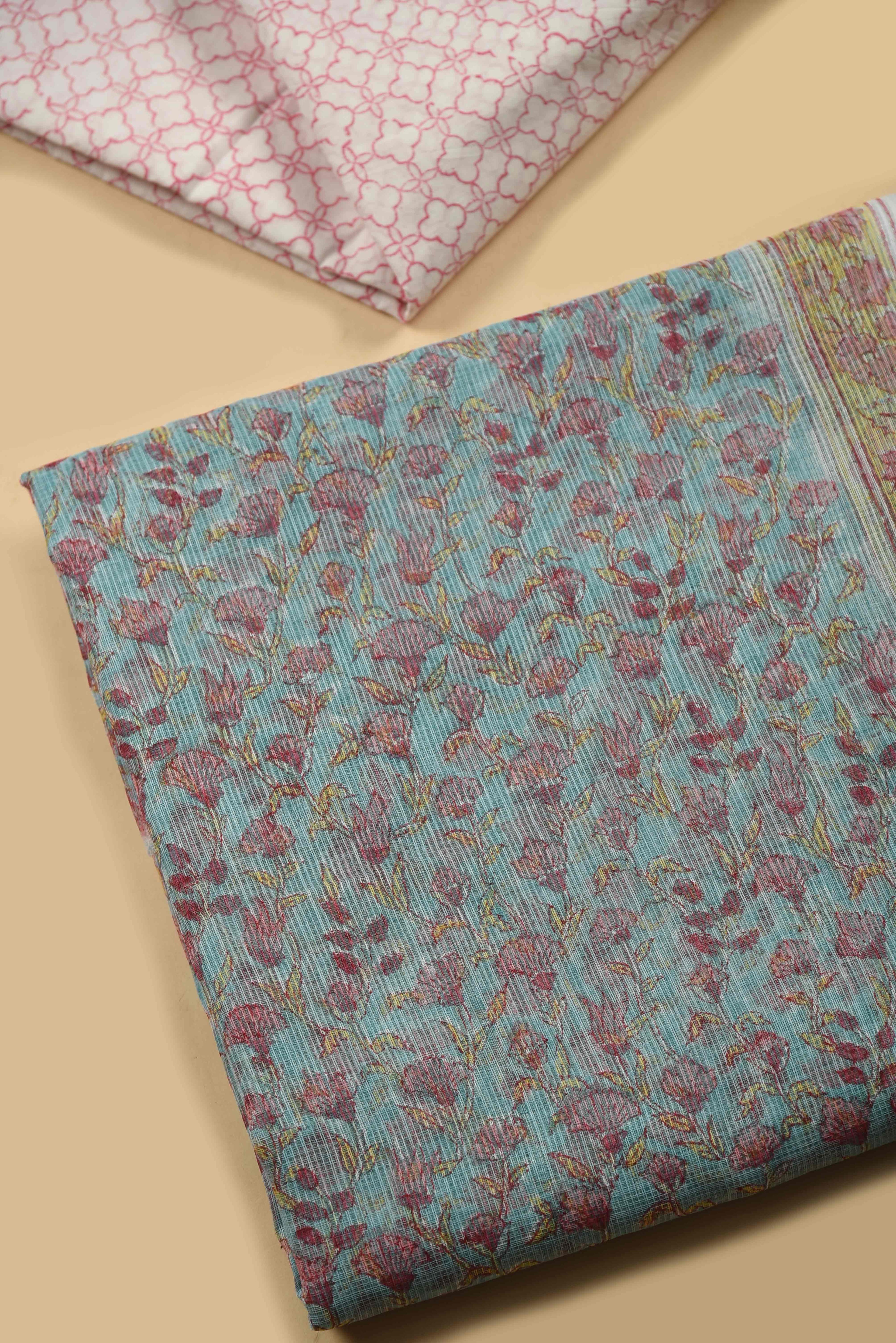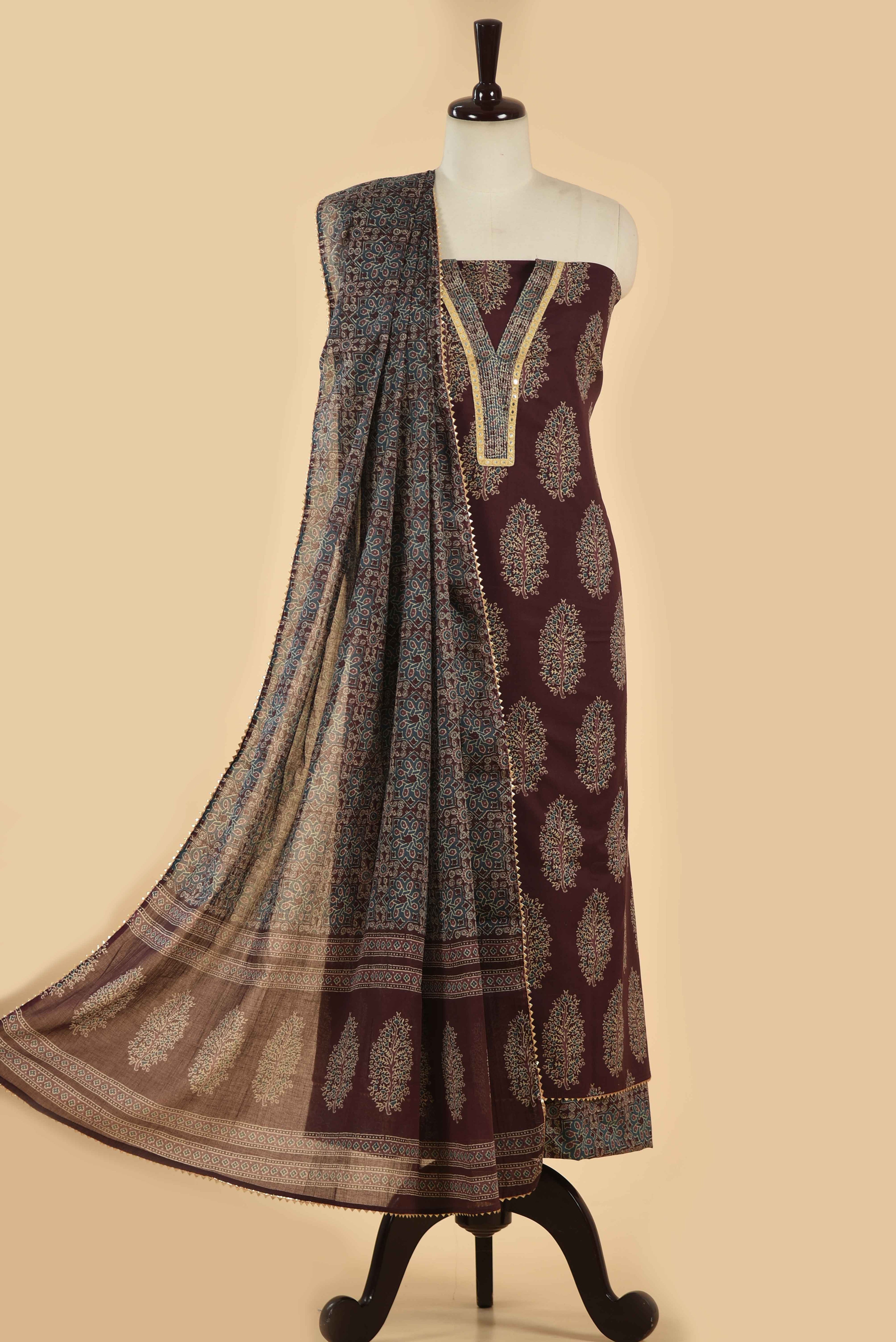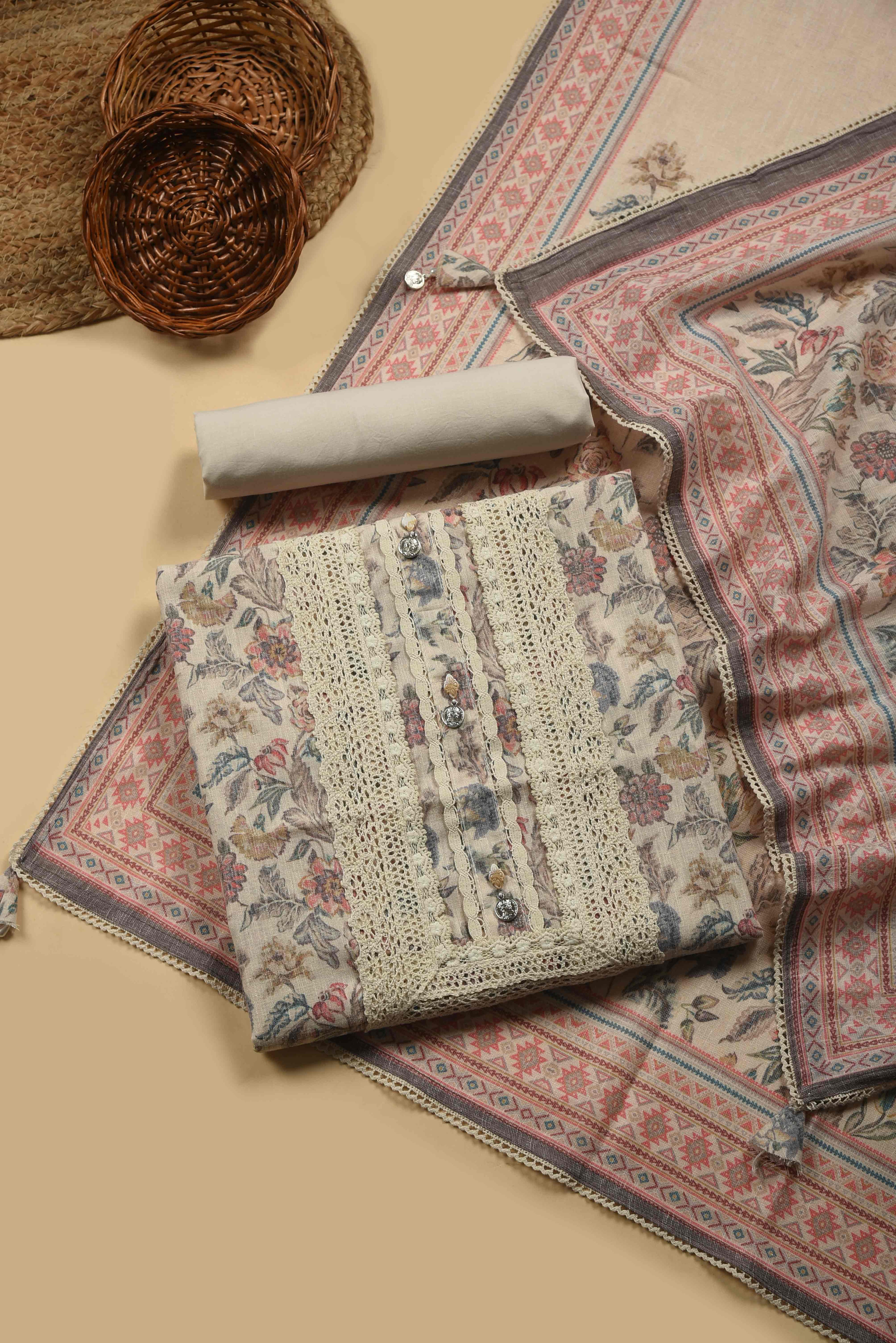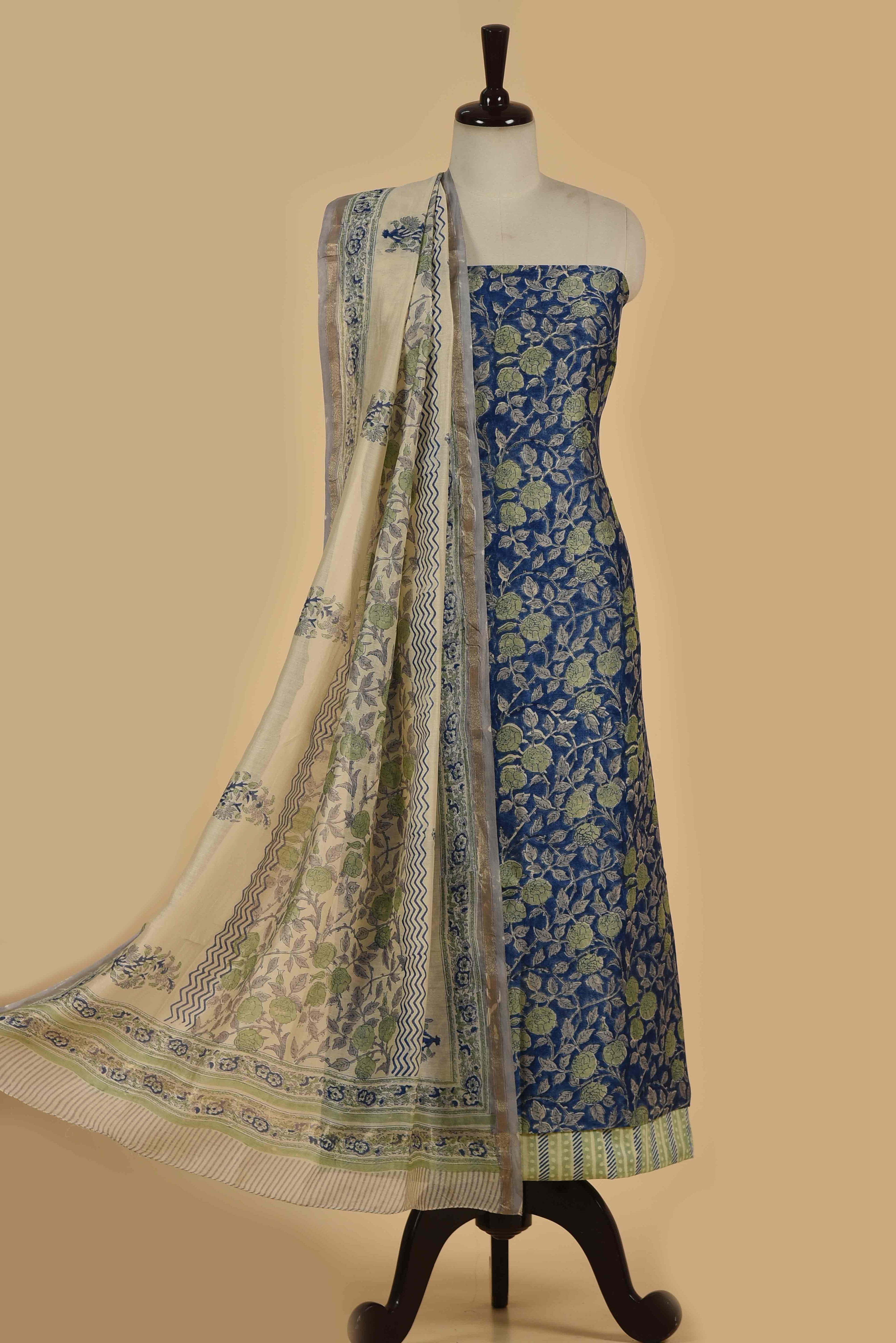 Blue Pure Cotton Printed With Lace Work Unstitched Suit Fabric Set With Cotton Printed Dupatta