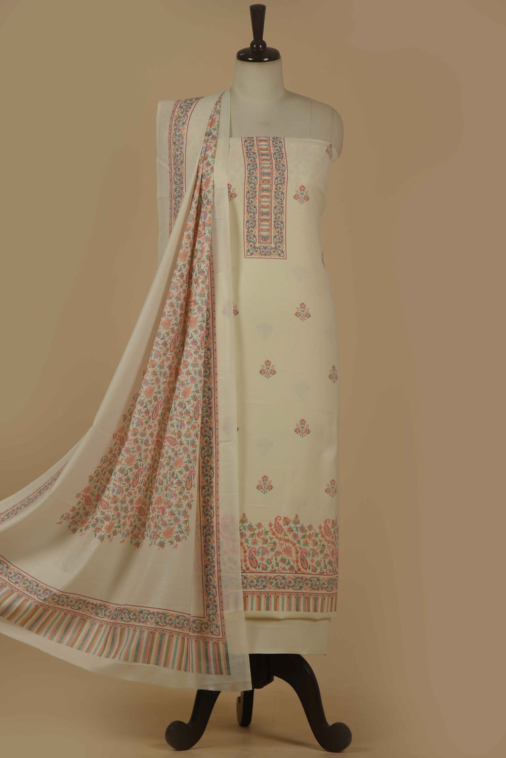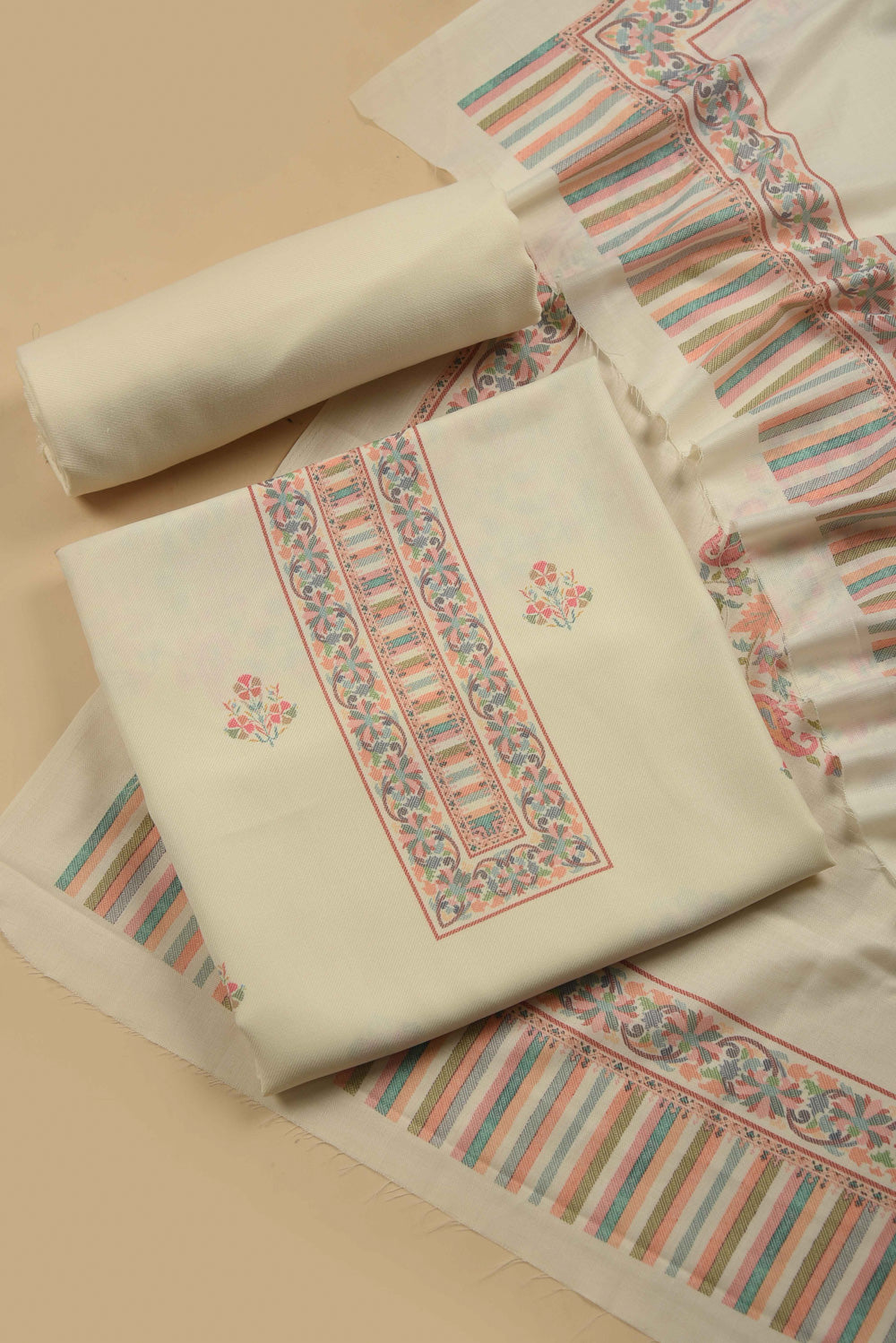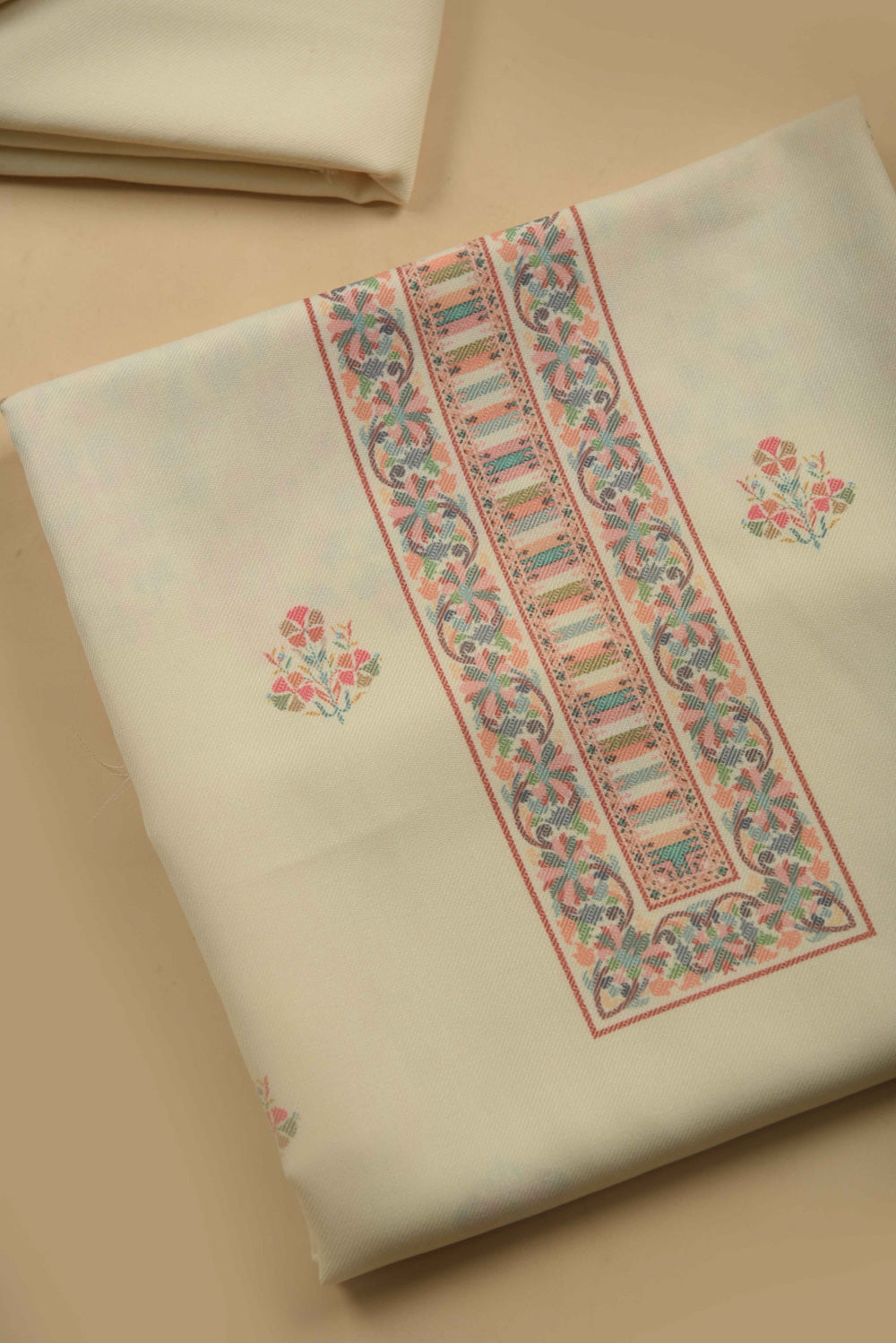 Cream Winter Wear Wool Spun Blend Printed Unstitched Suit Fabric Set With Wool Spun Blend Printed Dupatta