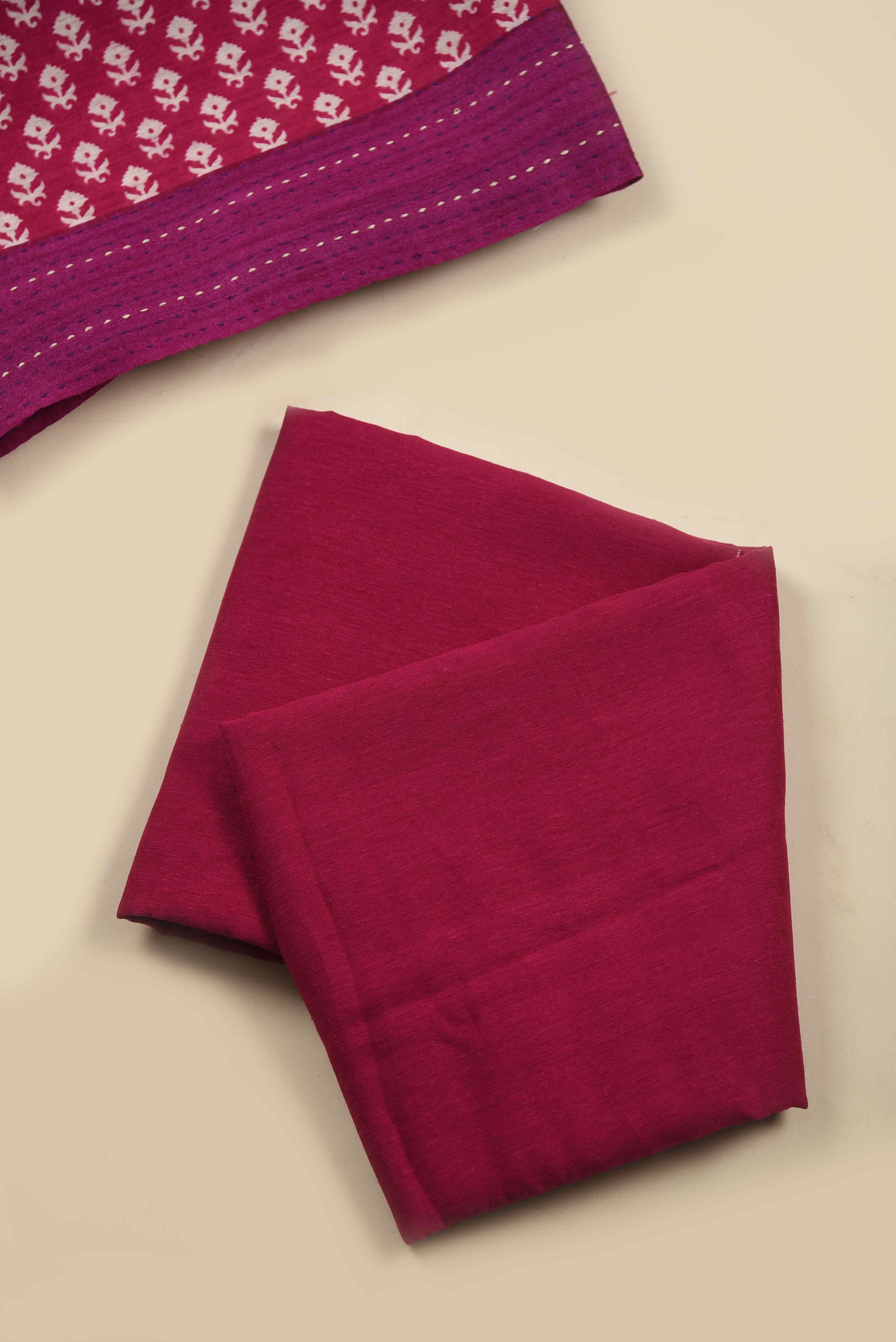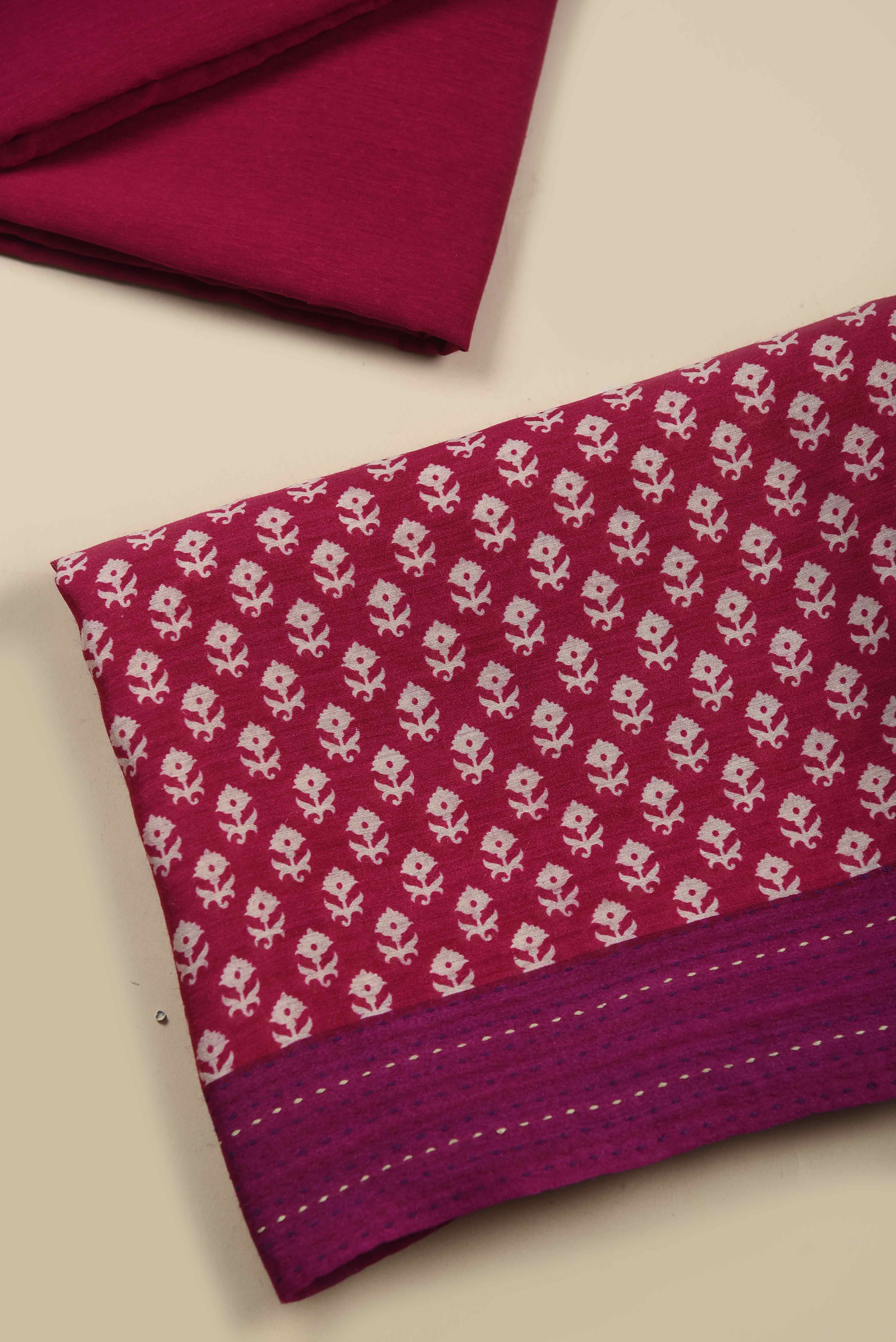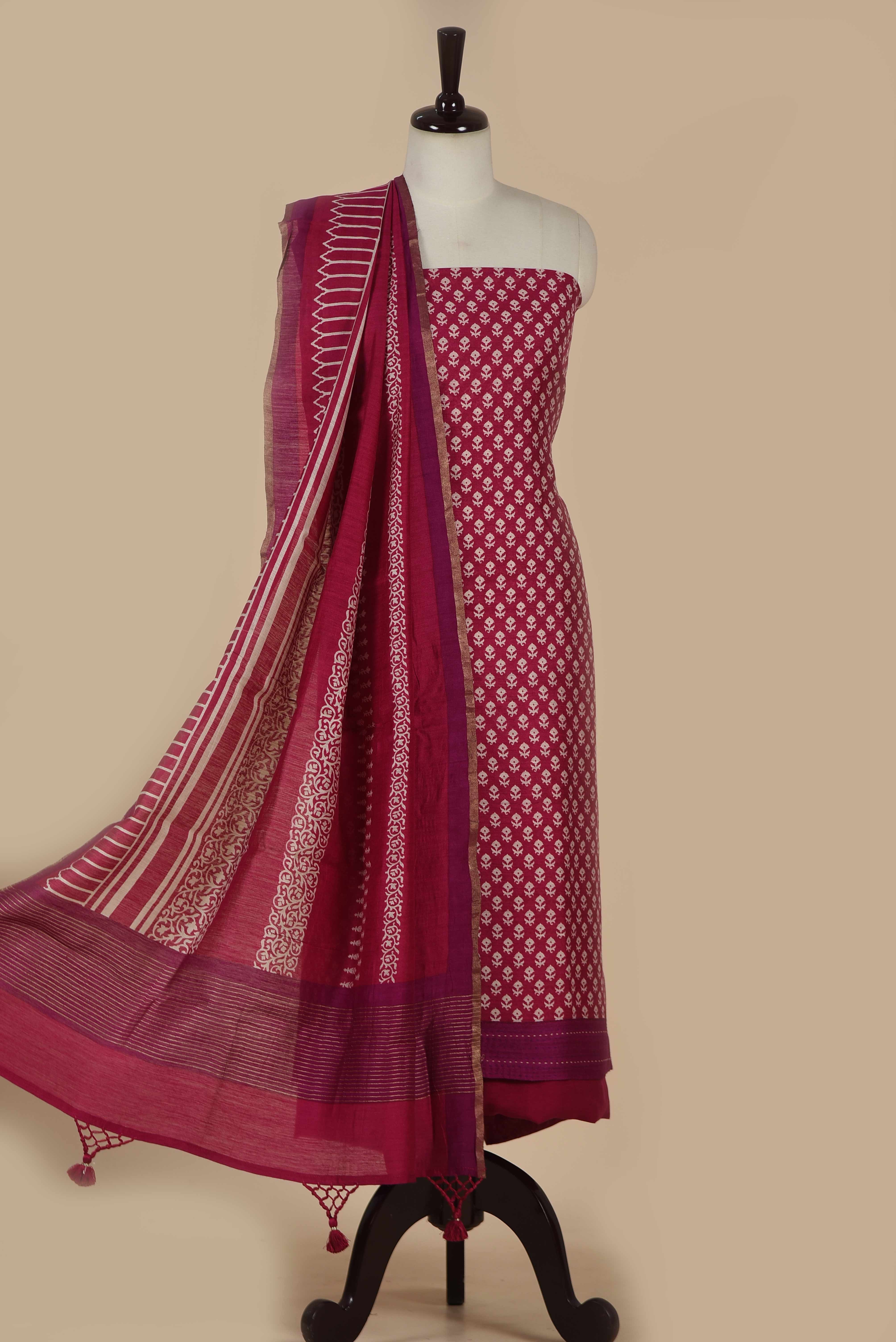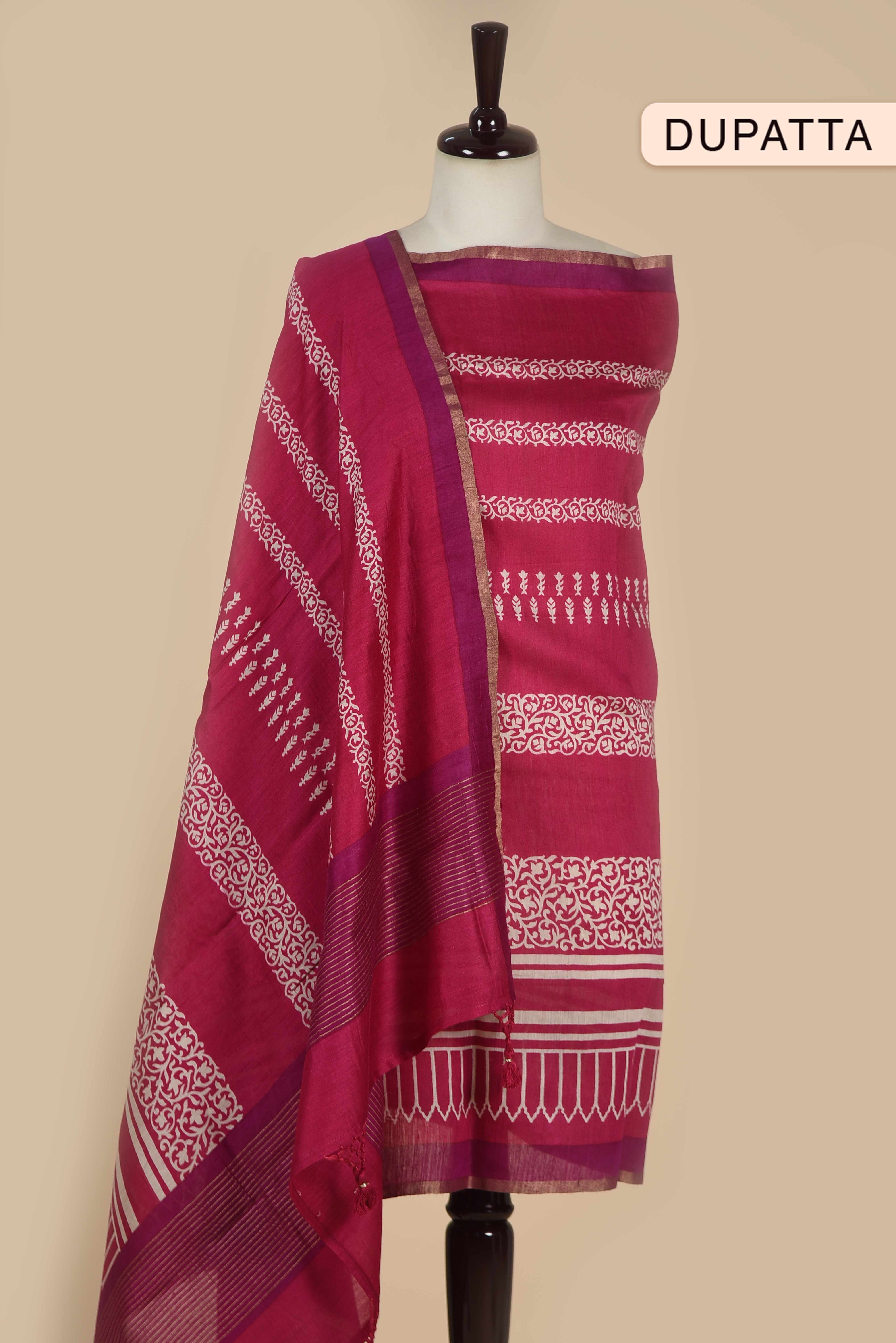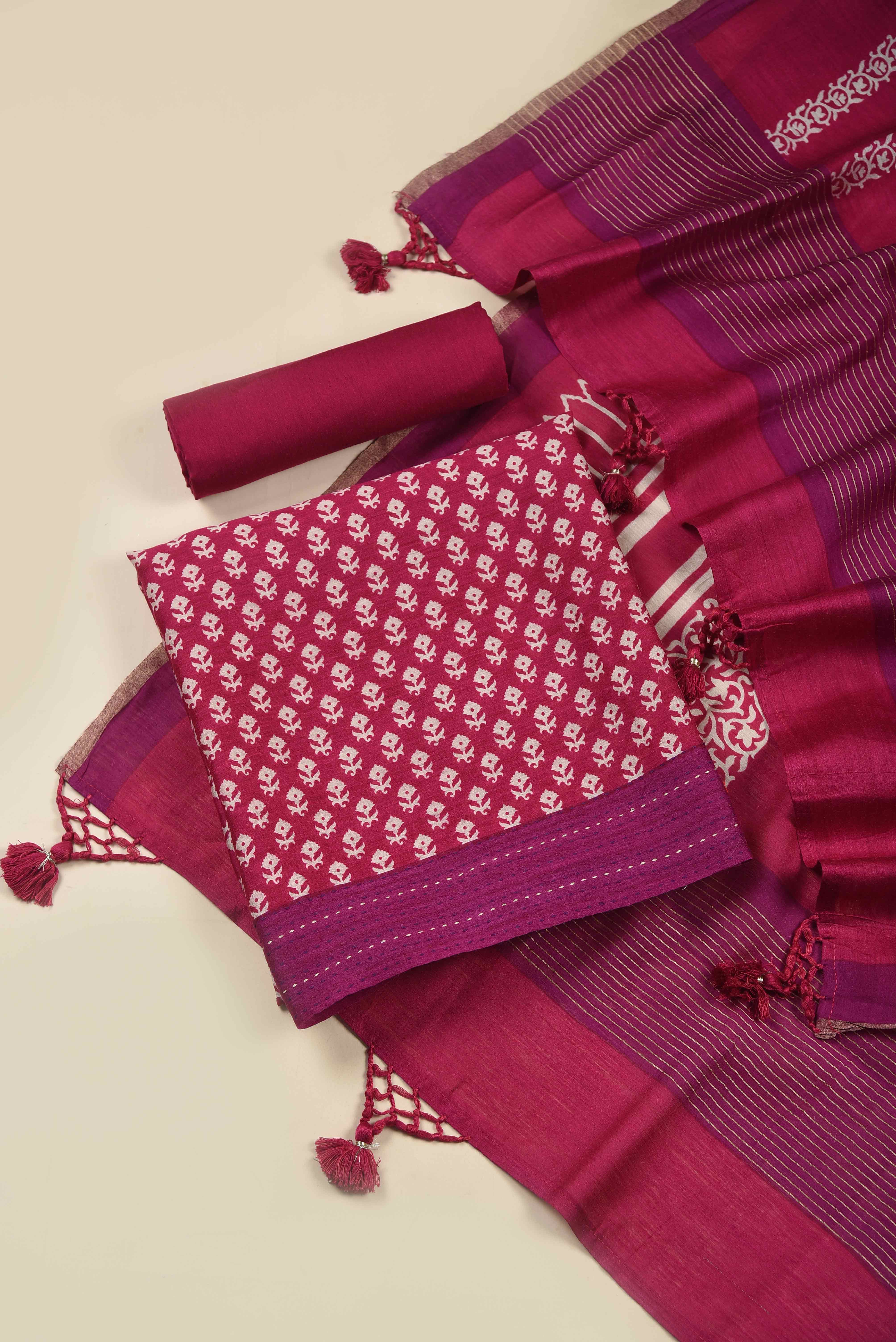 Deep Pink Handloom Silk Printed With Embroidery Unstitched Suit Fabric Set With Handloom Silk Dupatta