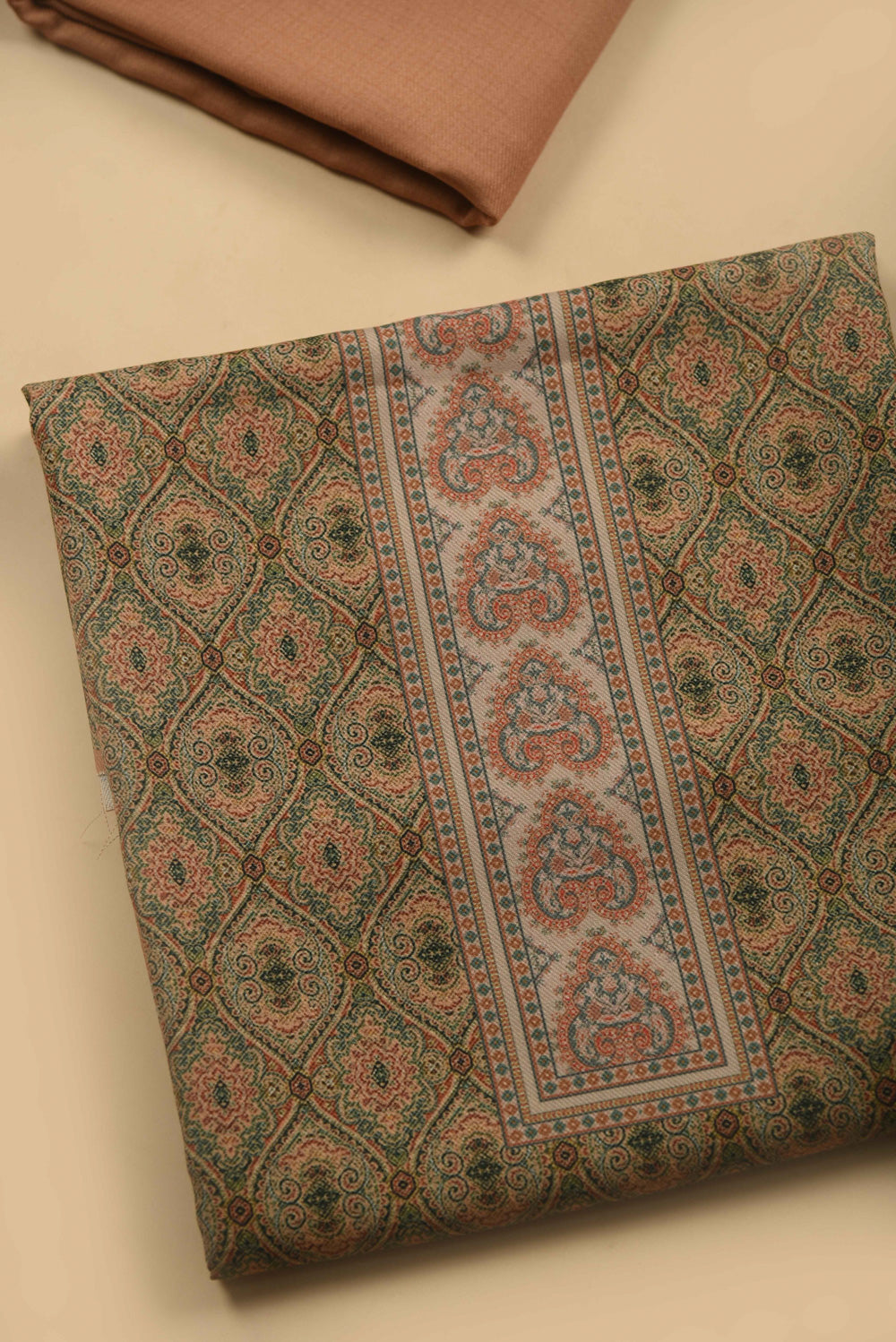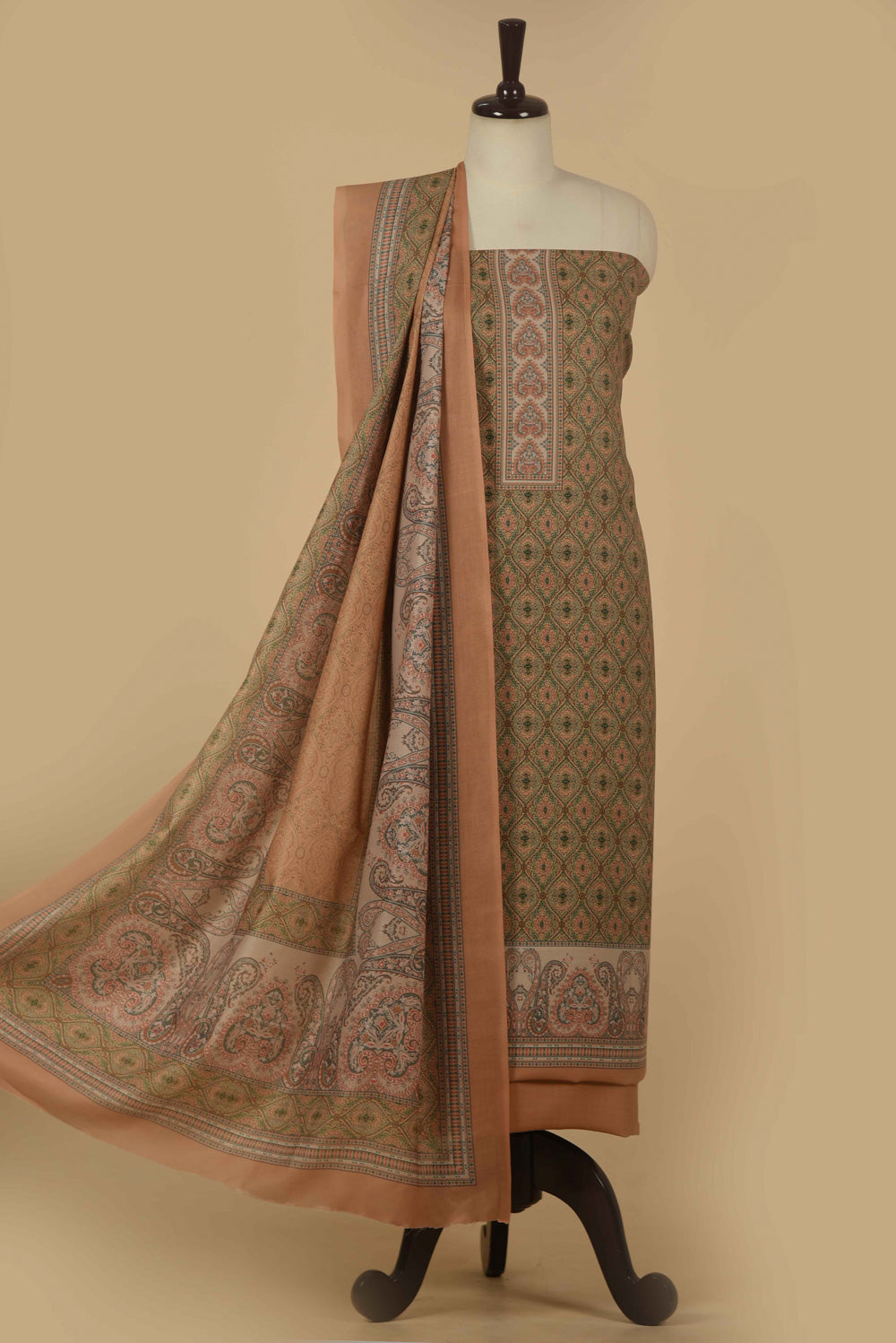 Green With Mustard Winter Wear Wool Spun Blend Printed Unstitched Suit Fabric Set With Wool Spun Blend Printed Dupatta