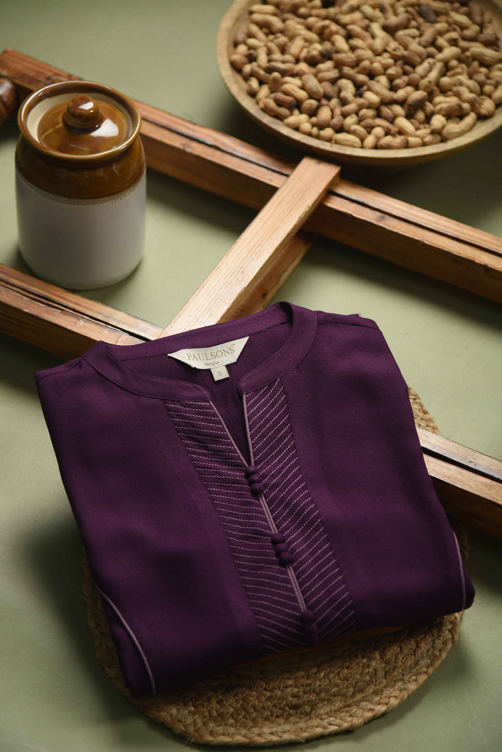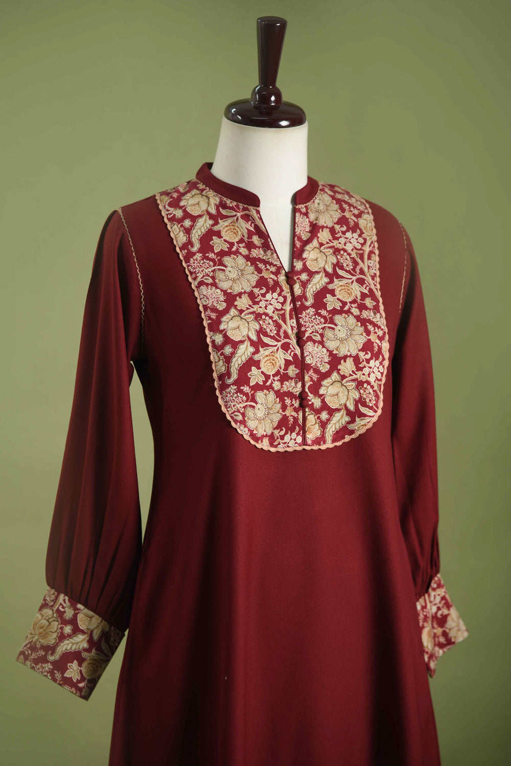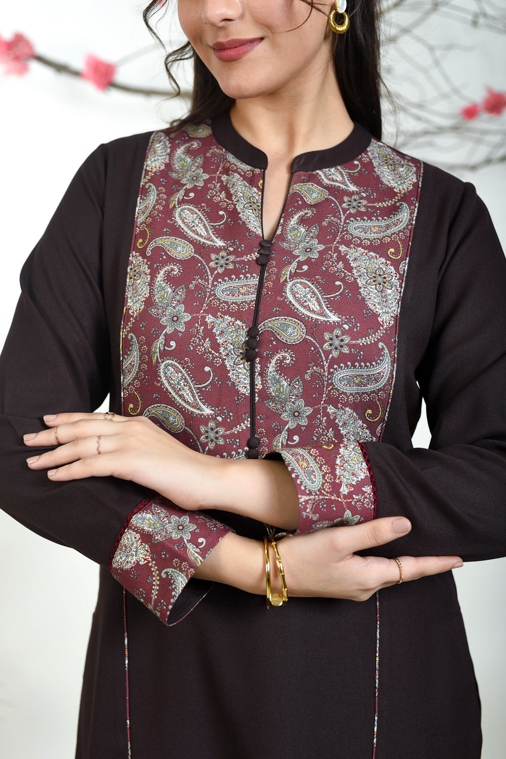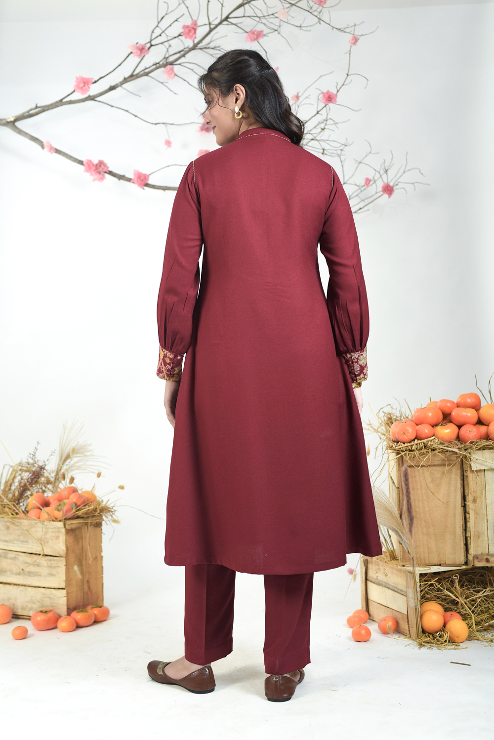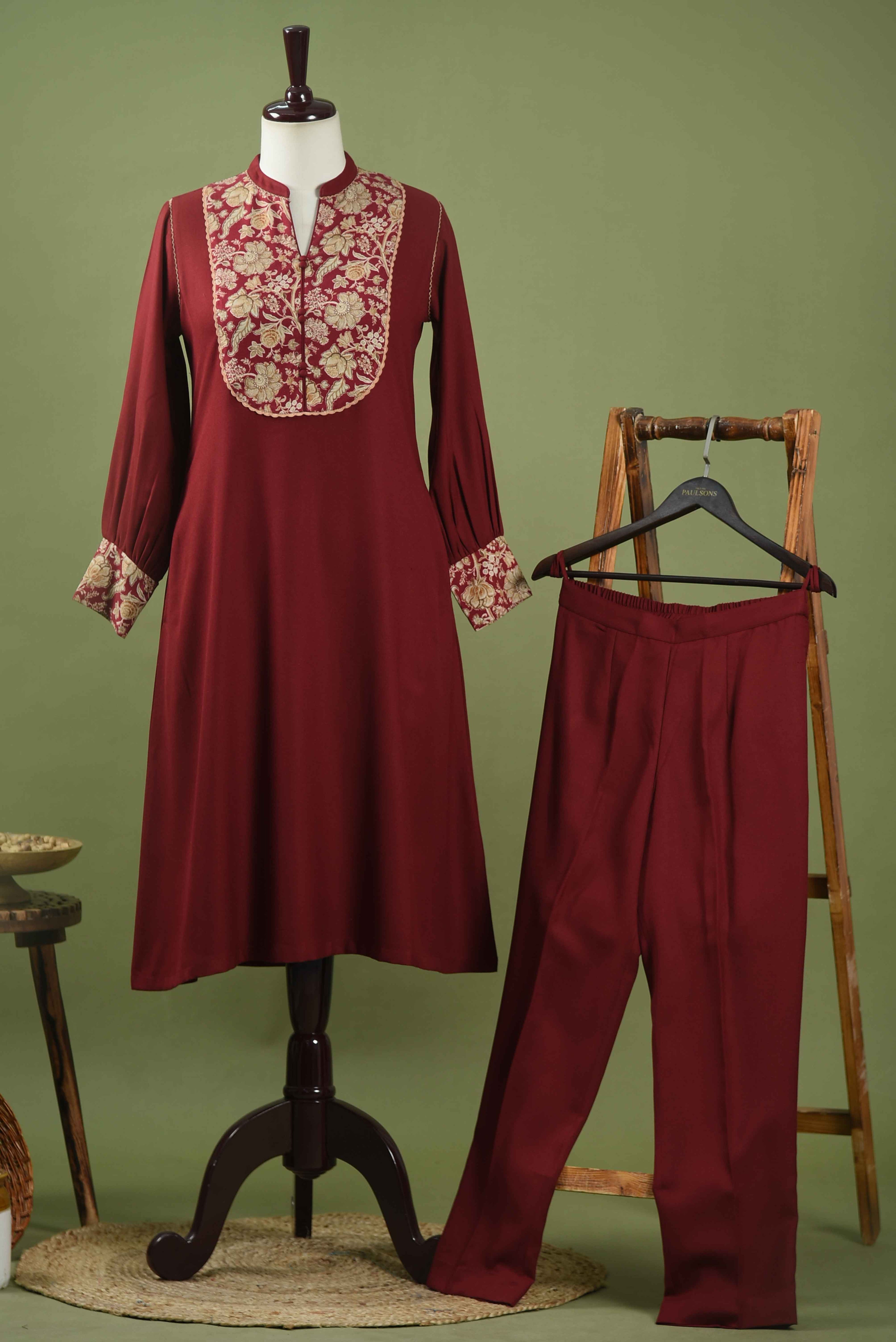 Maroon And Beige Panel Winter Wear Wool Spun Blend With Front Patti Kurta Set-Regular Fit