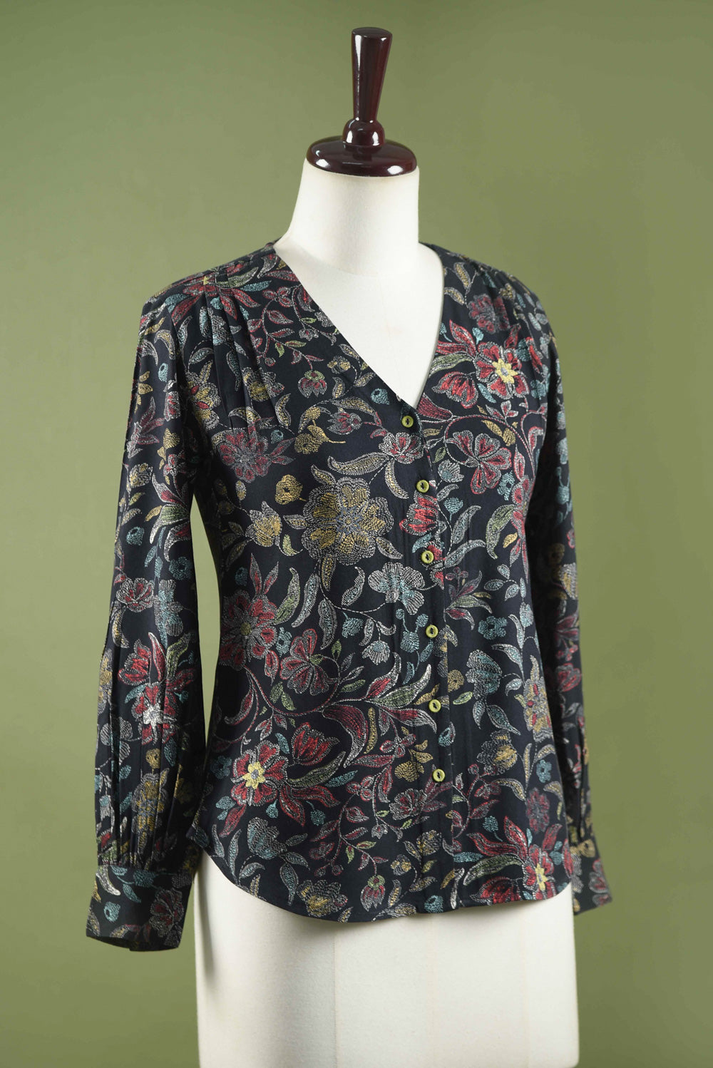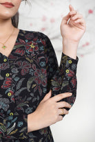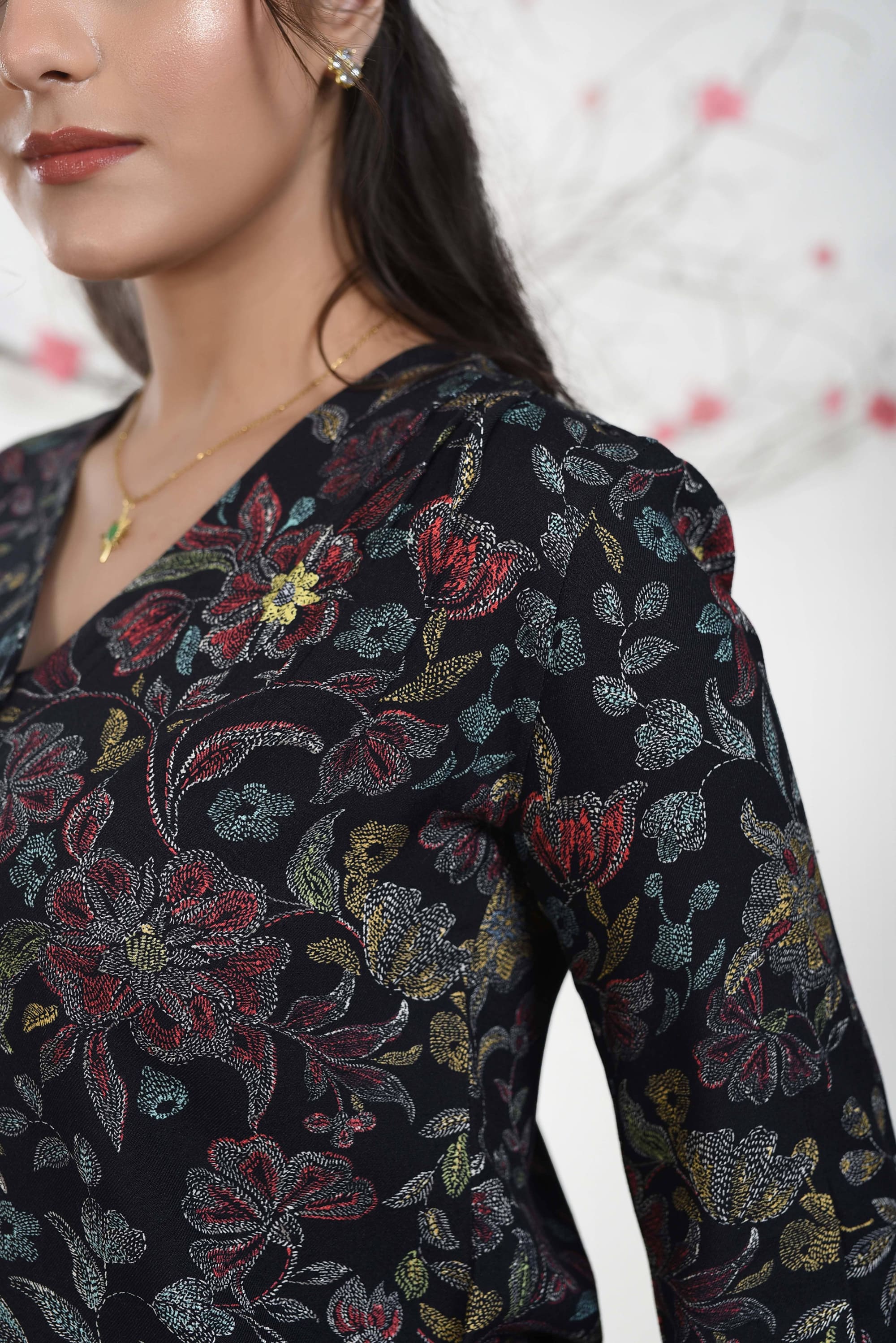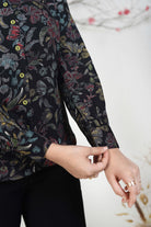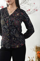 Black Floral printed shirt in breathable winter wear wool spun fabric with kantha like print that gives classy touch.