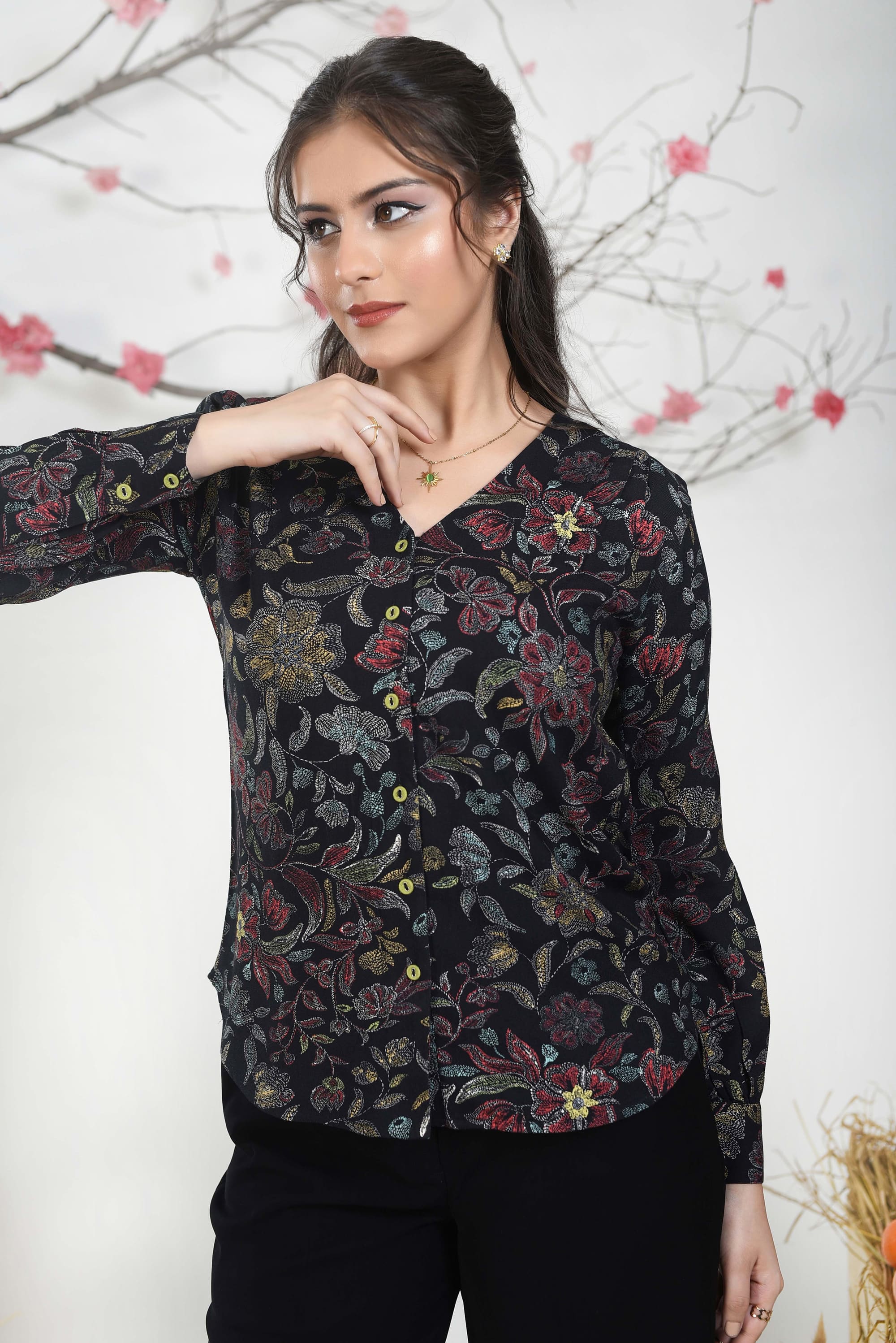 Black Winter Wear Wool Spun Blend Floral Print V-Neck Shirt-Regular Fit