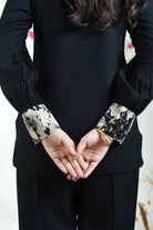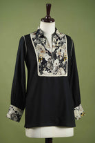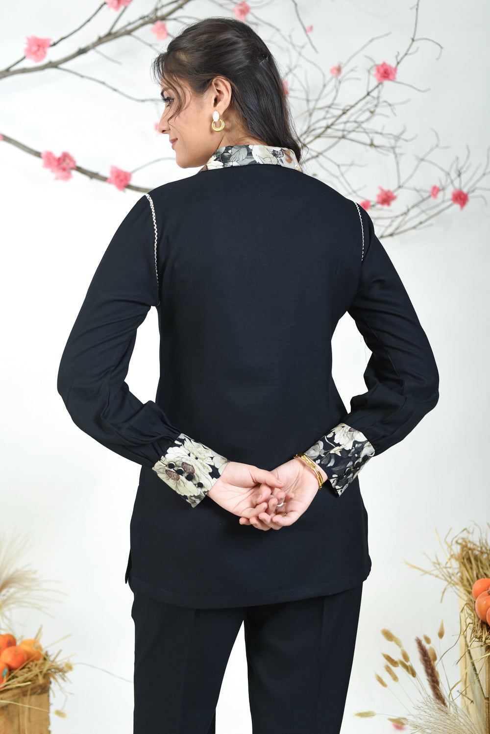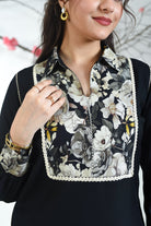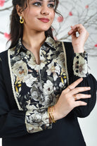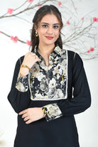 Black short kurti crafted from a wool spun blend, designed for winter comfort and style. Features a striking printed yoke panel at the front with coordinated cuffs in soft, muted tones.