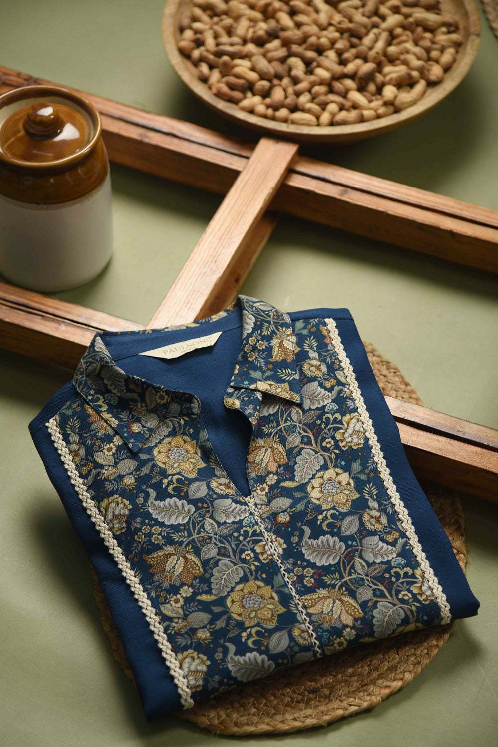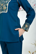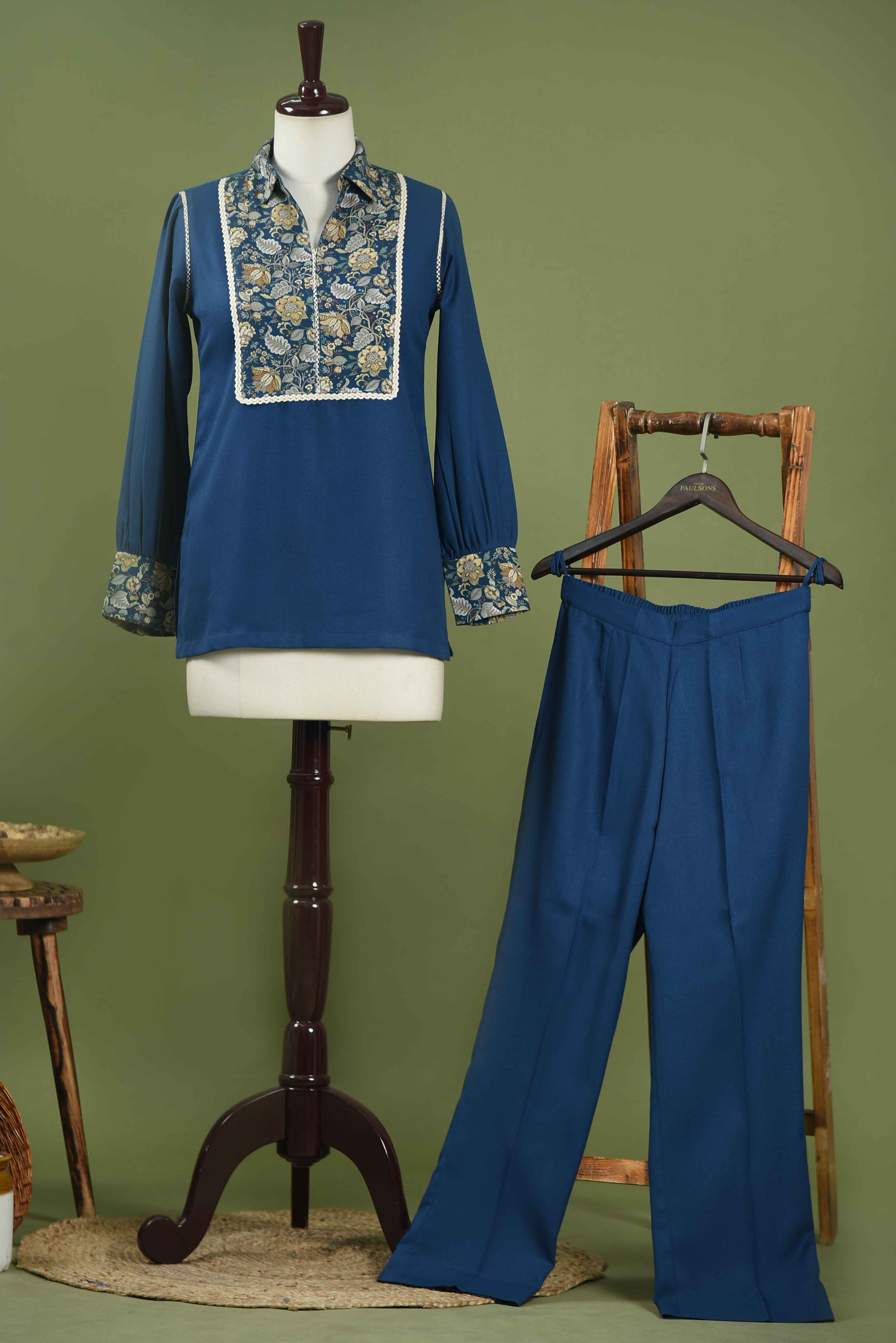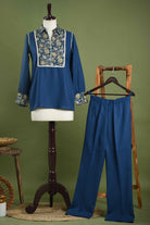 Blue Winter Wear Wool Spun Blend With Printed Yoke Co-ord Set-Regular Fit