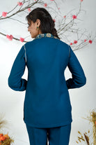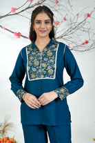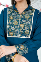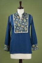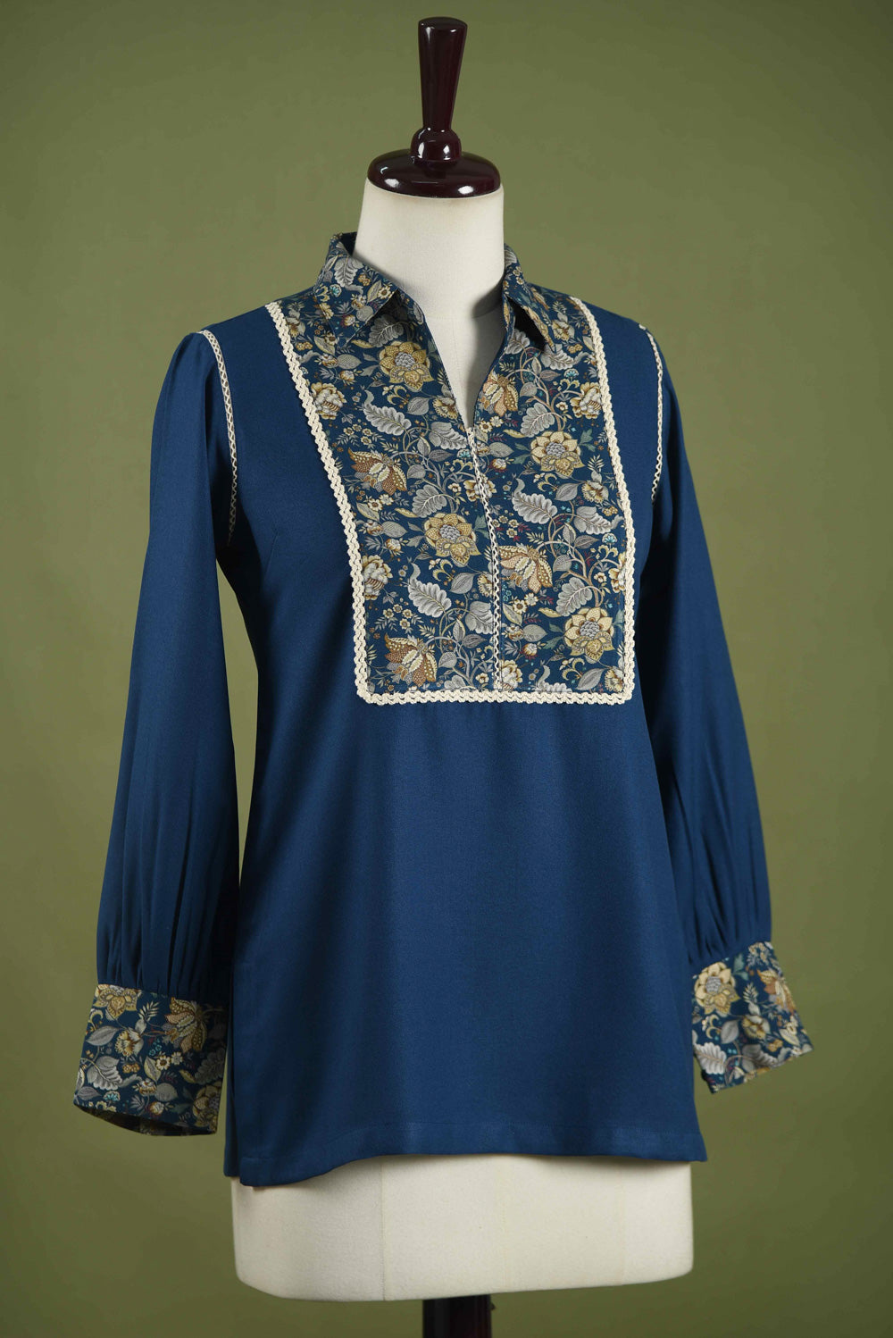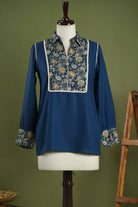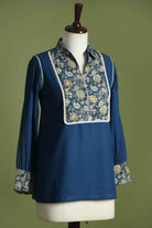 Blue short kurti crafted from a wool spun blend, designed for winter comfort and style. Features a striking printed yoke panel at the front with coordinated cuffs in soft, muted tones.