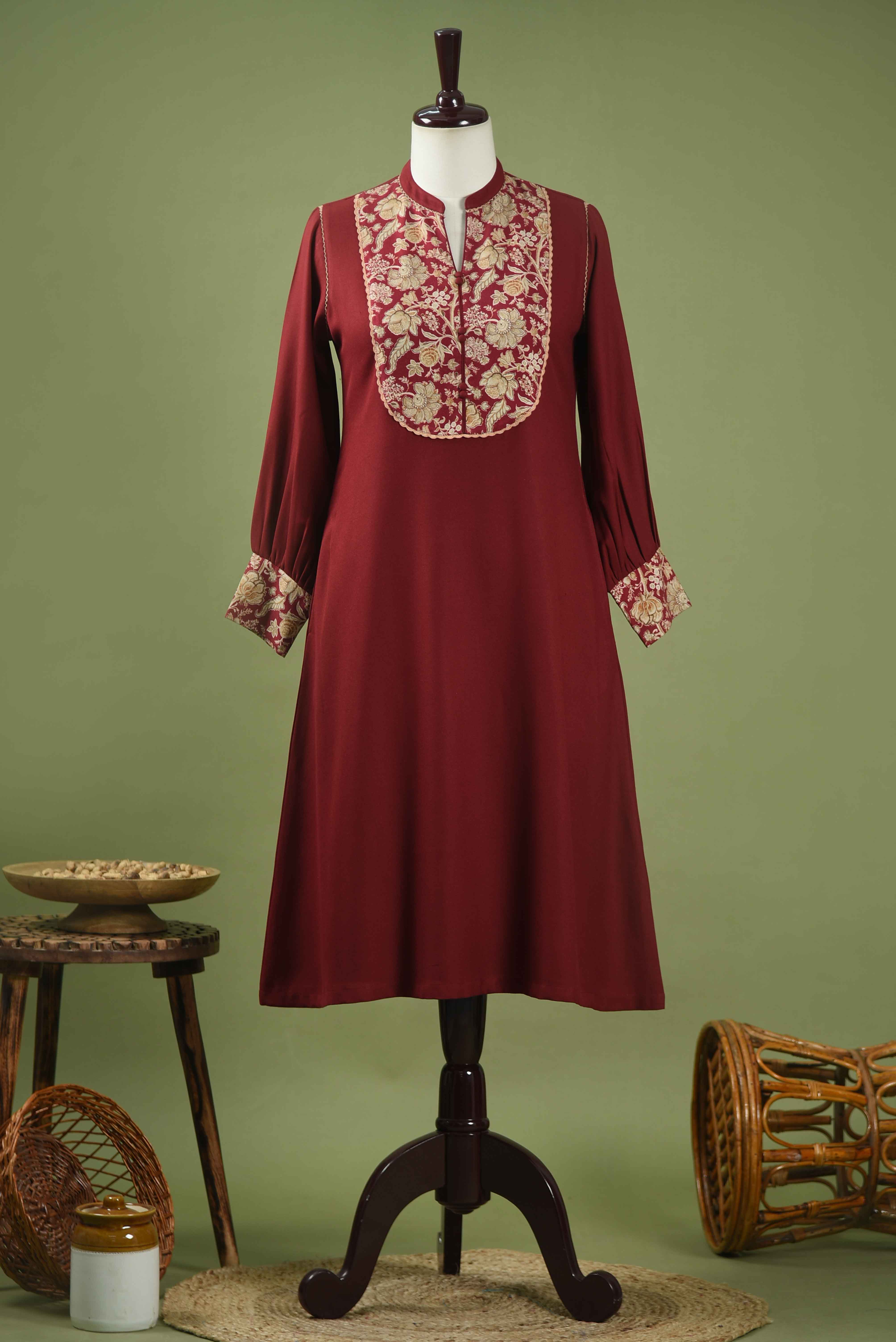 Maroon With Printed Yoke Winter Wear Wool Spun Blend A-Line Kurta Set-Regular Fit
