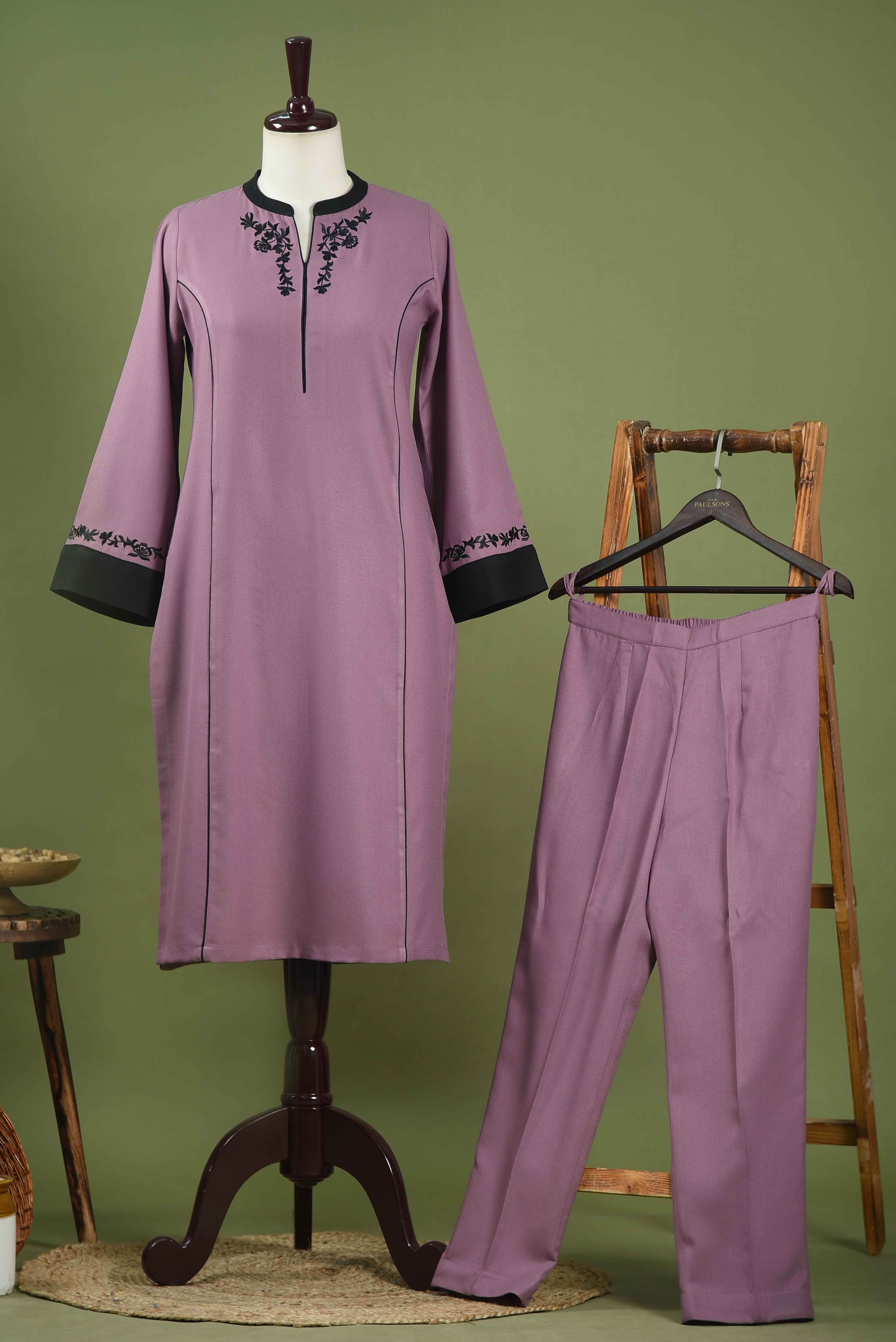 Mauve And Black Winter Wear Wool Spun Blend Floral Embroidered Kurta Set-Regular Fit