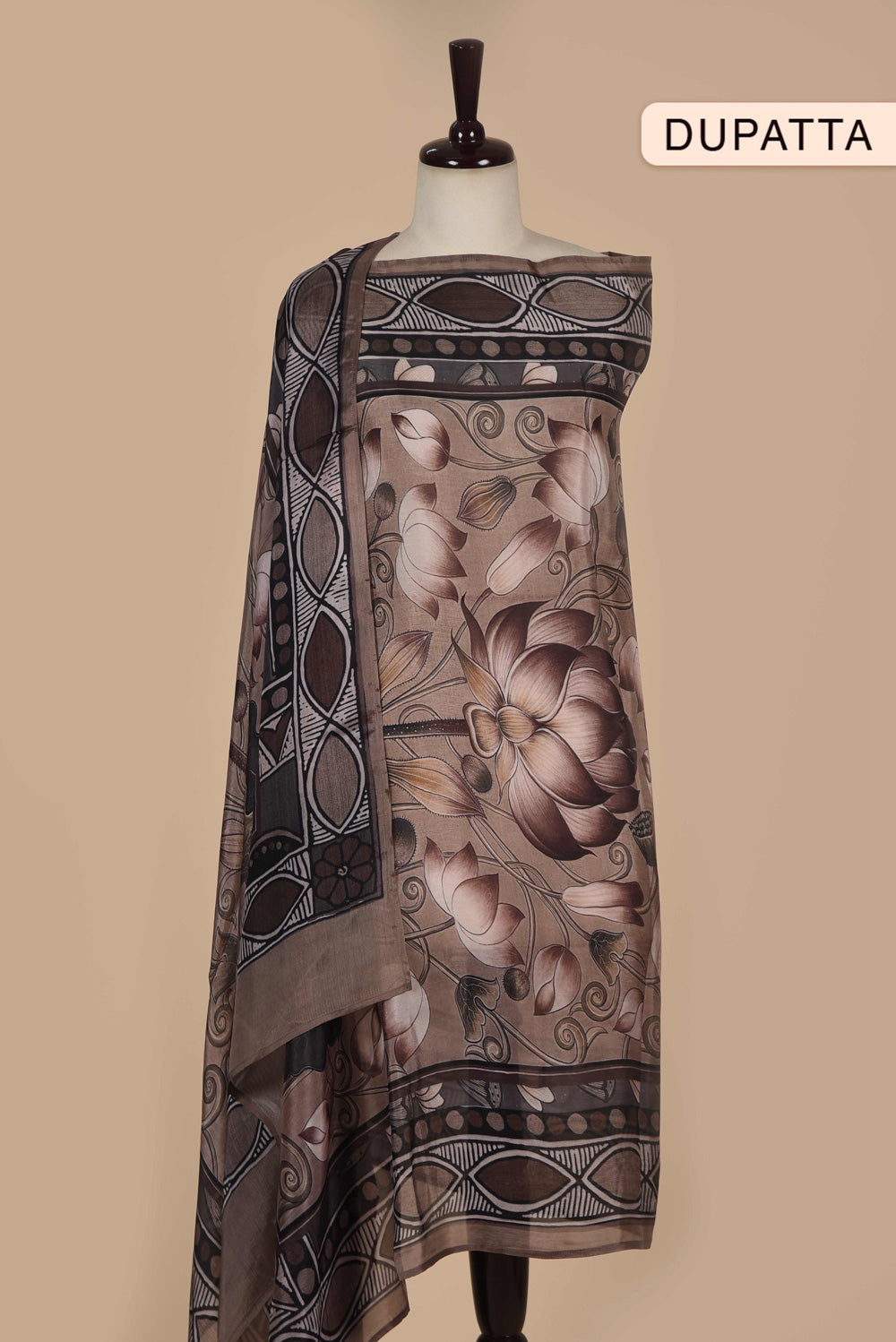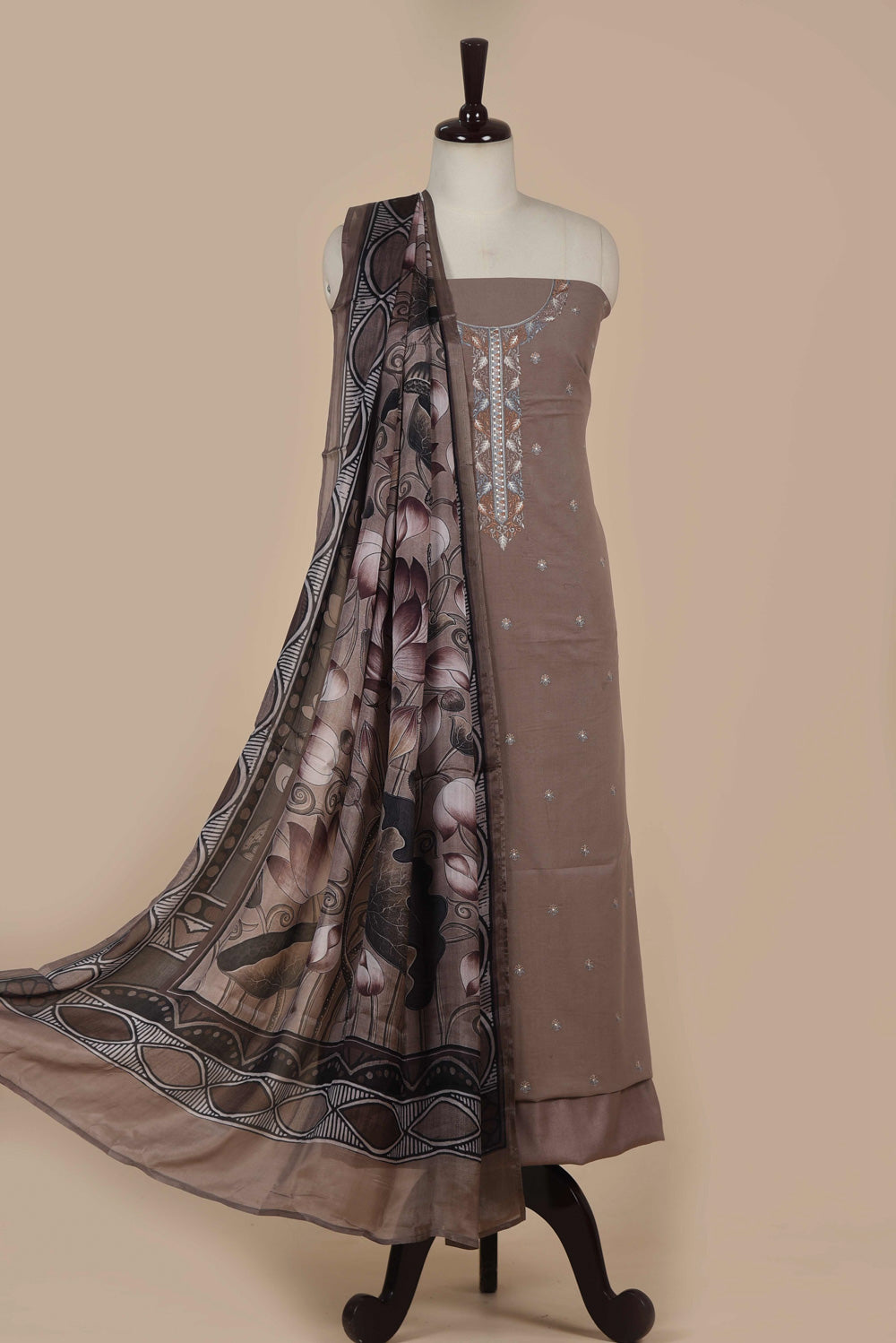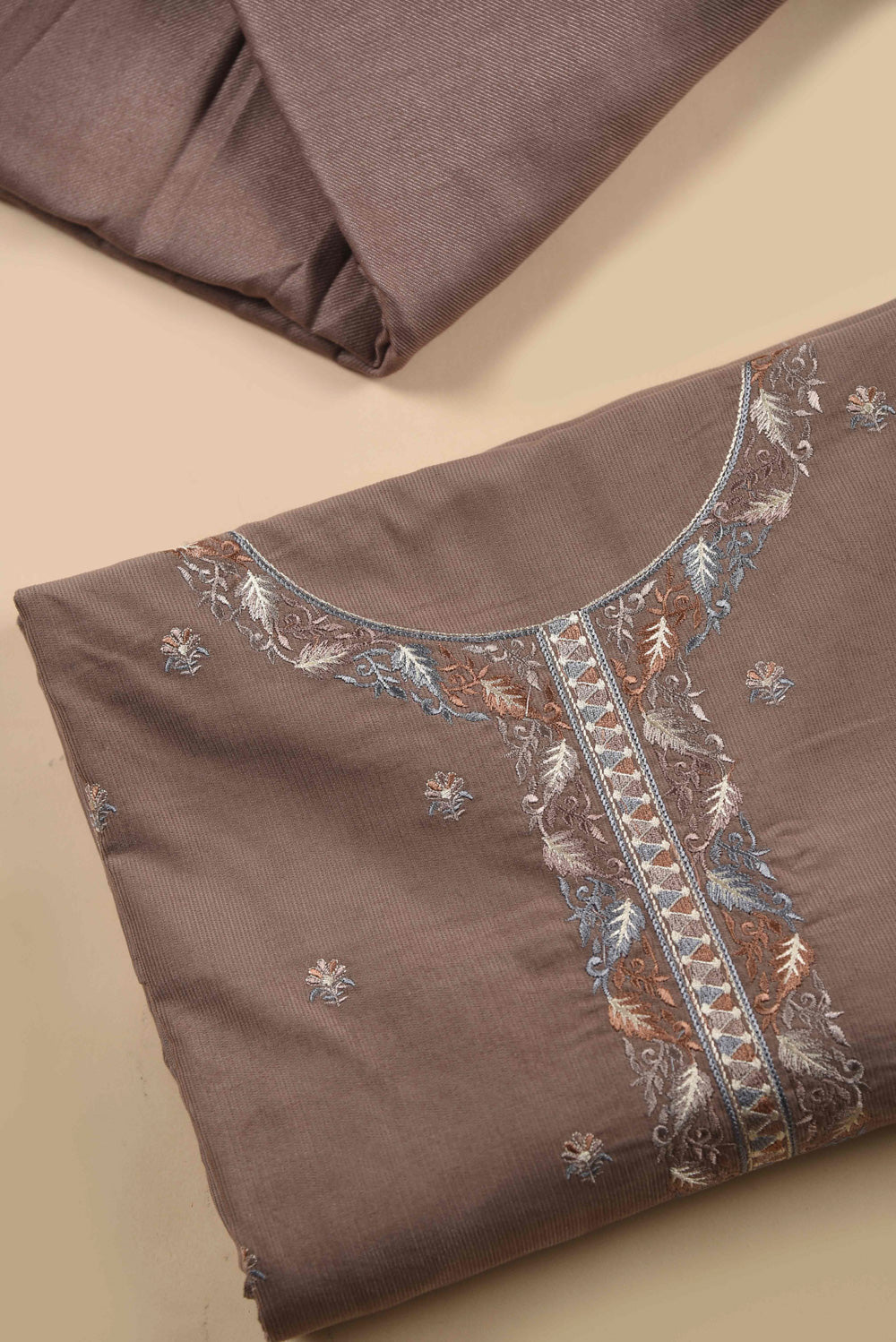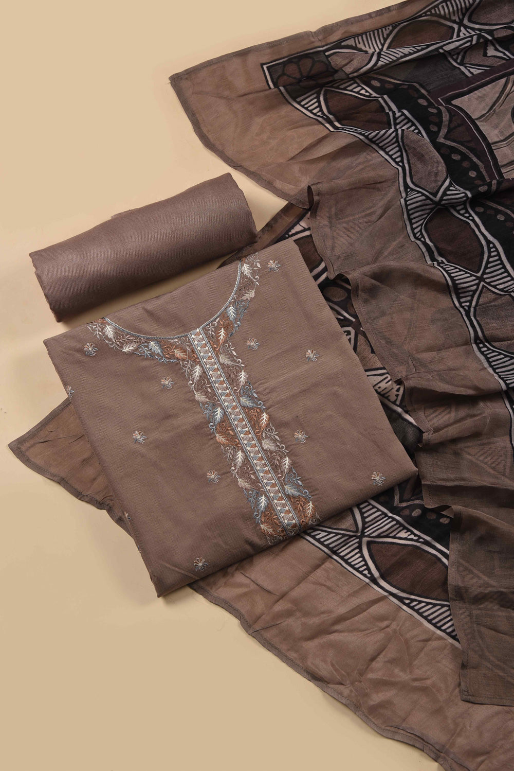 Brown Winter Wear Coudoury Embroidered Unstitched Suit Fabric Set With Muslin Printed Dupatta