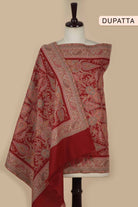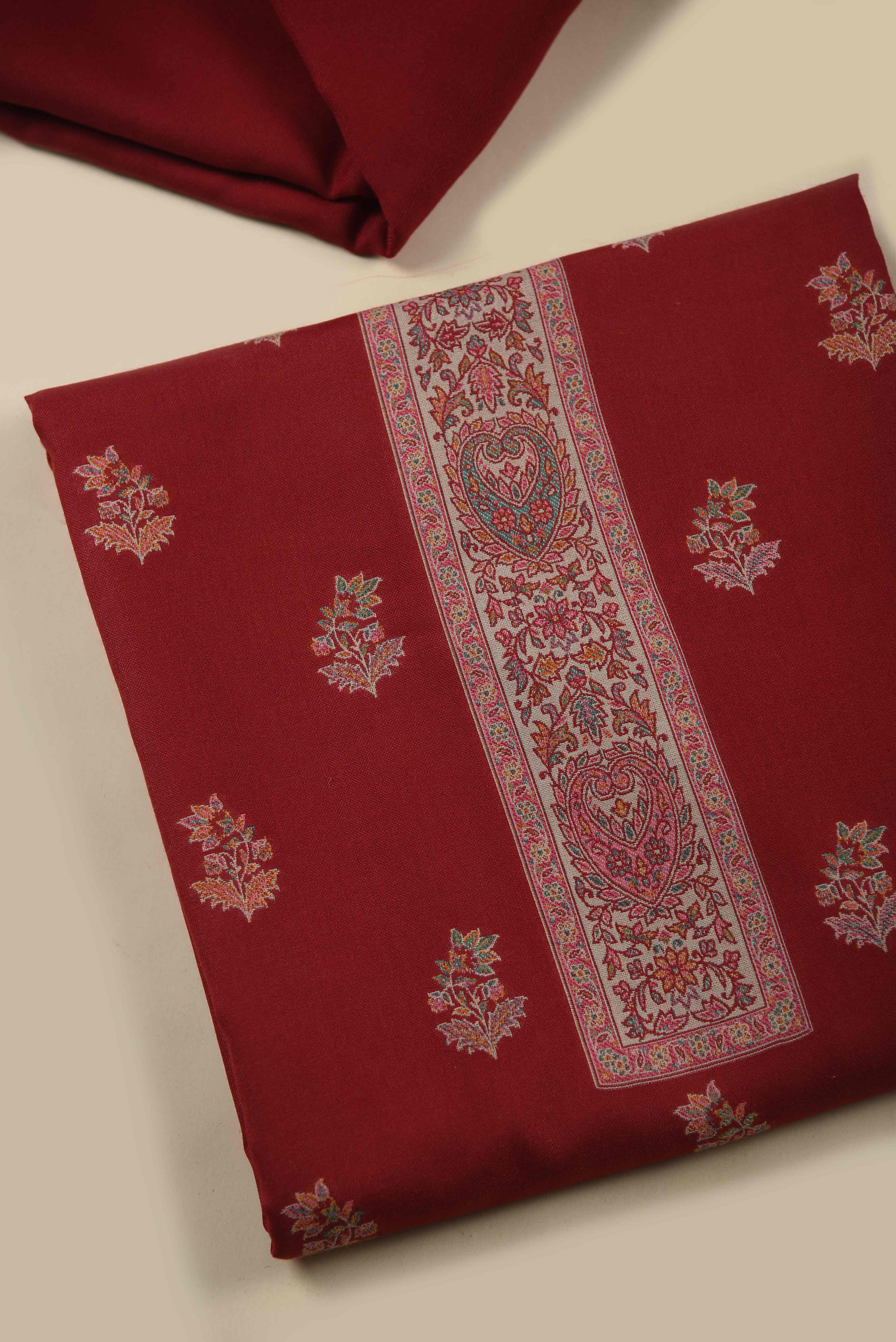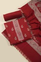 Red Winter Wear Jamdani Wool Spun Blend Unstitched Suit Fabric Set With Jamdani Wool Spun Blend Stole
