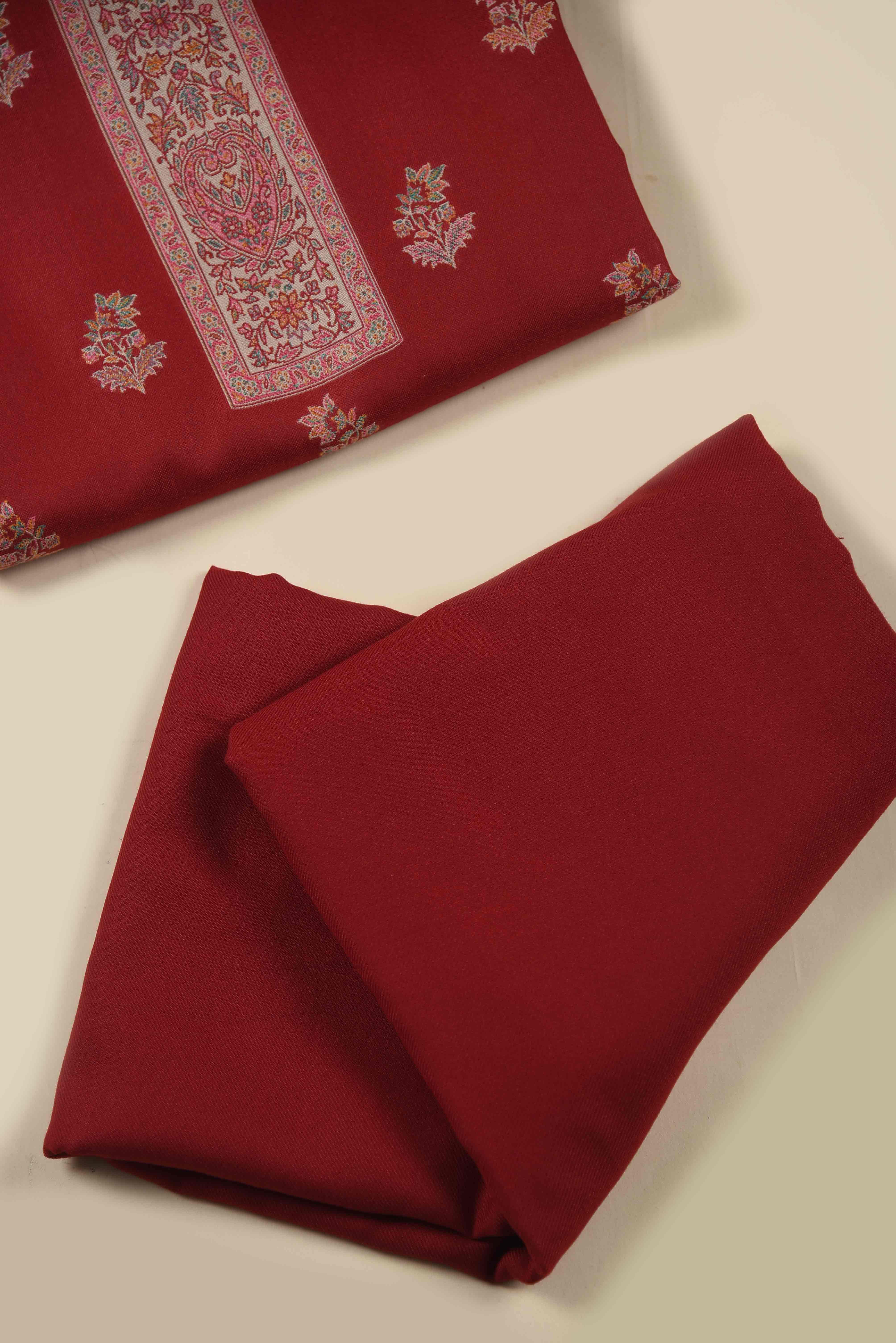 • Discover timeless elegance with this sophisticated Red Jamdani wool spun blend unstitched suit fabric set, expertly crafted for the discerning wearer.