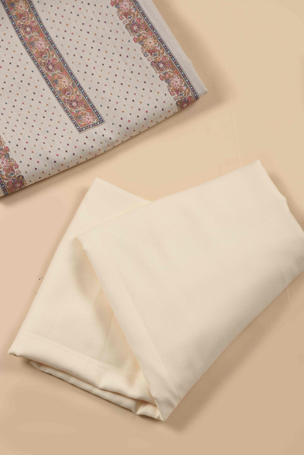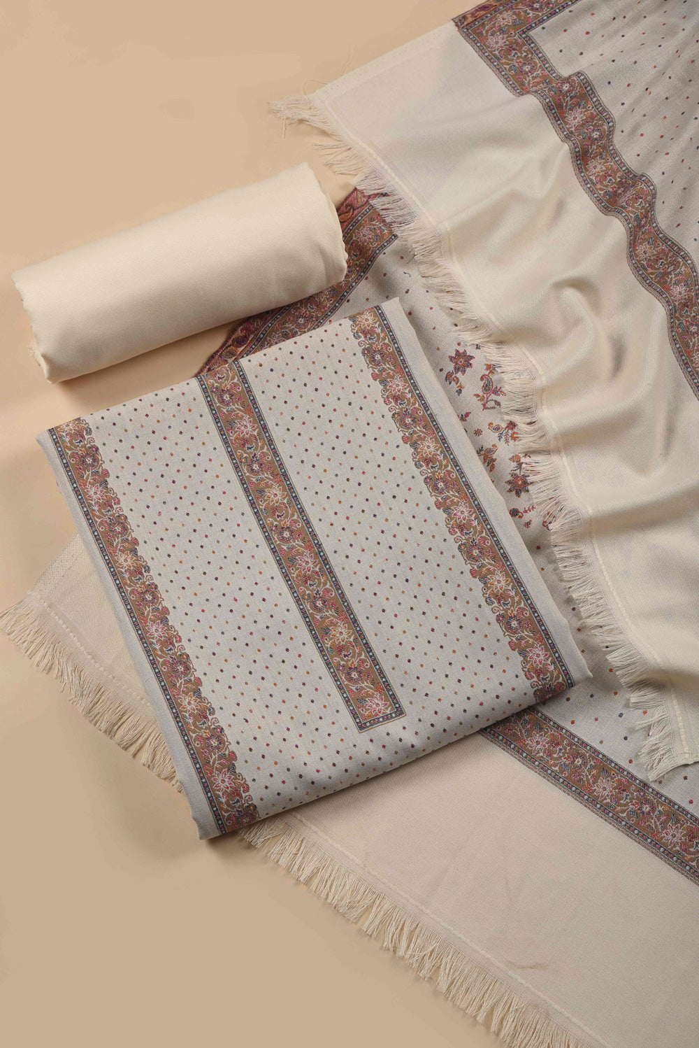 - Elevate your winter wardrobe with this exquisite Cream-hued Jamdaani unstitched suit fabric set, meticulously crafted from a refined wool-spun blend.