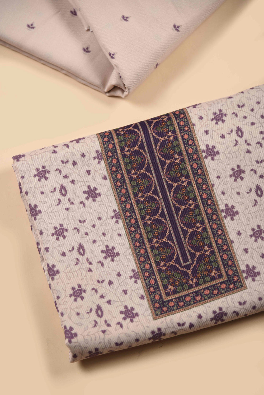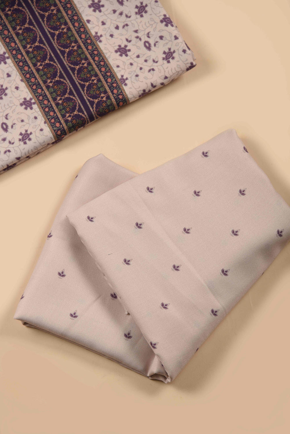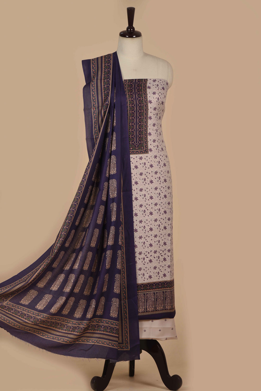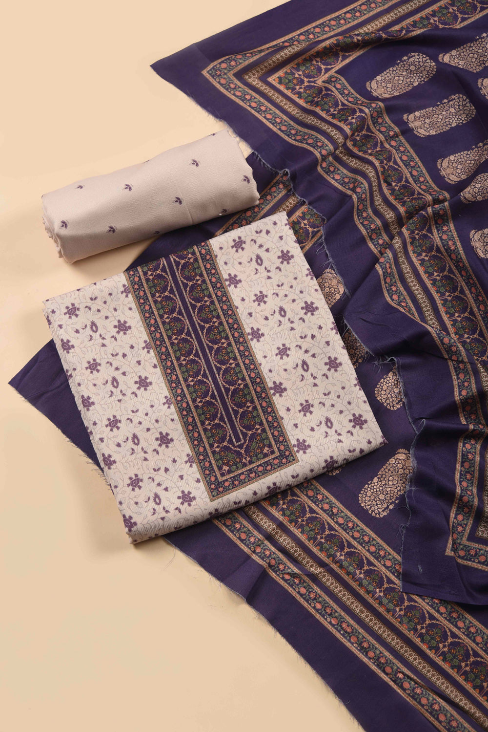 Cream With Purple Winter Wear Wool Spun Printed Unstitched Suit Fabric Set With Wool Blend Printed Dupatta