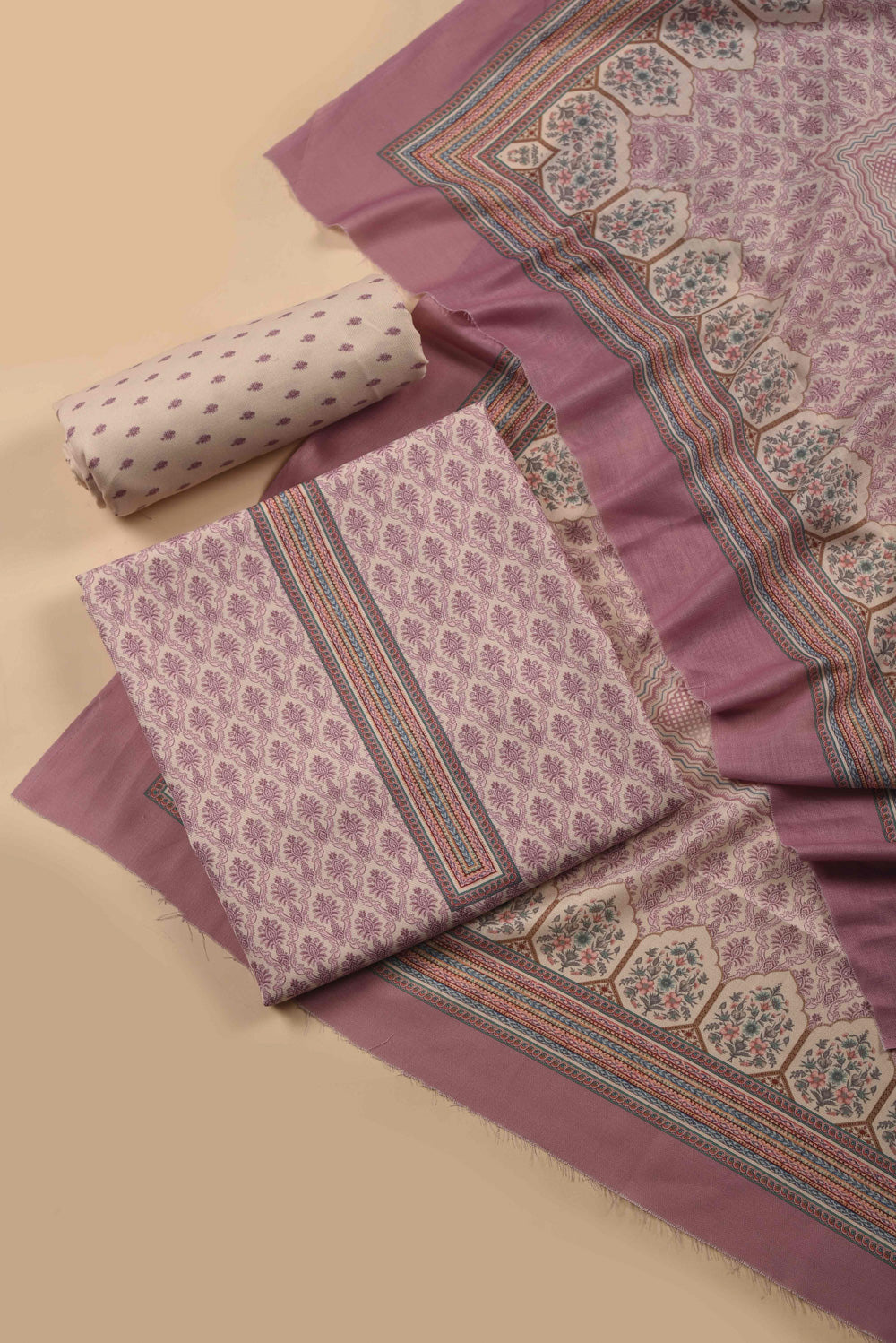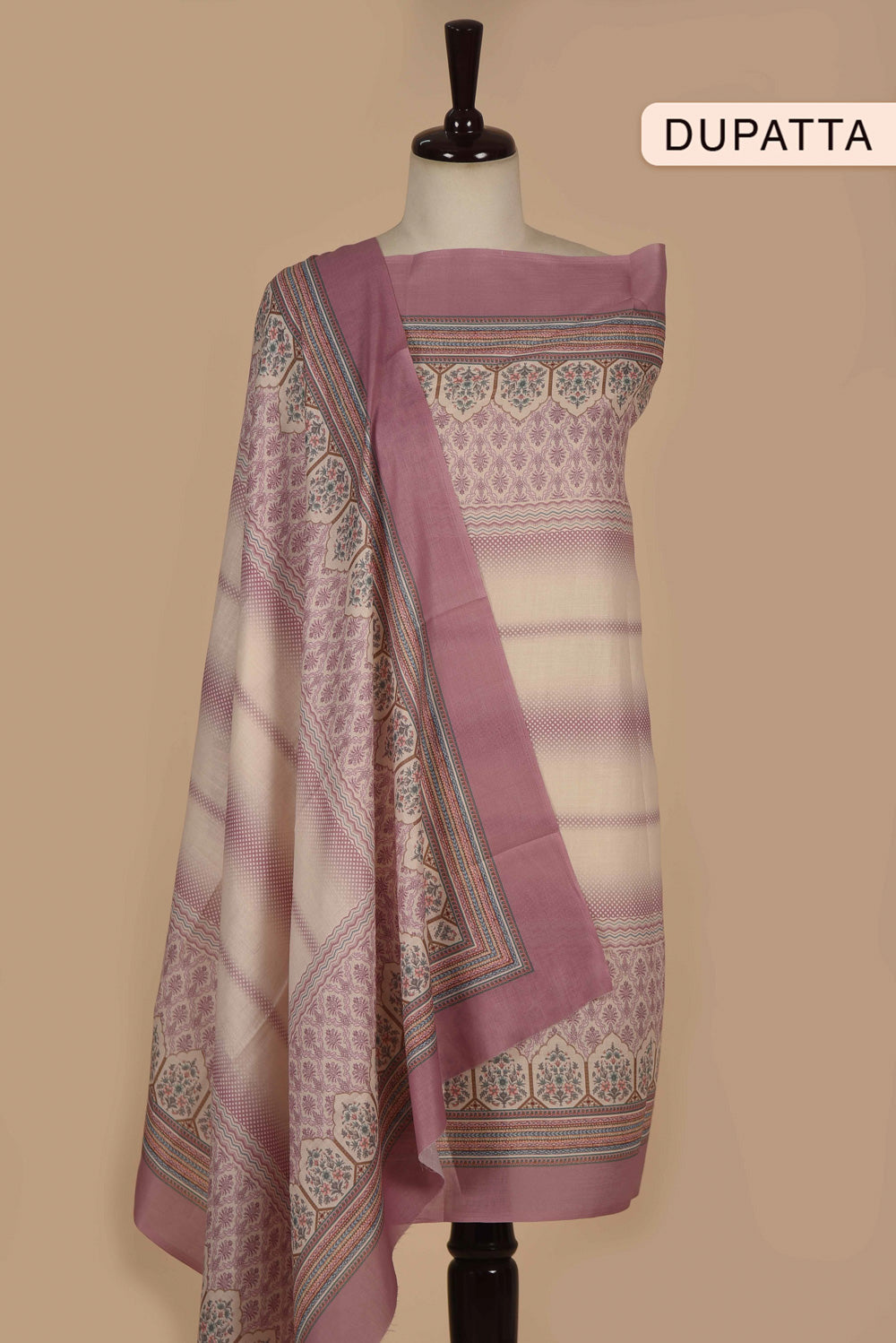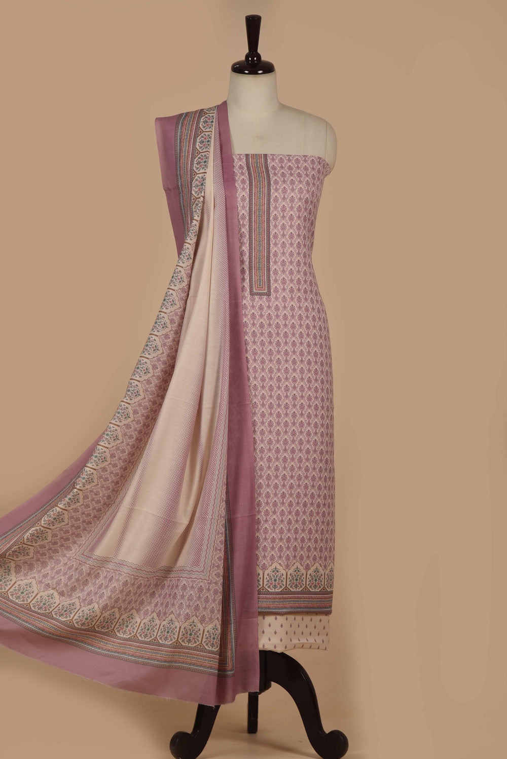 Cream With Mauve Winter Wear Wool Spun Printed Unstitched Suit Fabric Set With Wool Blend Printed Dupatta