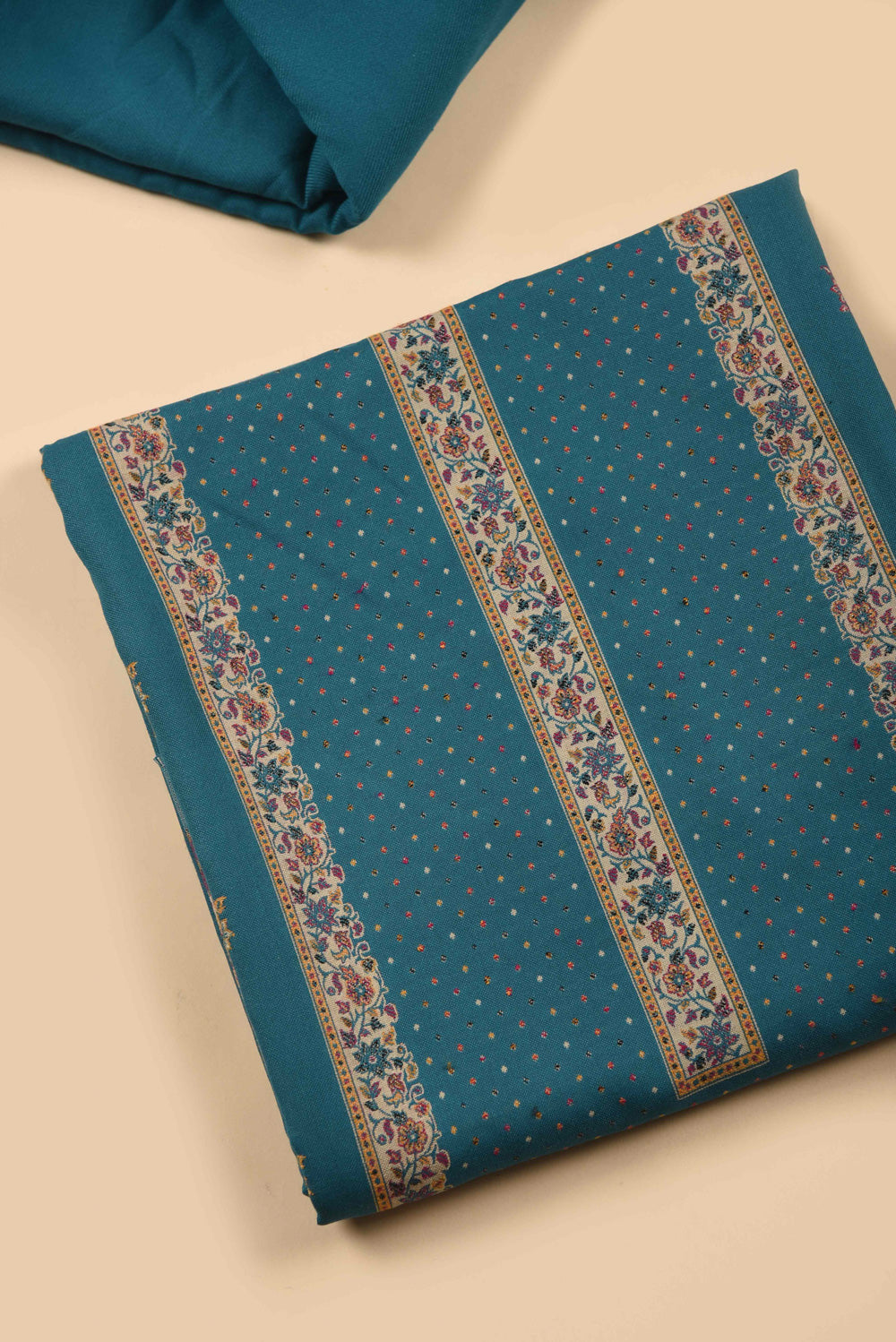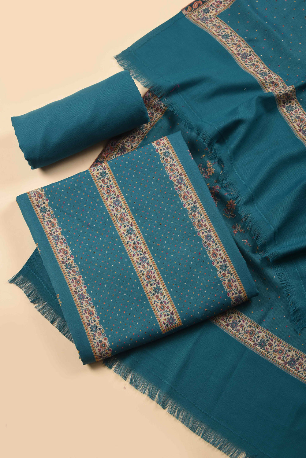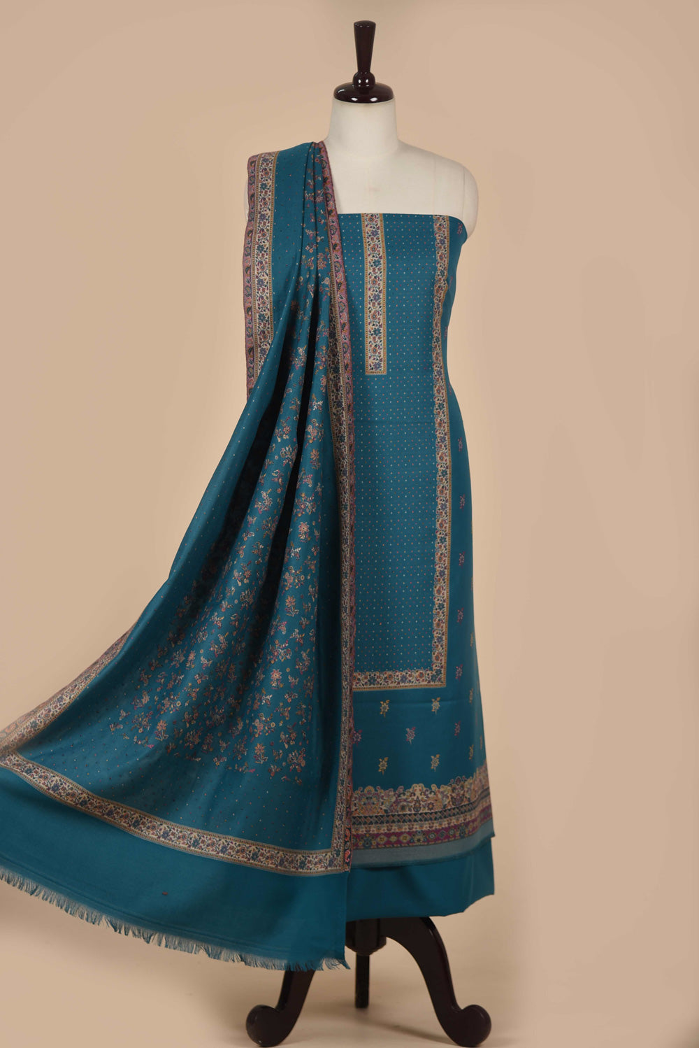 - Elevate your winter wardrobe with this exquisite Turquoise-hued Jamdaani unstitched suit fabric set, meticulously crafted from a refined wool-spun blend.