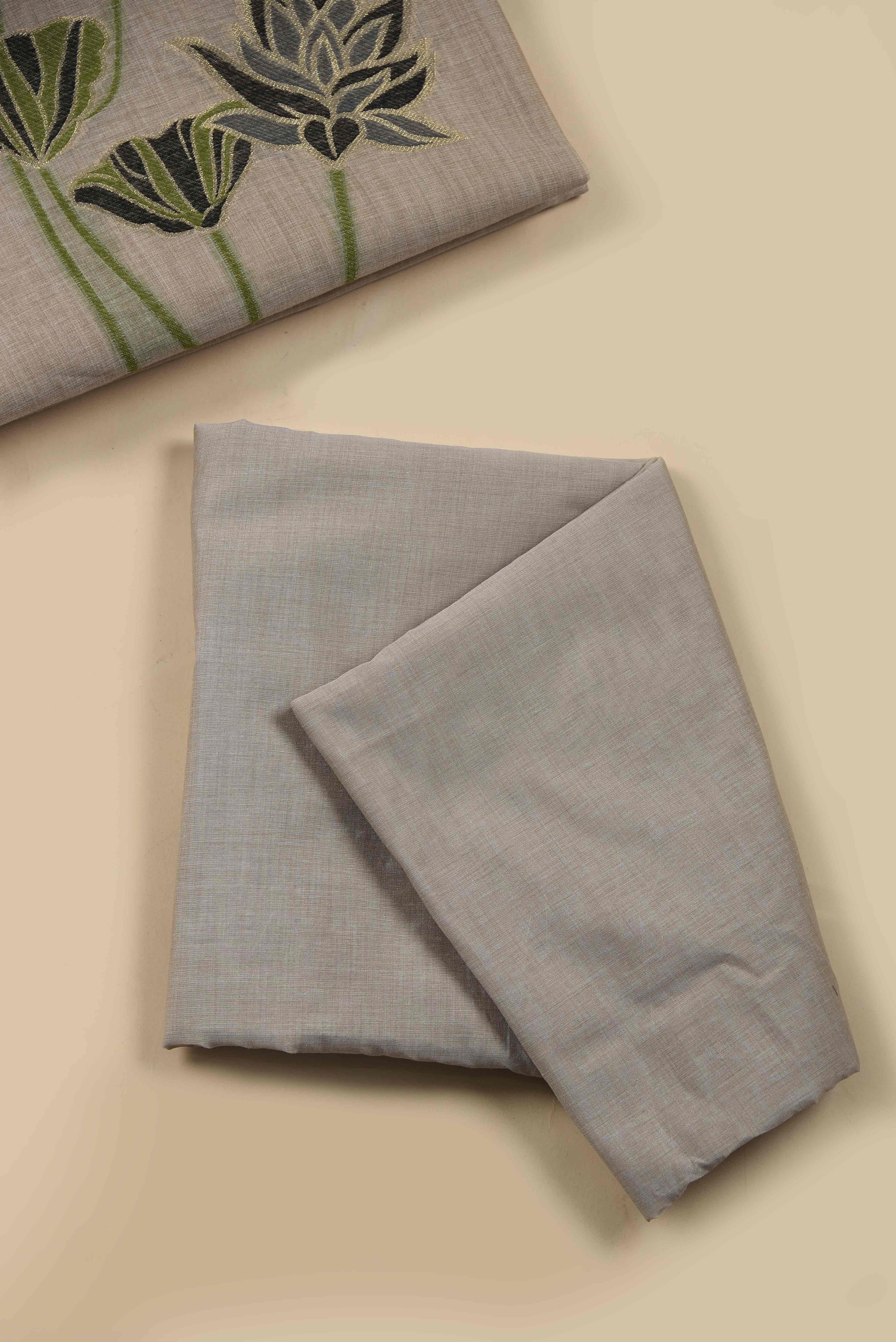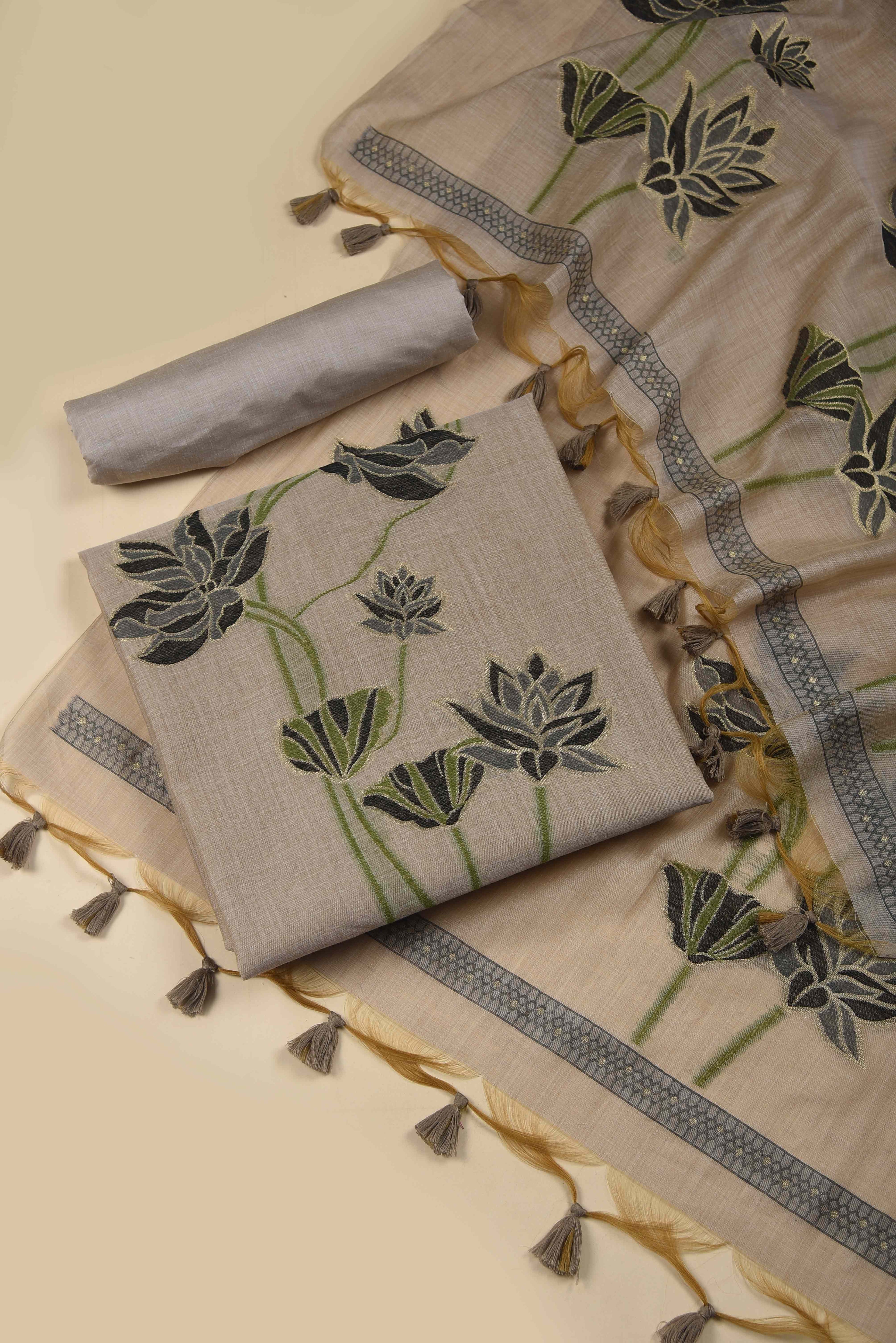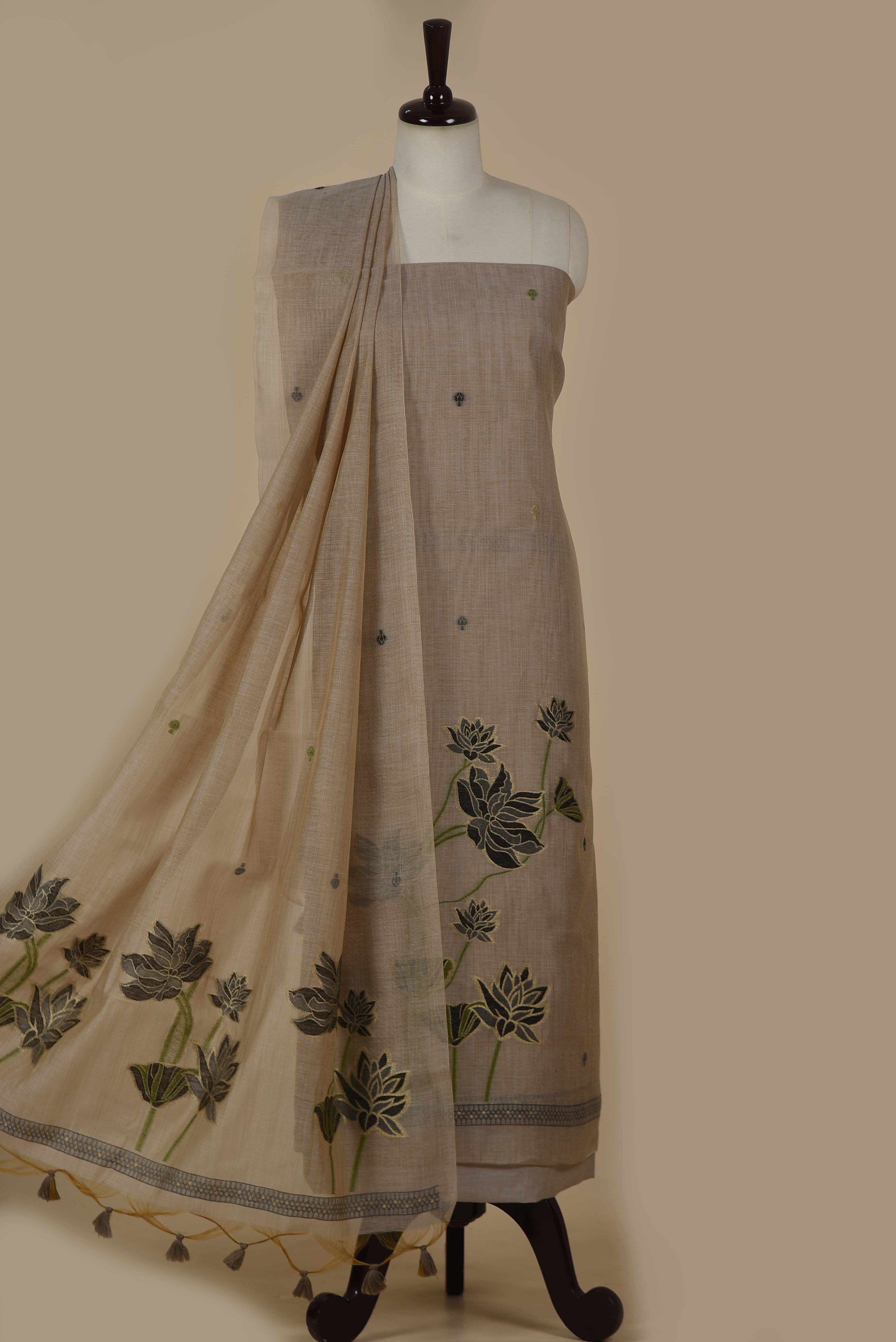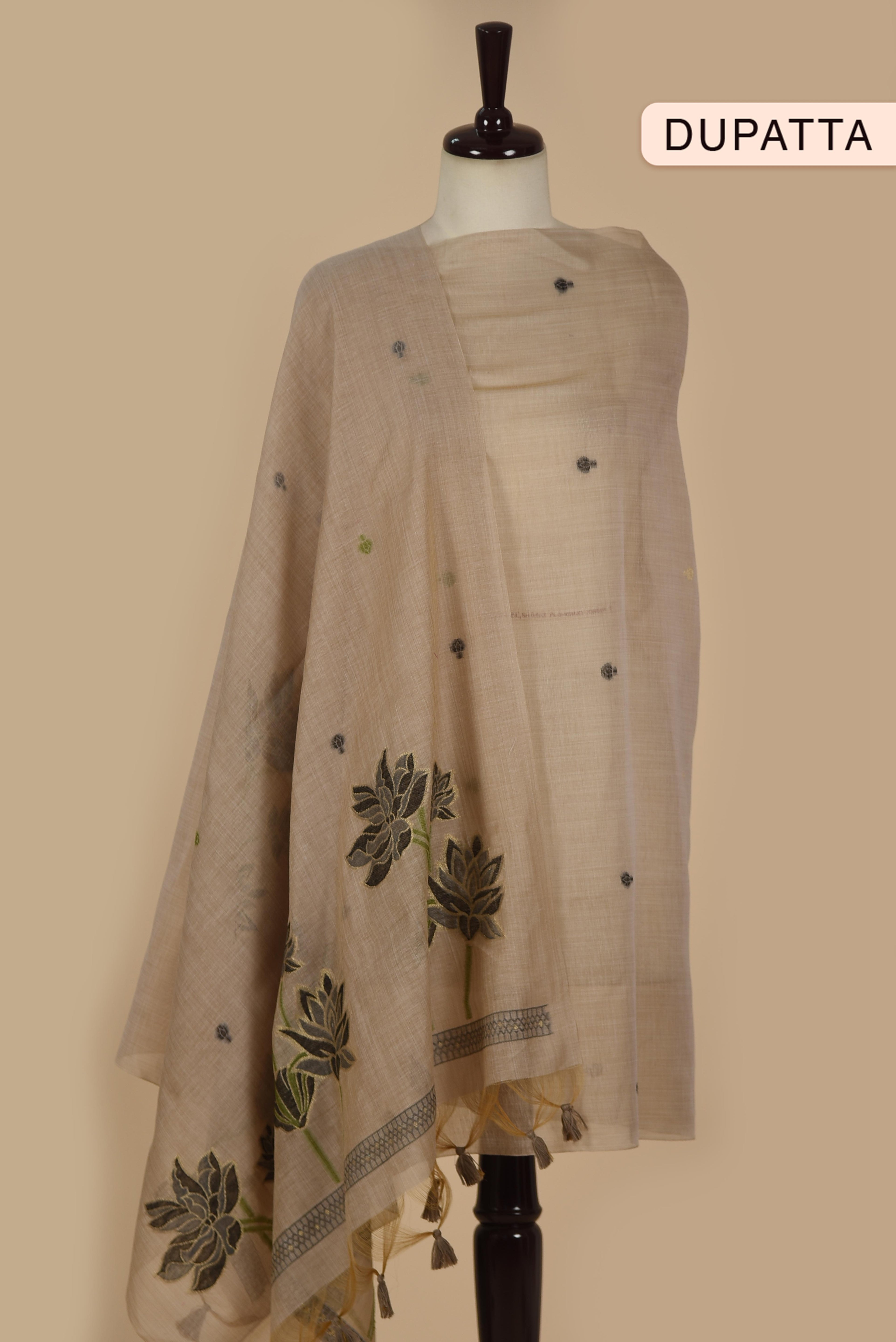 • Experience the timeless elegance of this Beige Chanderi Jamdani unstitched suit fabric set, featuring a finely woven Chanderi dupatta.