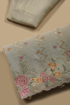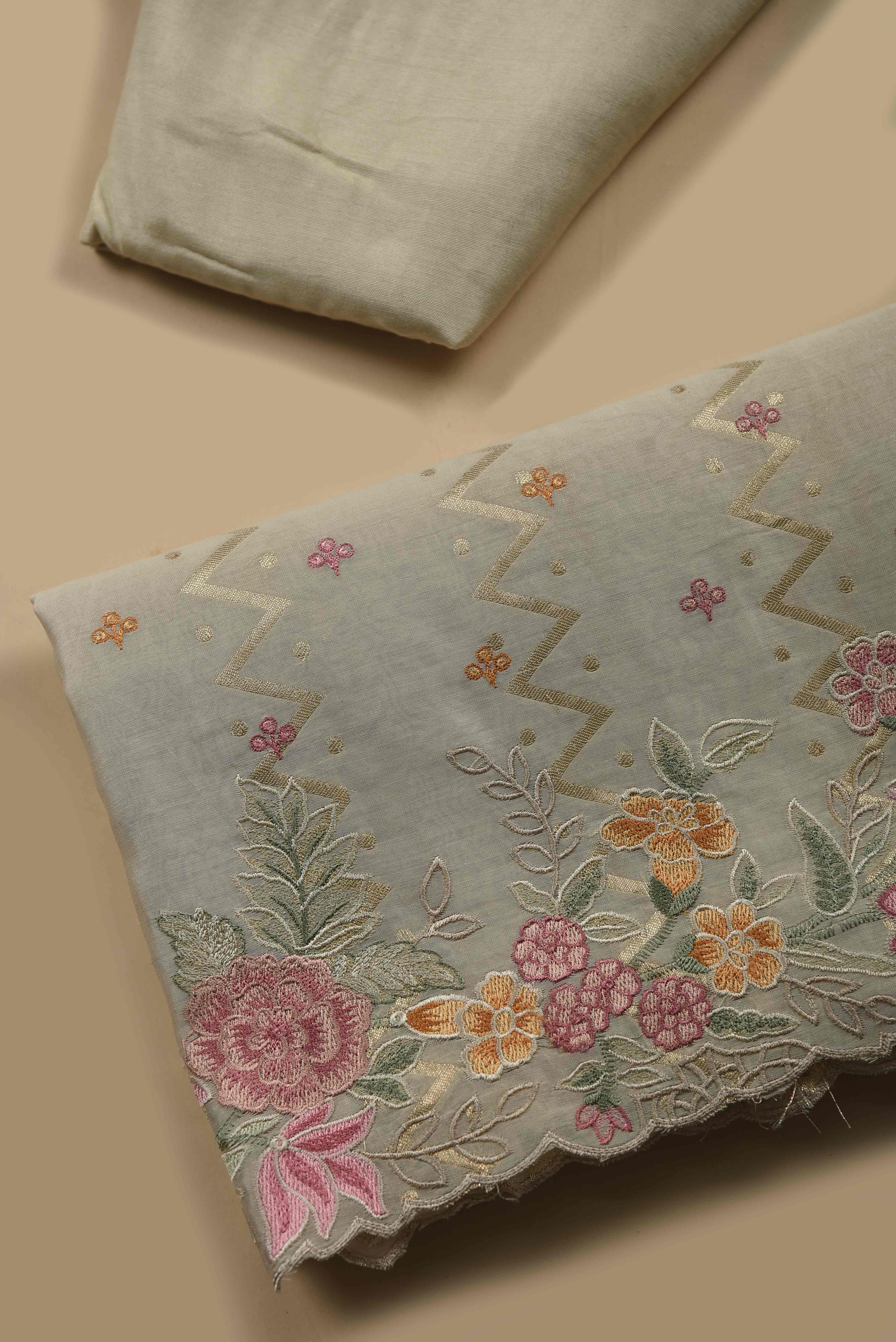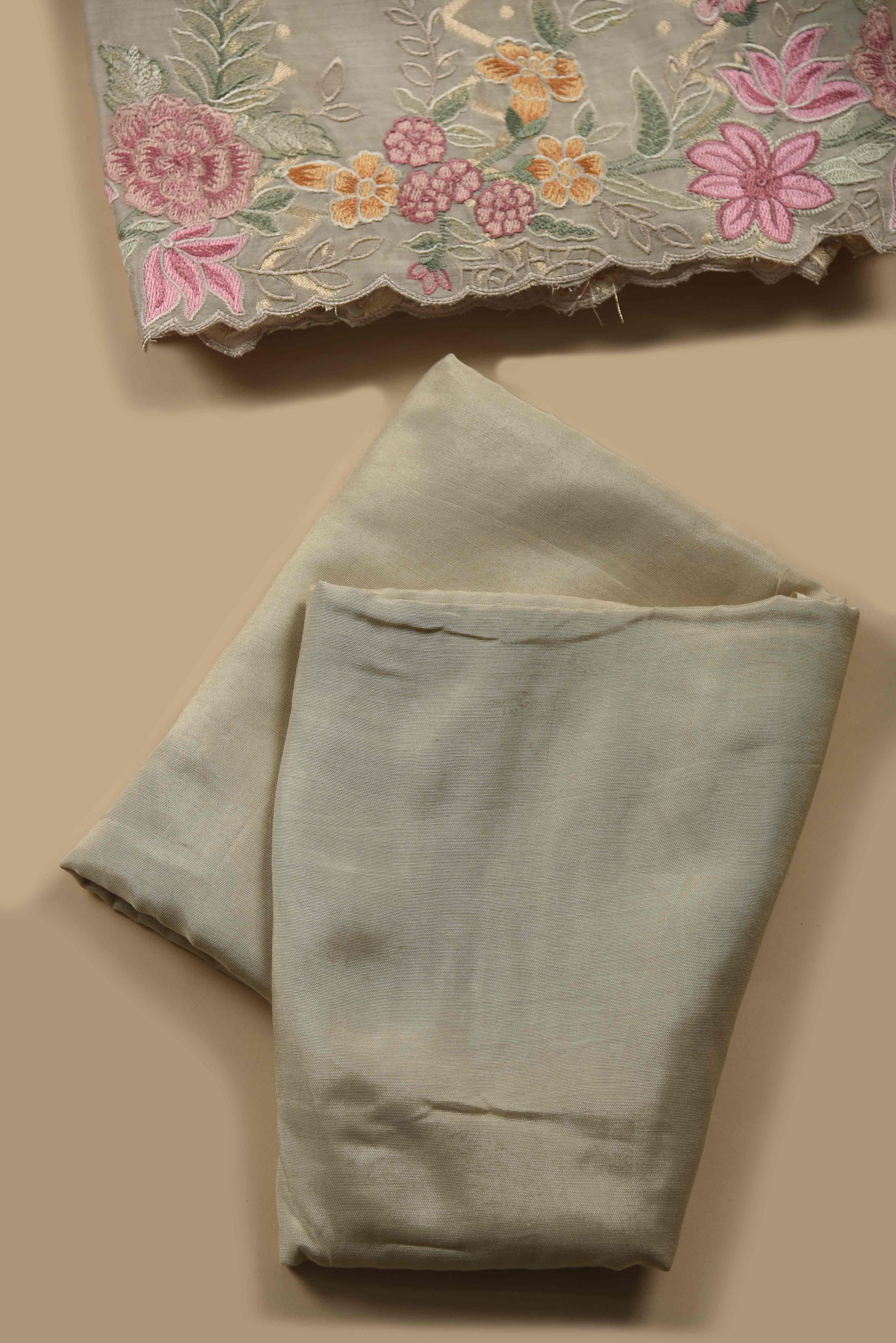 Elevate your festive wardrobe with this Beige Chanderi Silk Suit Fabric Set, featuring finely woven patterns and exquisite embroidery.