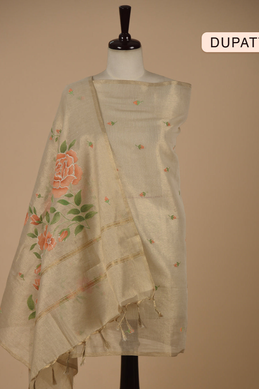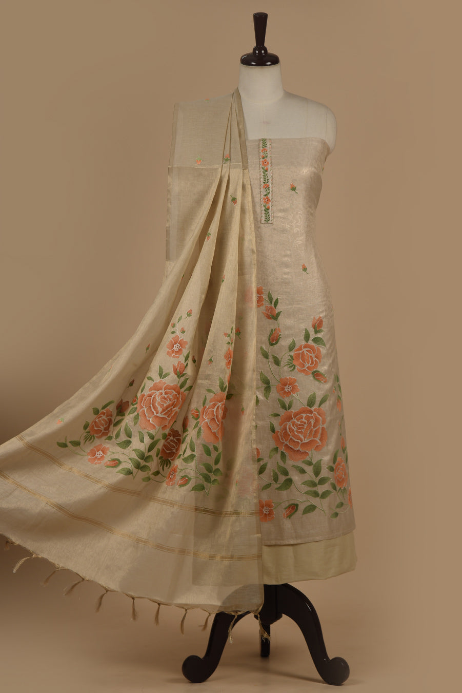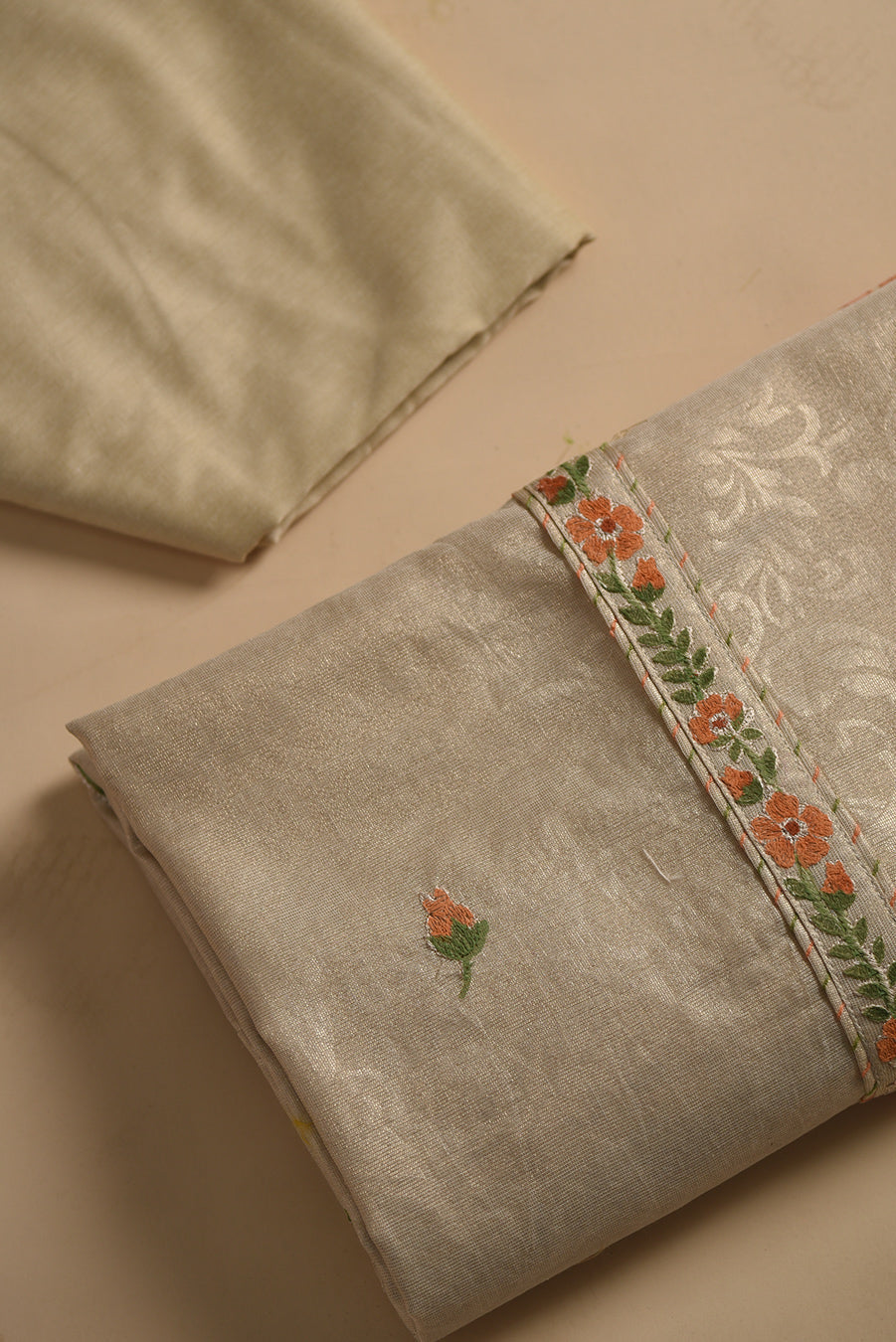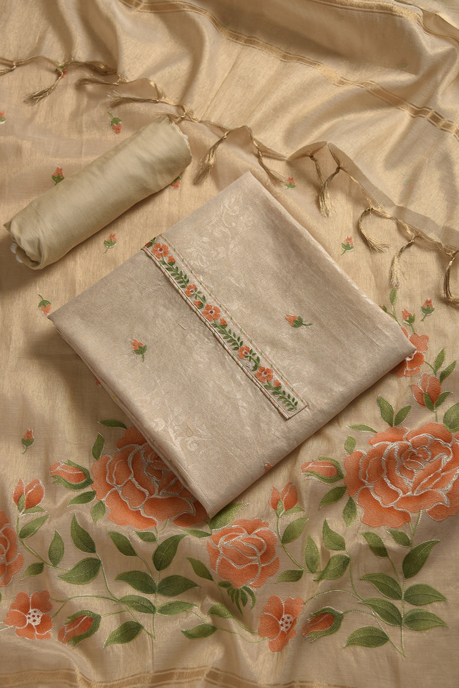 This beige Chanderi tissue blend unstitched suit fabric set with a Chanderi tissue dupatta is the epitome of elegance and class.