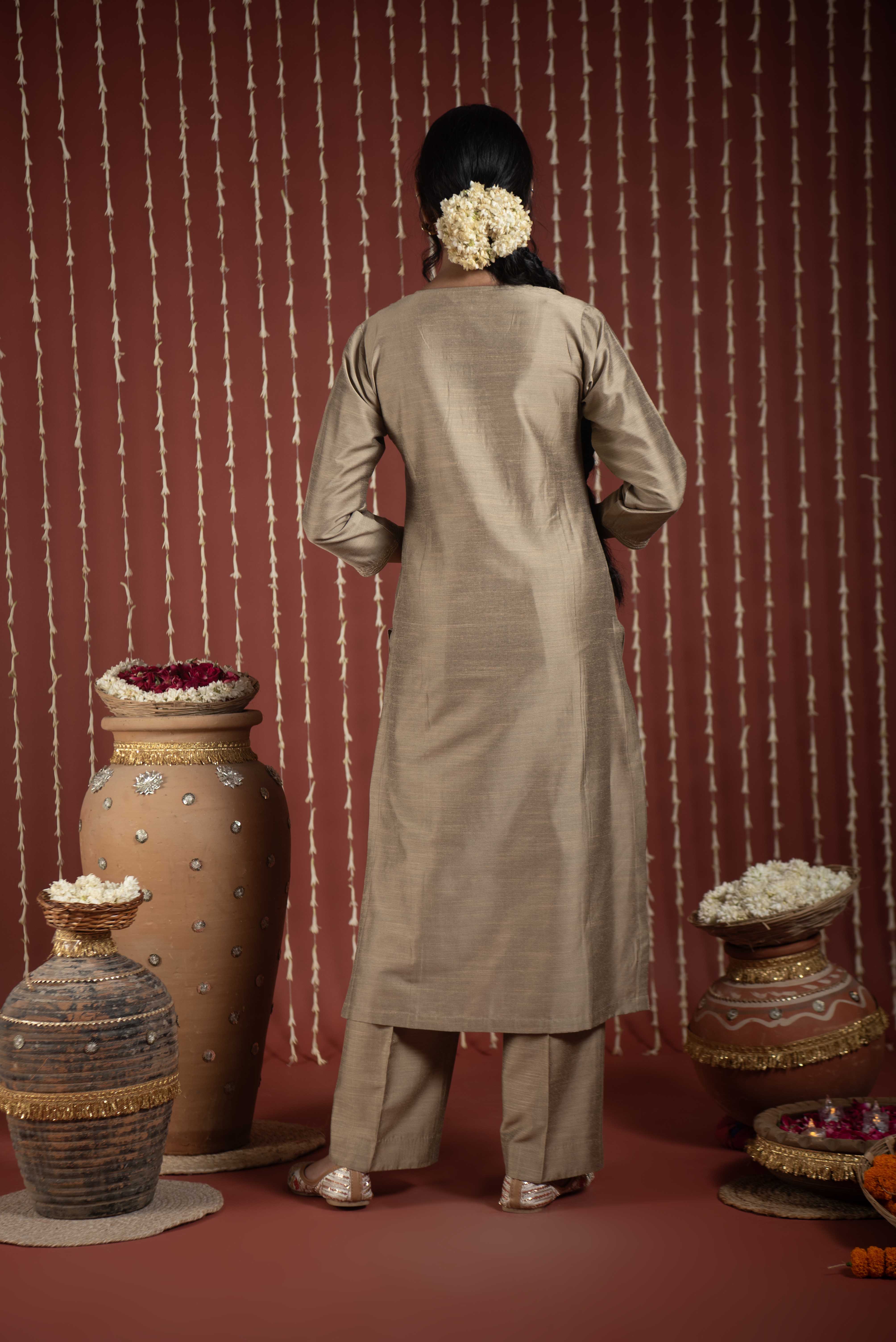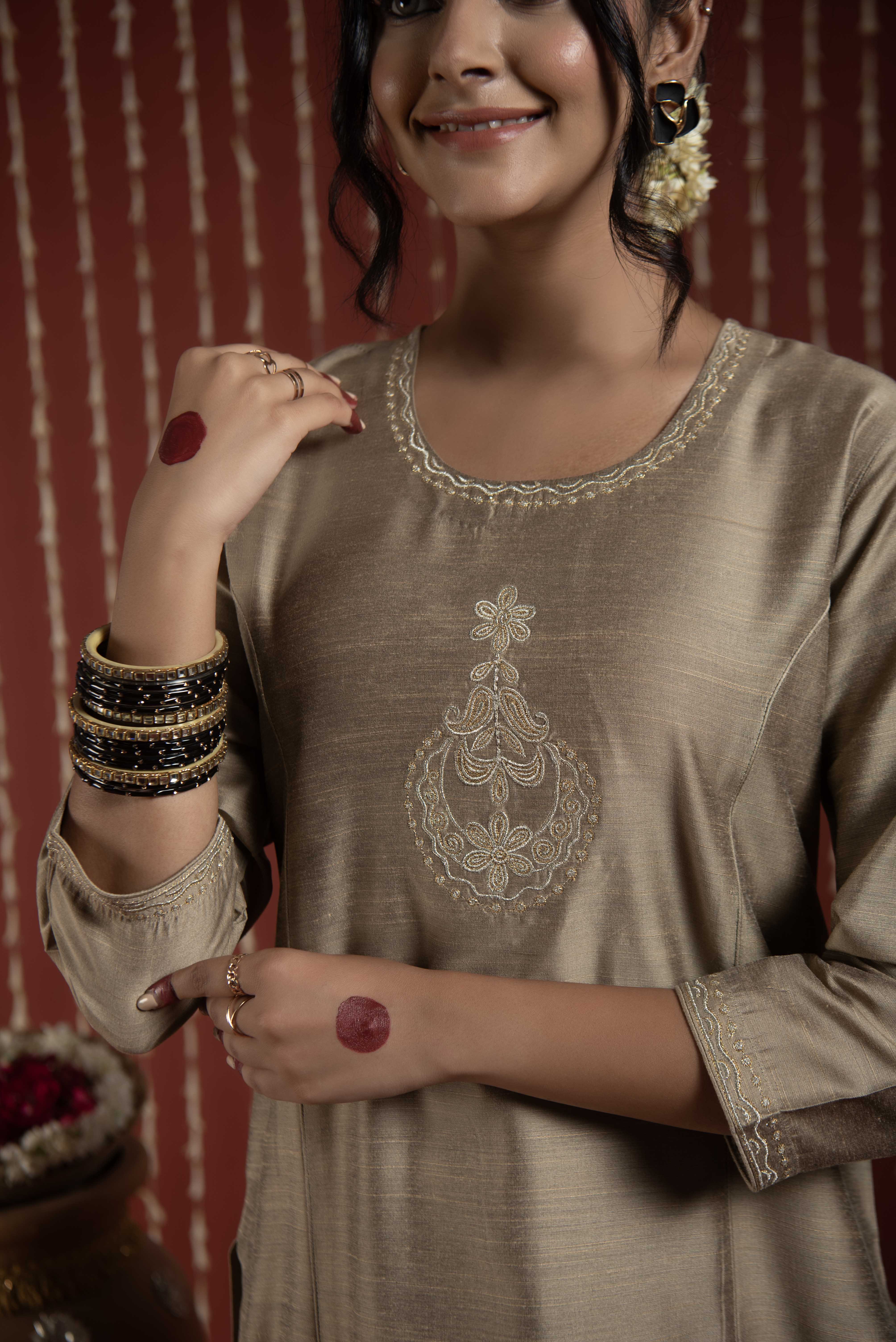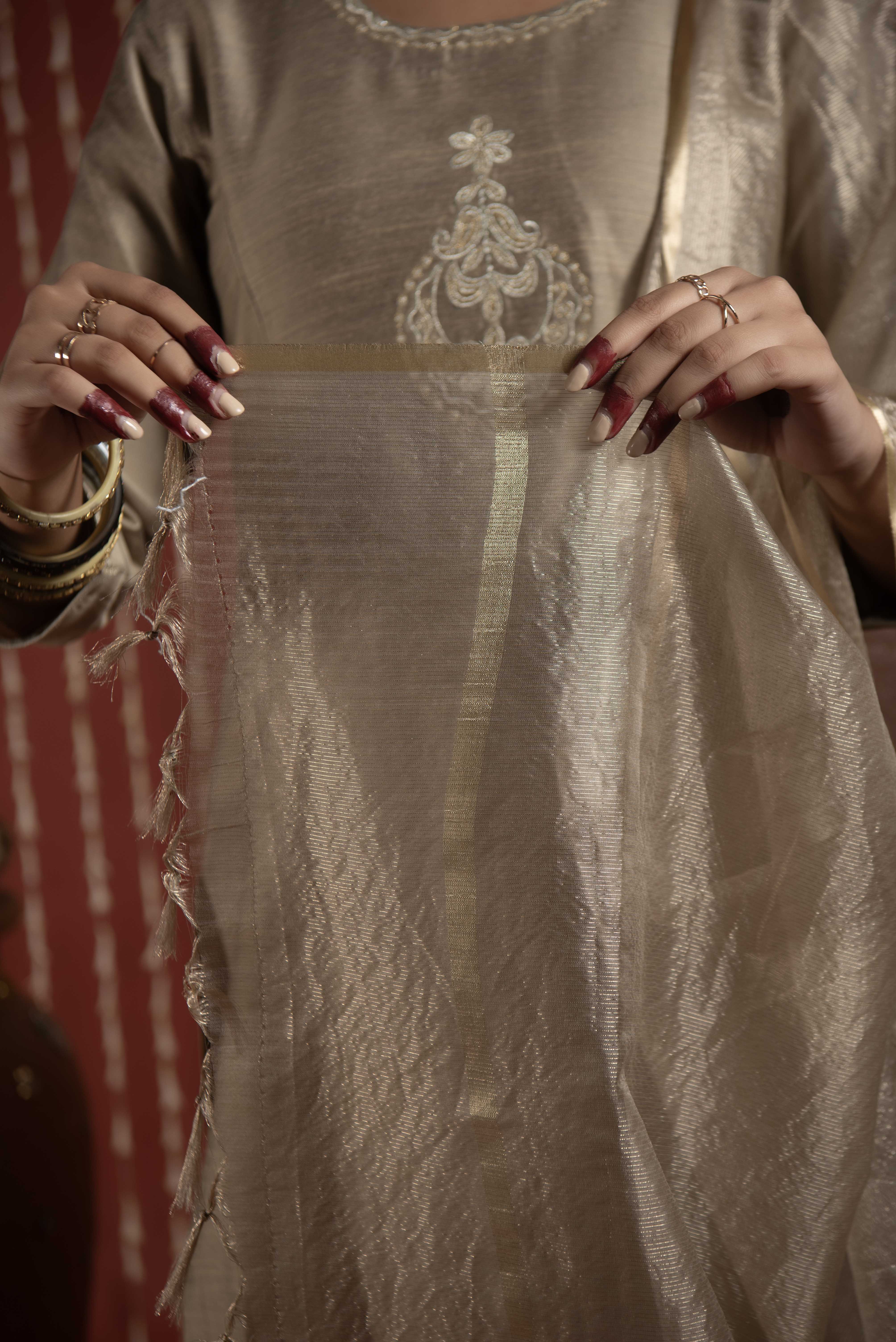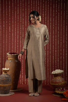 Beige Cotton Silk Front Boota Zari Work Kurta Set Regular Fit
