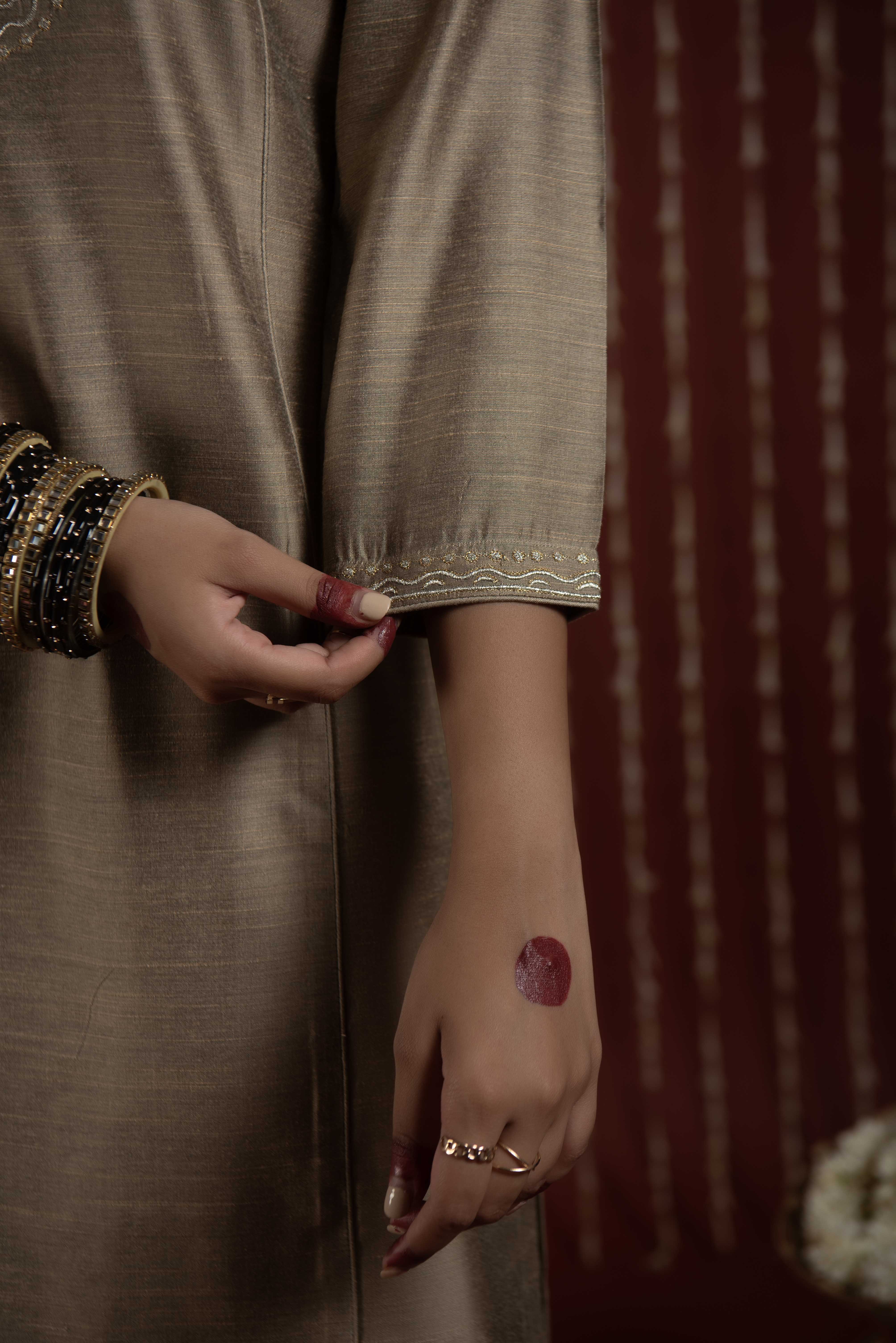 - It features a round neckline adorned with delicate zari embroidery, complemented by royal zari motifs on the kurta that enhance its festive charm.