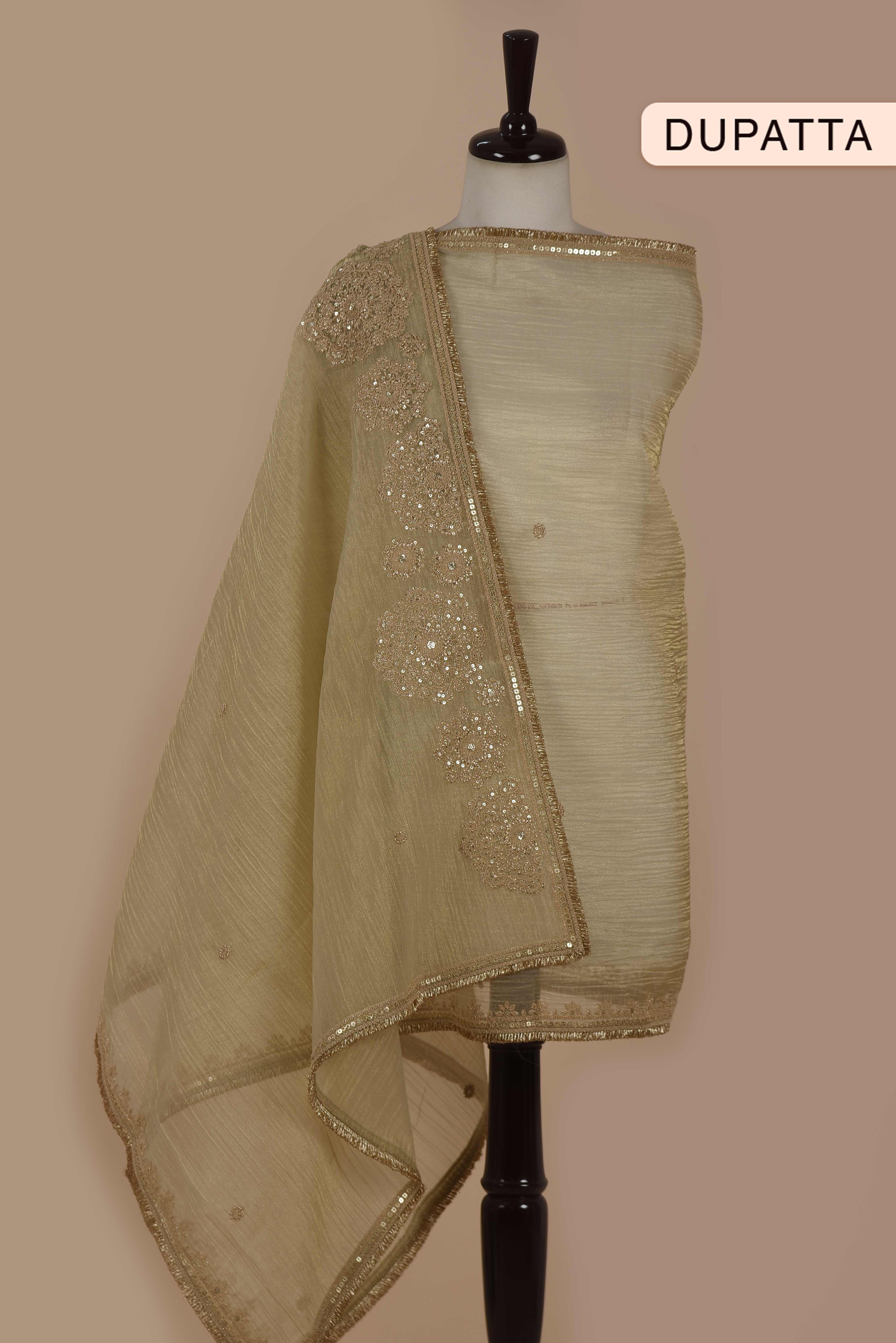 - The kurta fabric is enriched with subtle golden weaves that create a natural, luminous shimmer, while delicate zari and sequin embroidery along the neckline and hem add a touch of refined artistry. Paired with a crushed shimmer silk dupatta, beautifully highlighted with intricate zari embroidery, the ensemble radiates festive allure and luxurious depth. Perfect for formal gatherings, festive soirees, or elegant evening affairs, this set harmonizes opulent texture with traditional craftsmanship—making it a true statement of sophistication.