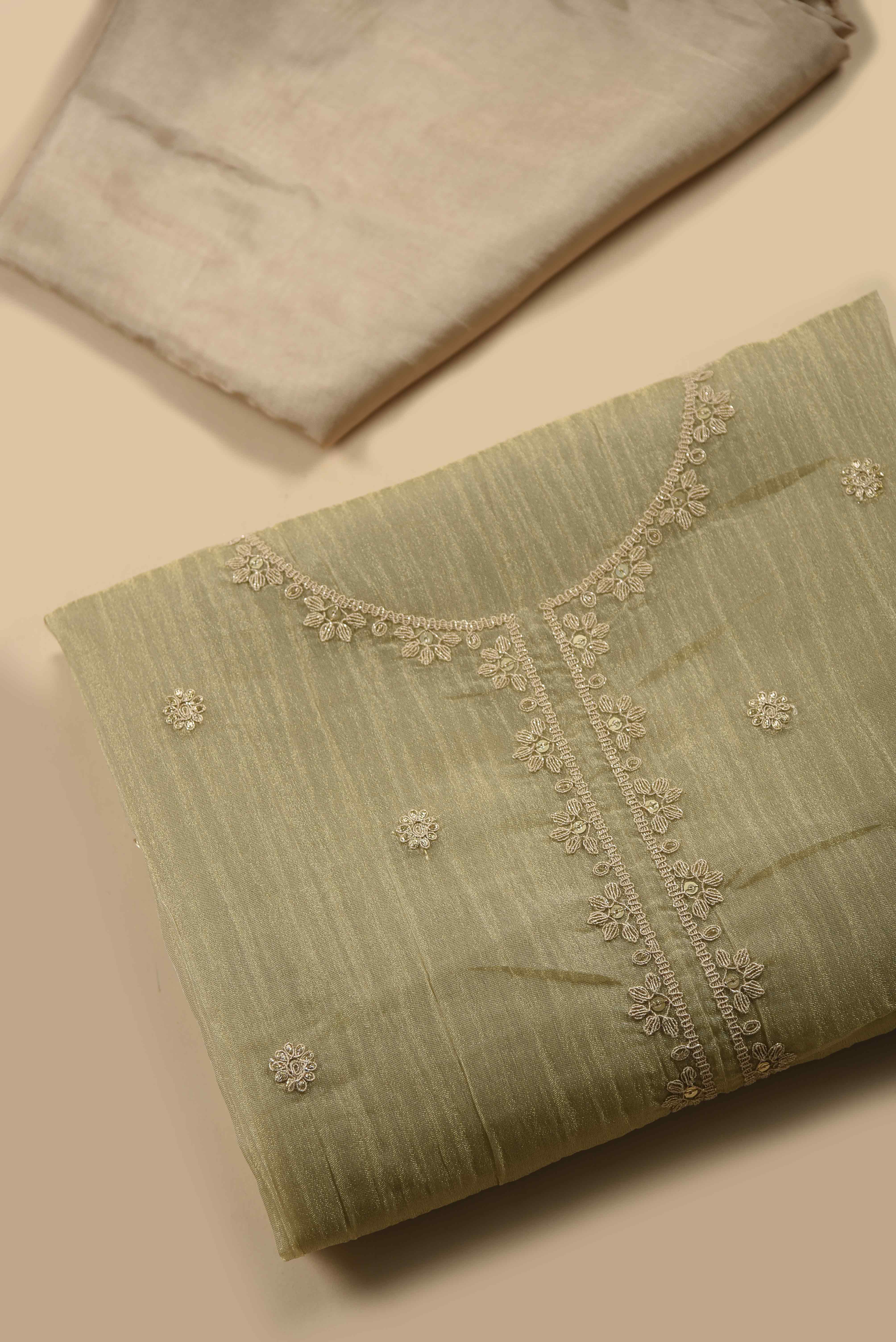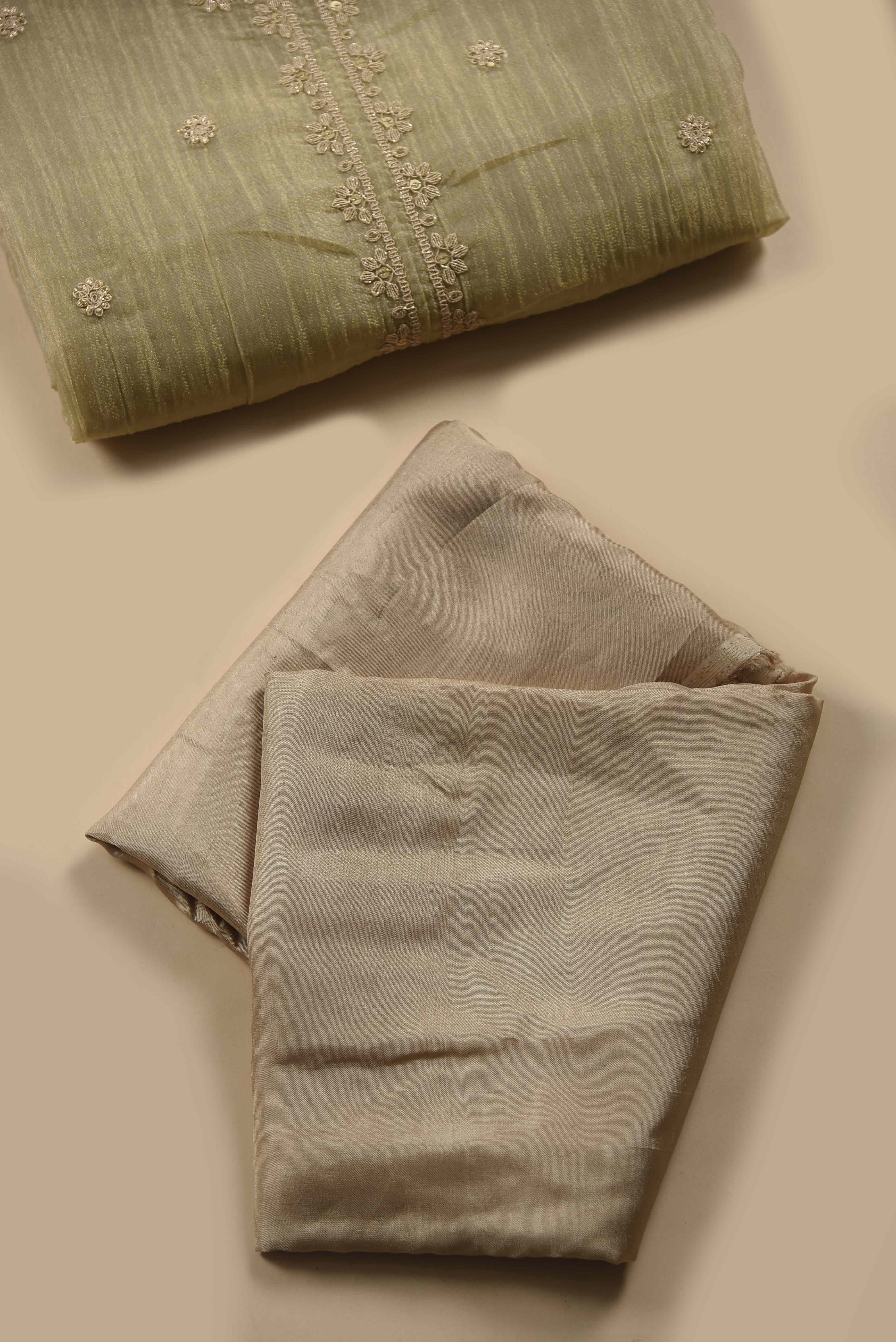 - Beige Crushed Silk Viscose Embroidered Unstitched Suit Fabric Set with Shimmer Silk Dupatta Drape yourself in understated elegance with our Beige Crushed Silk Viscose Unstitched Suit Fabric Set, crafted to exude grace and timeless charm.